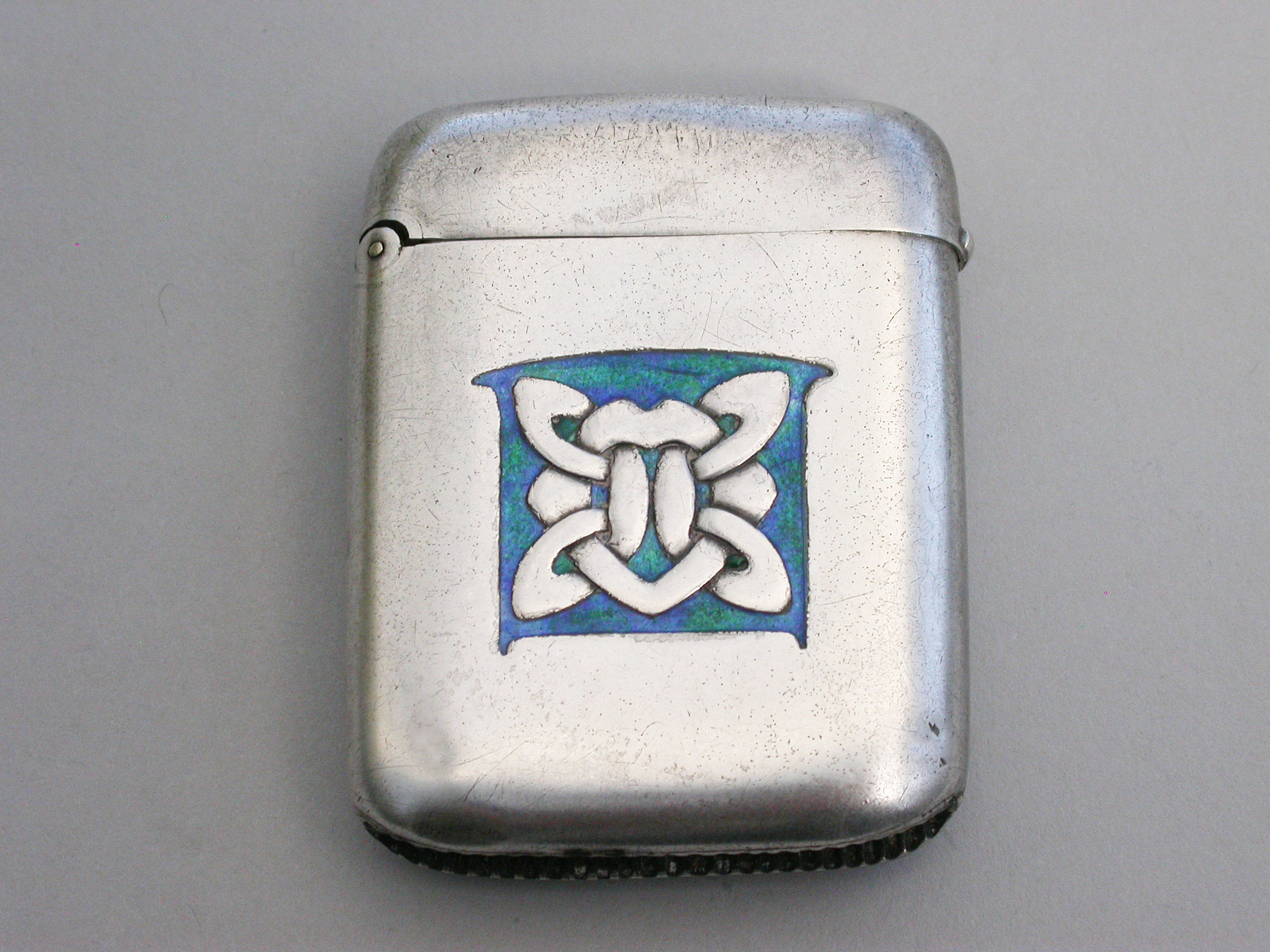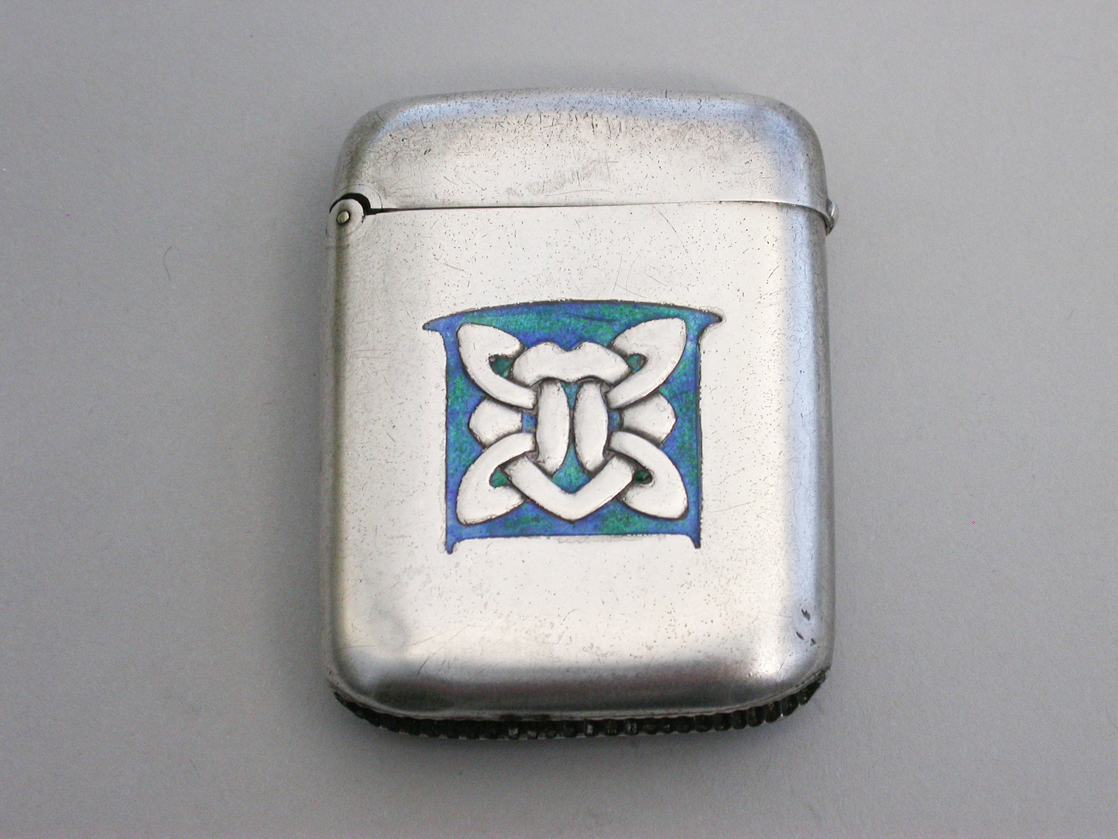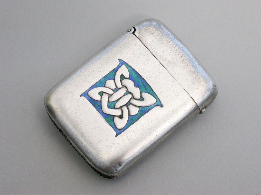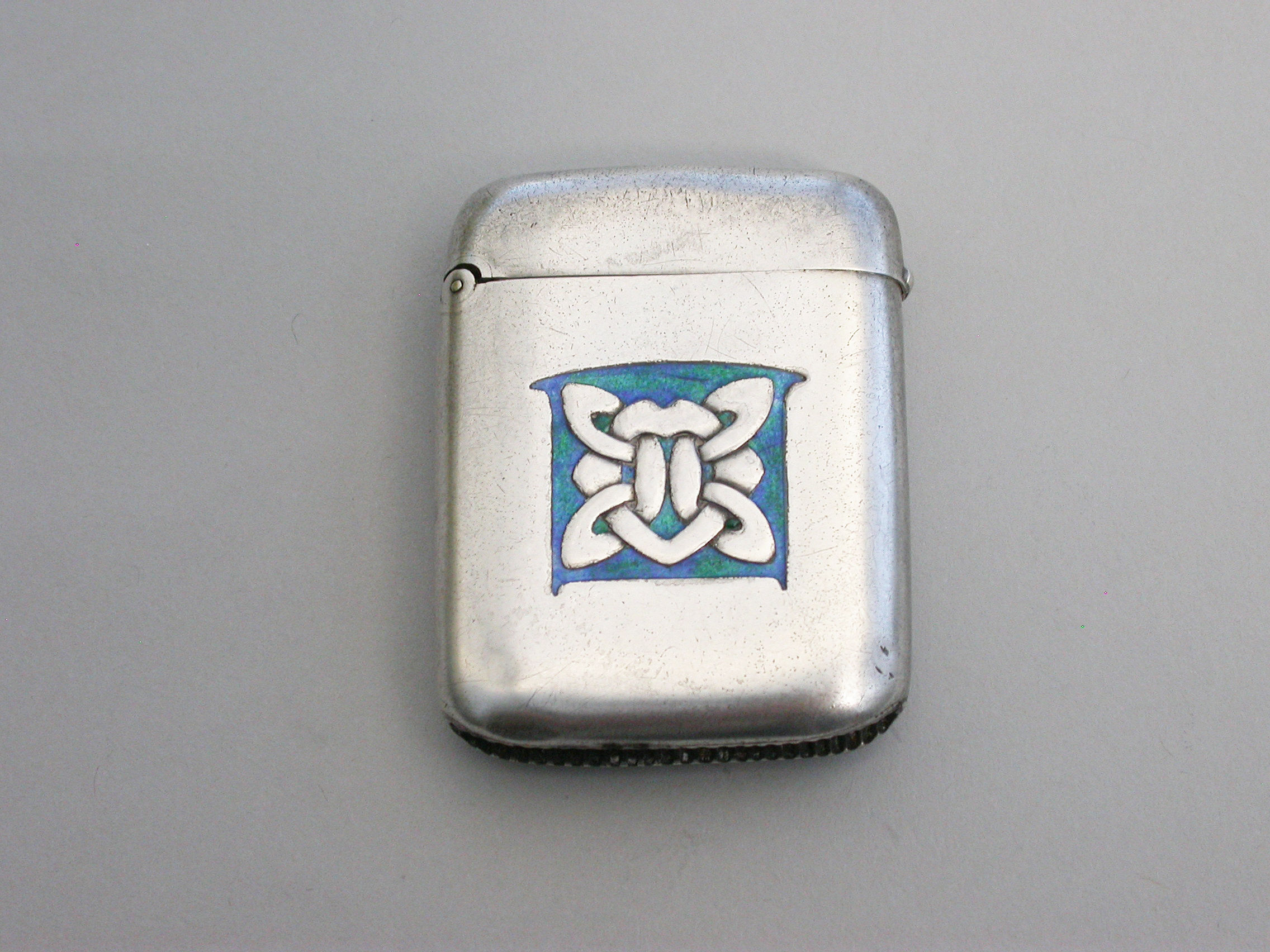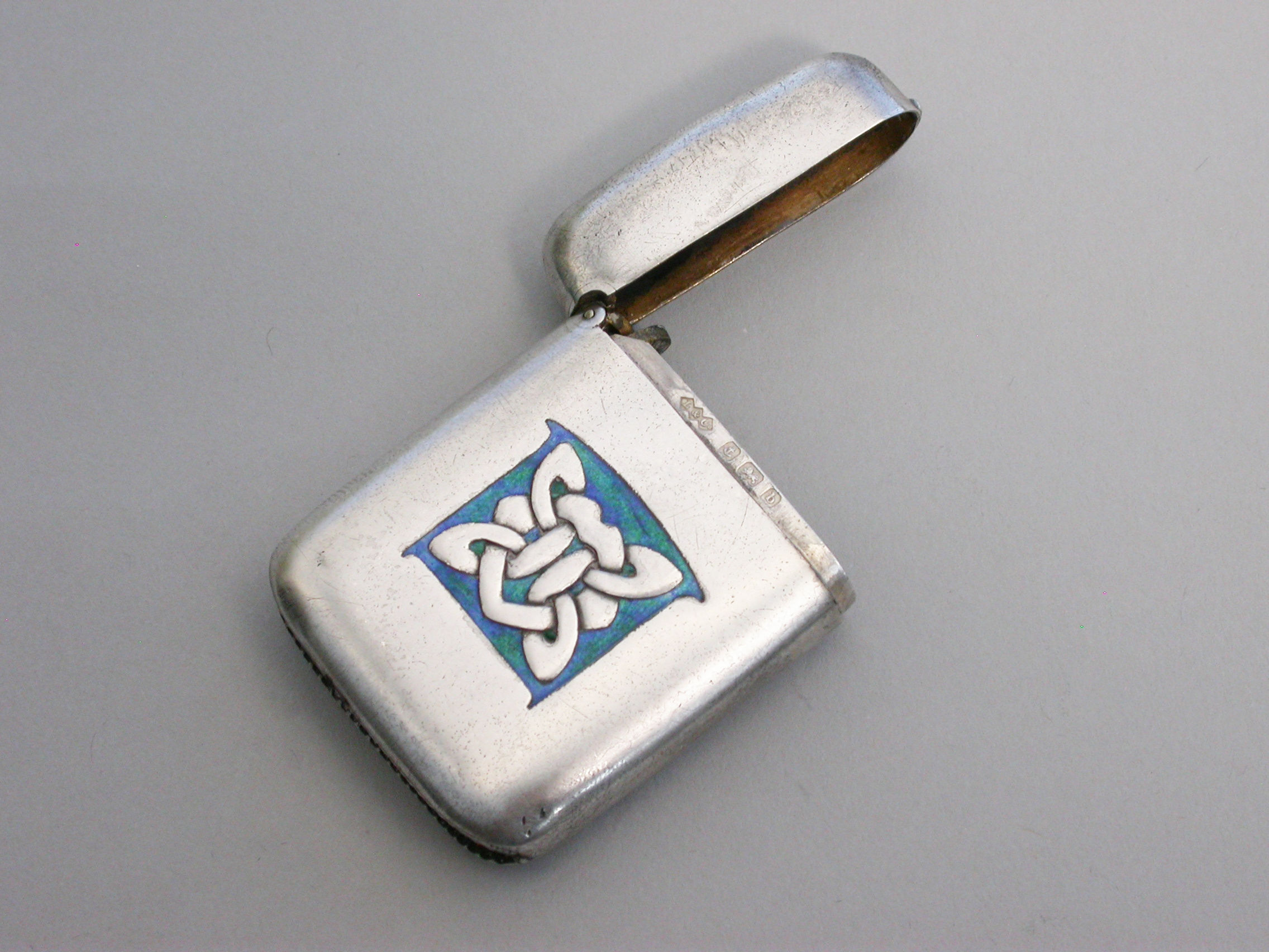 An early 20th century Arts & Crafts silver Vesta Case of rounded rectangular form with sprung hinged lid, the face with a panel decorated with a Celtic Knot symbol on a blue / green enamel background.