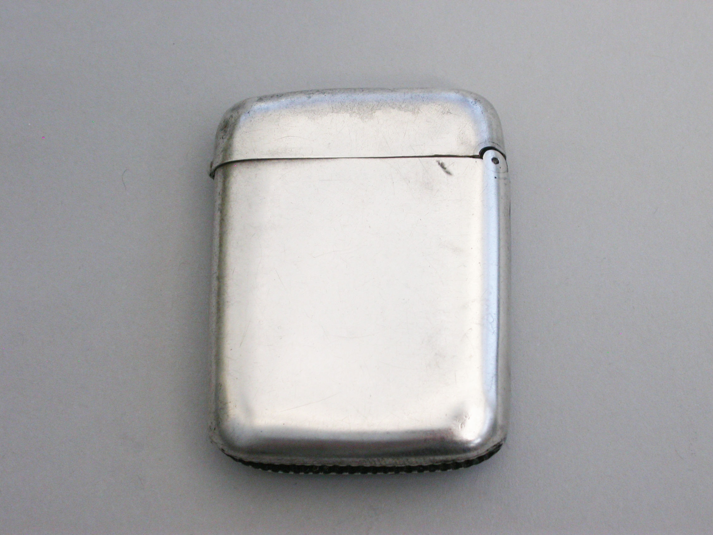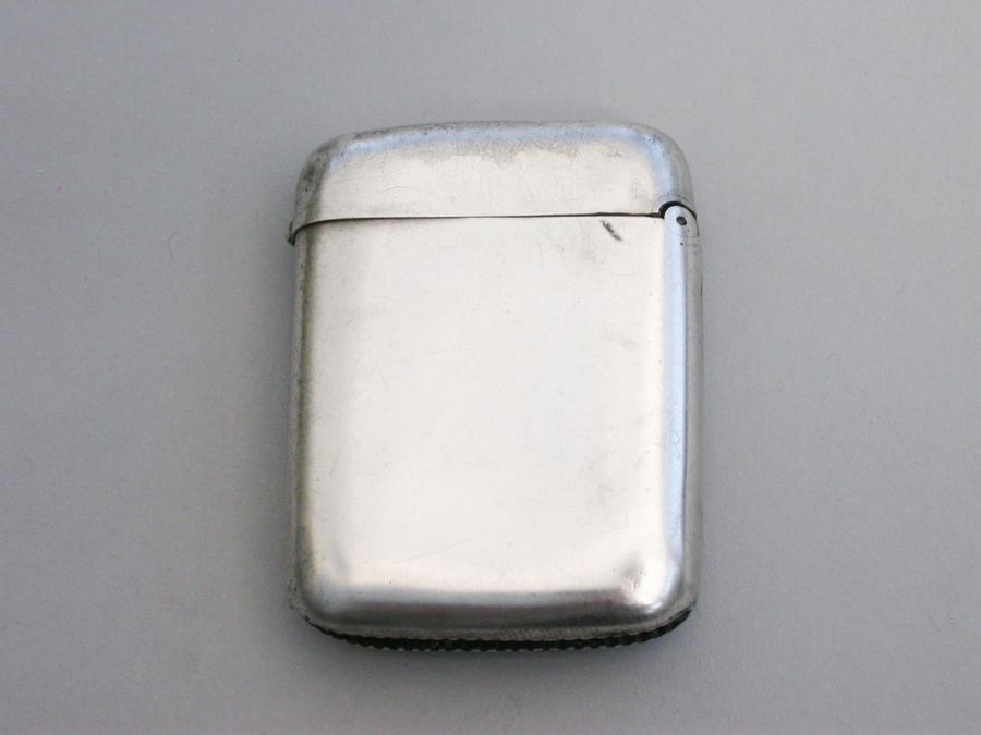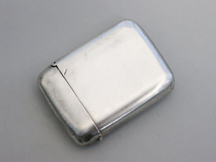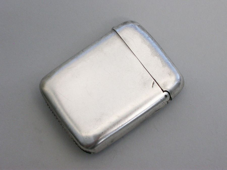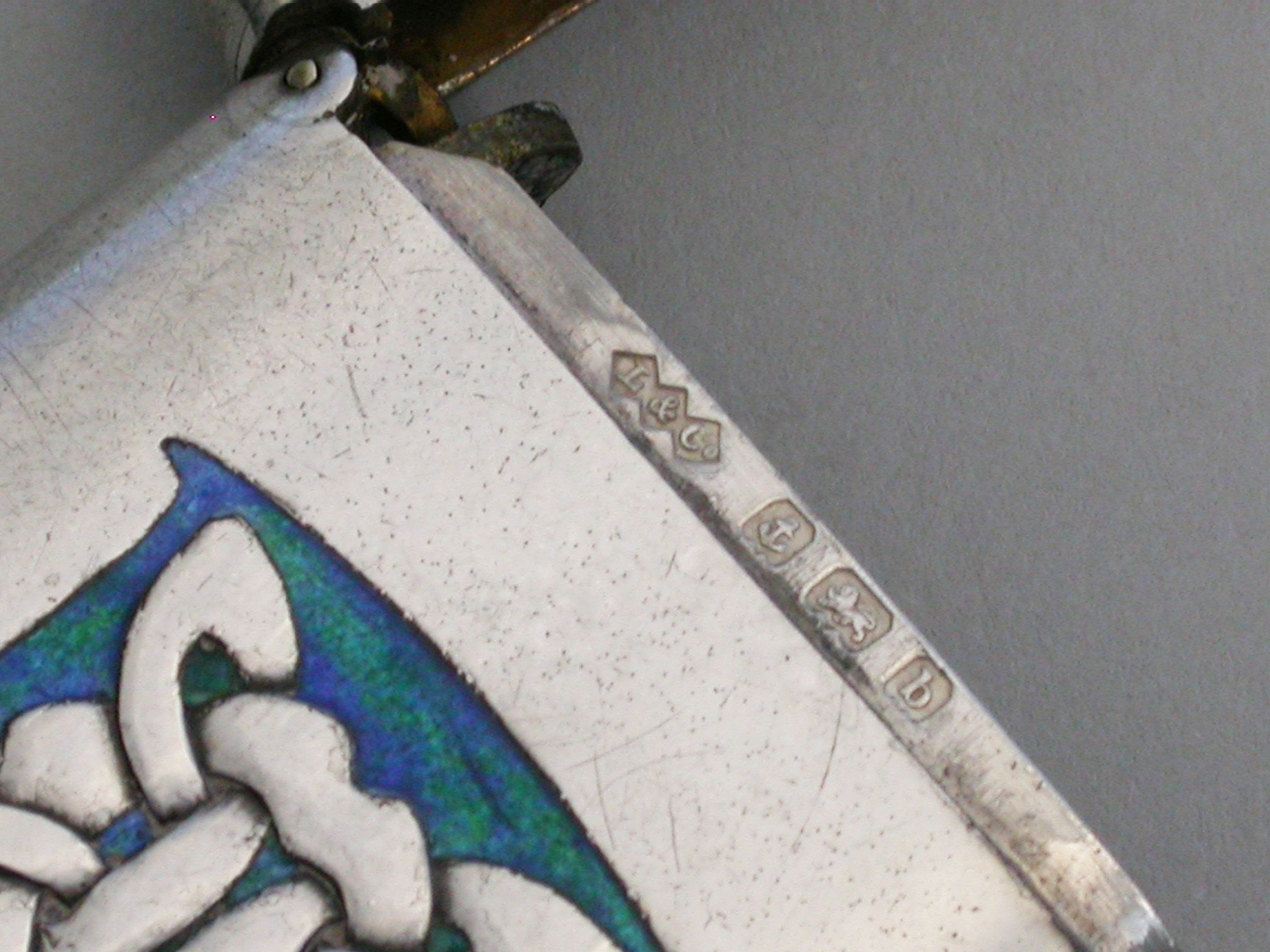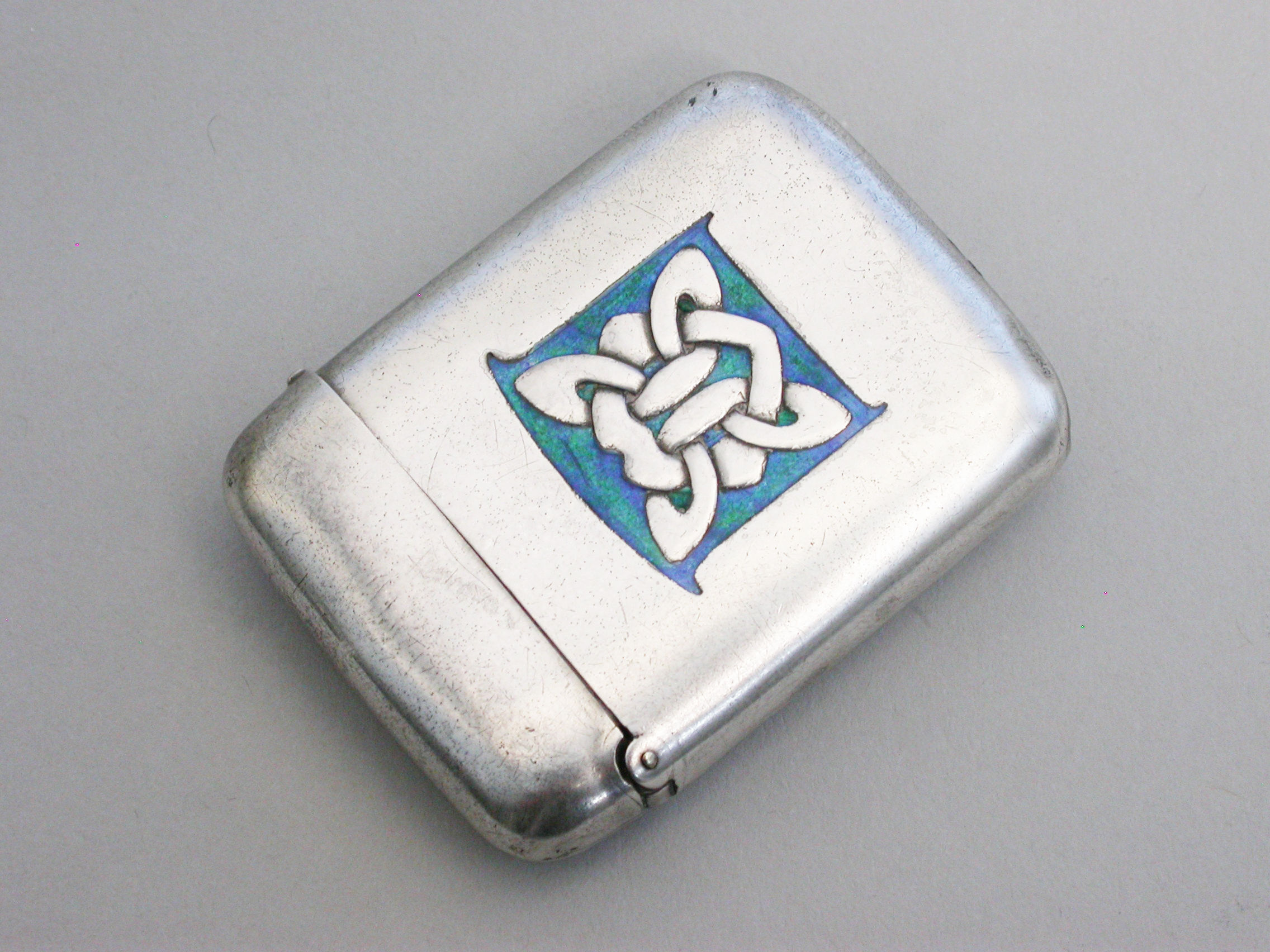 An early 20th century Arts & Crafts silver Vesta Case of rounded rectangular form with sprung hinged lid, the face with a panel decorated with a Celtic Knot symbol on a blue / green enamel background.