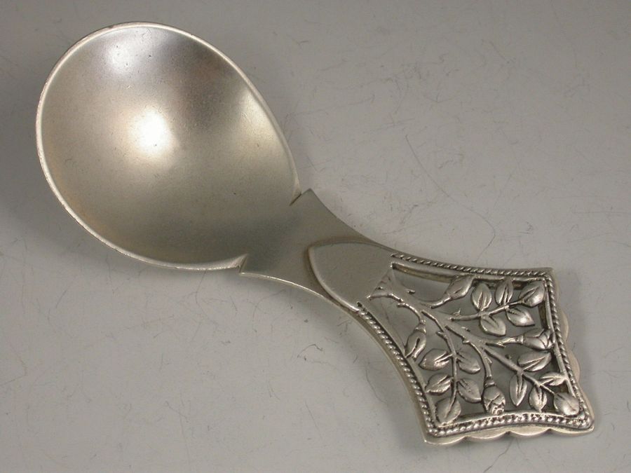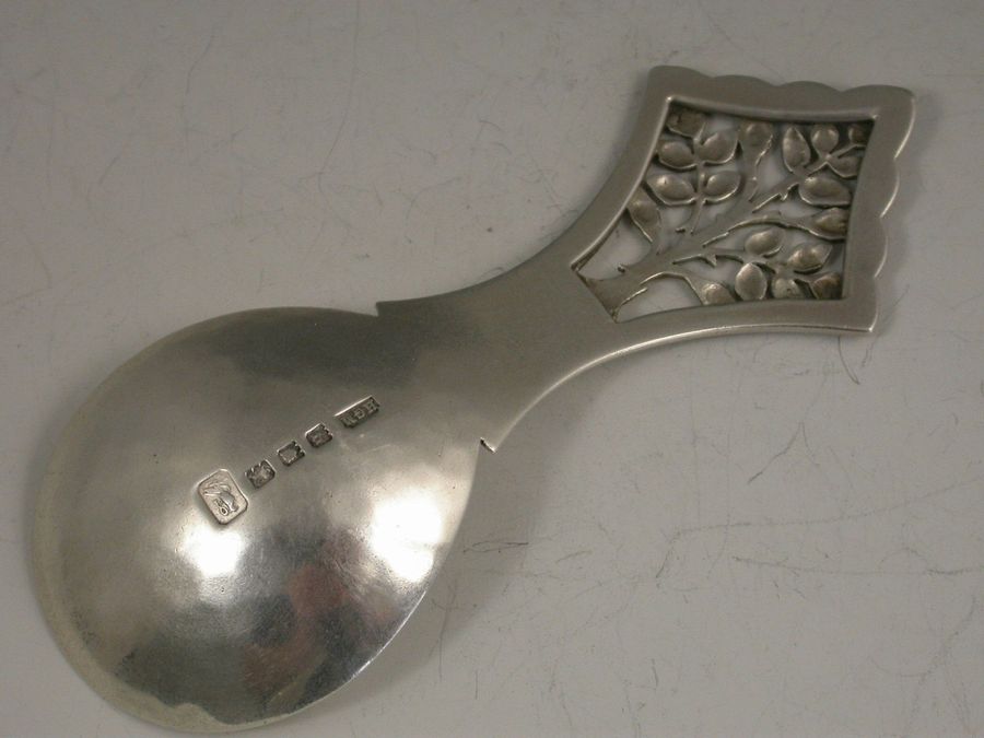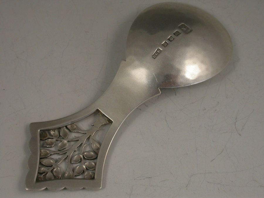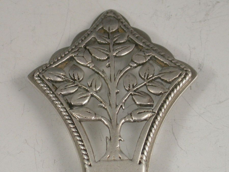 A rare early 20th century silver Caddy Spoon in the Arts & Crafts style with hammered oval bowl, the pierced diamond shaped handle depicting the “Tree of Life”.