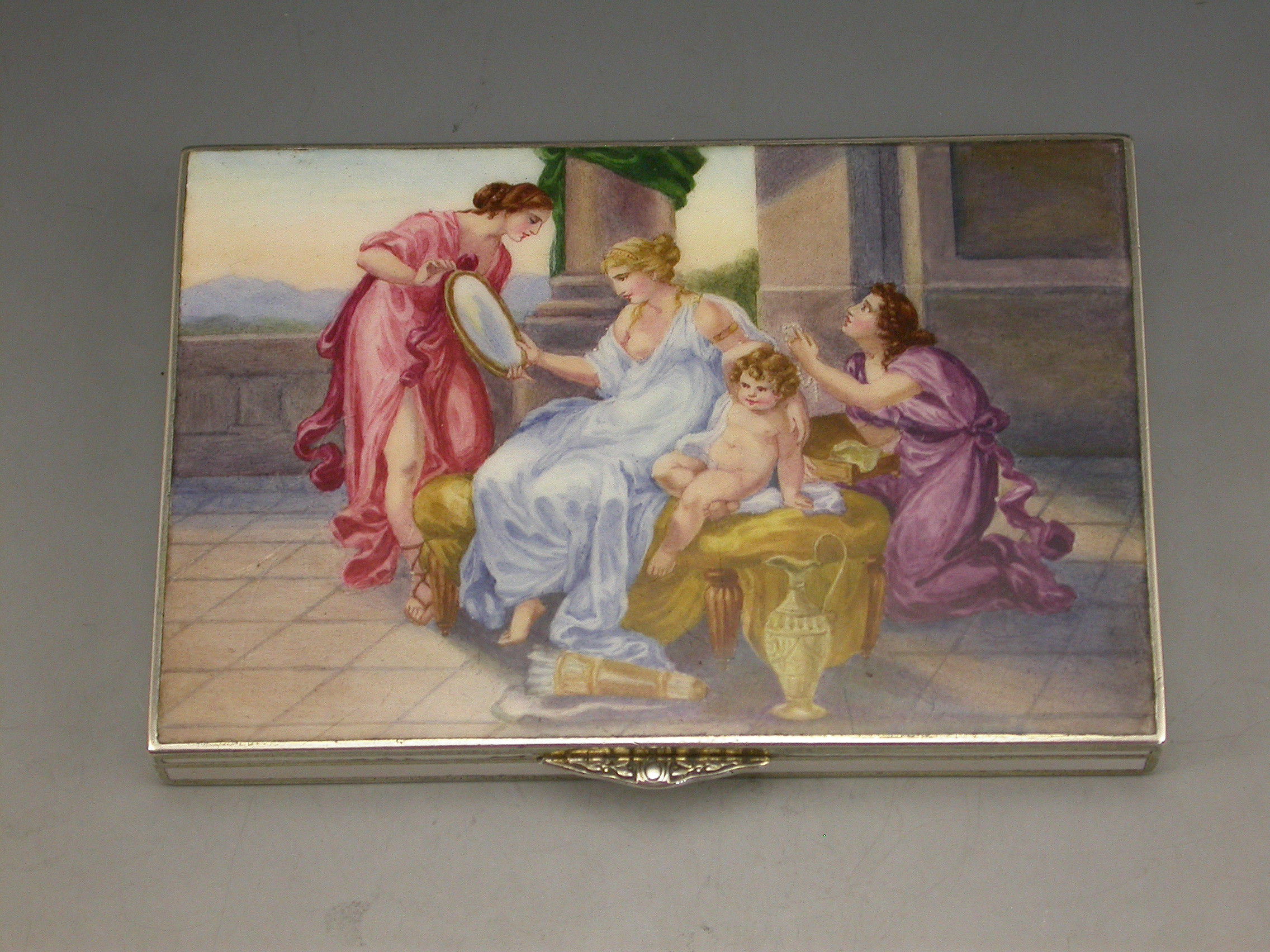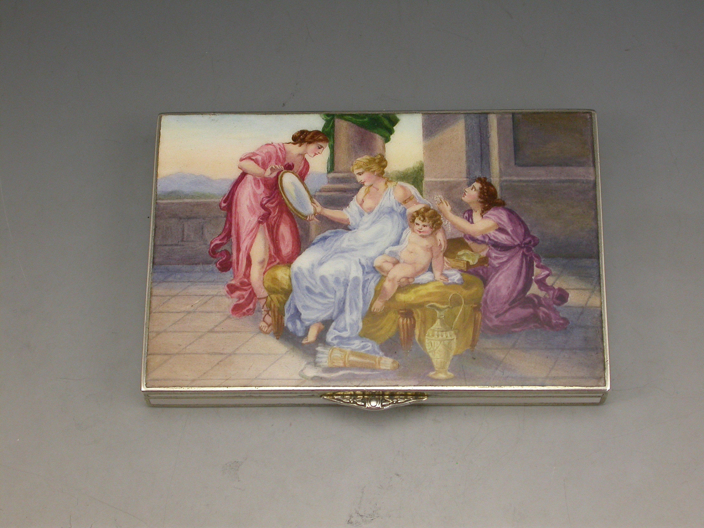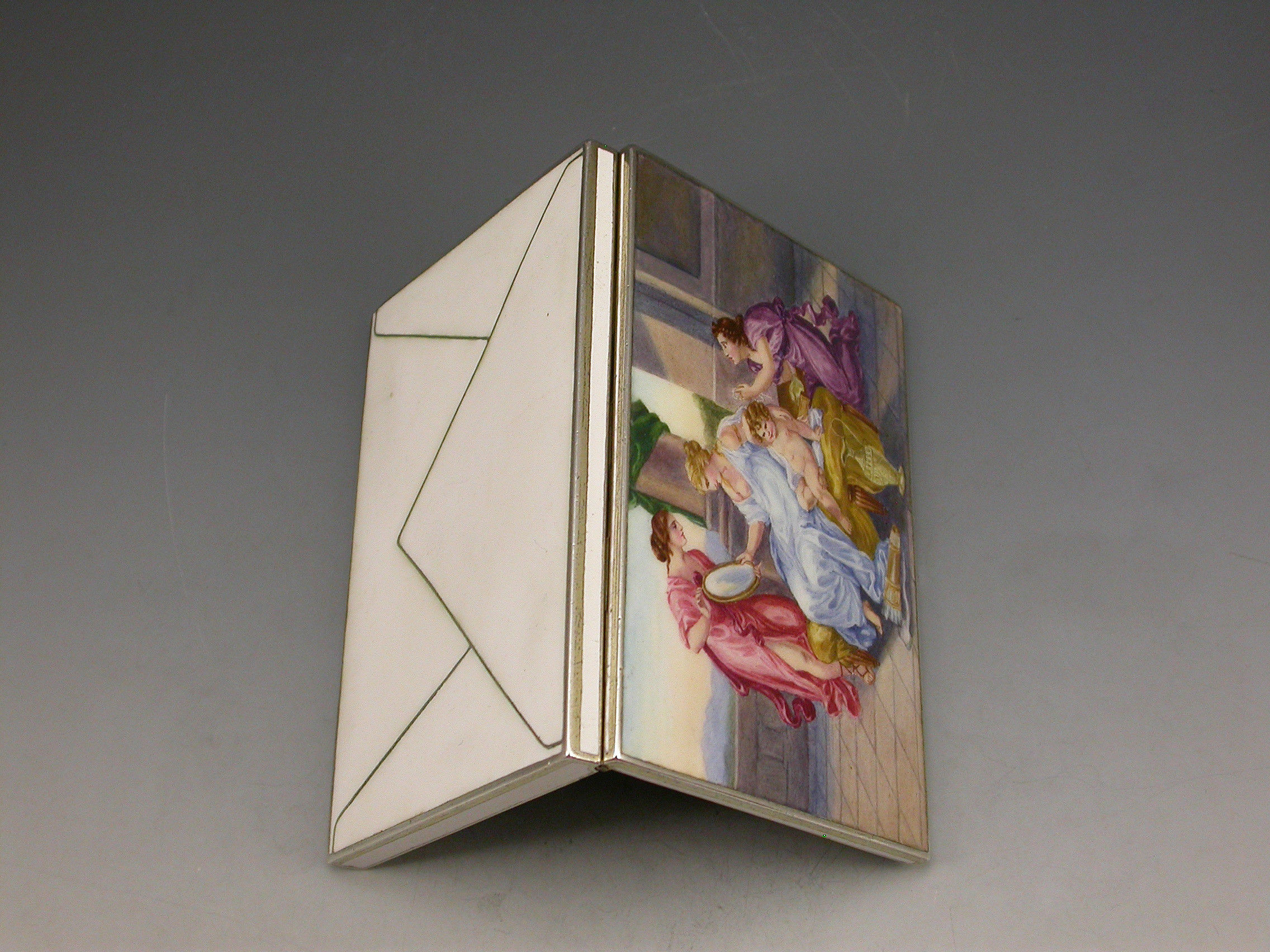 A very fine early 20th century Austrian silver and enamel Cigarette Case made in the form of an envelope with white enamel base and sides, the lid decorated with a classical scene depicting a lady with attendants and a baby, silver gilt interior.