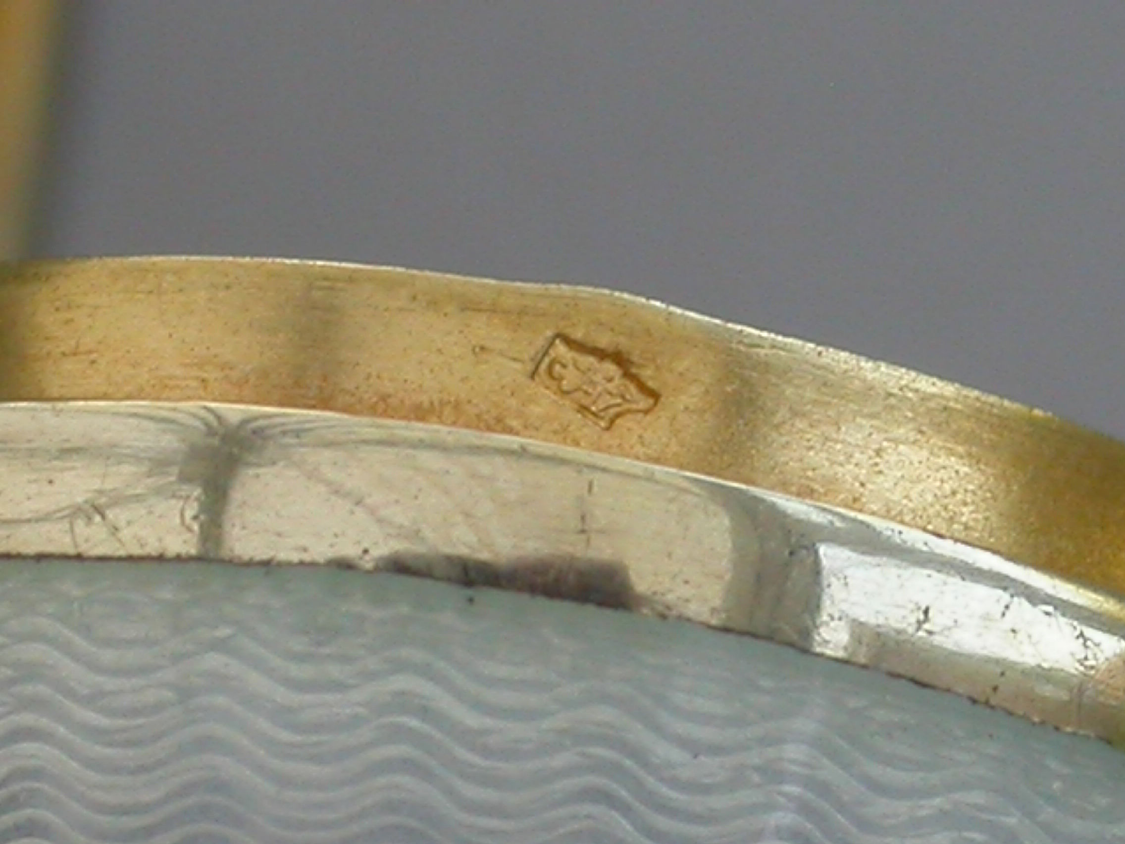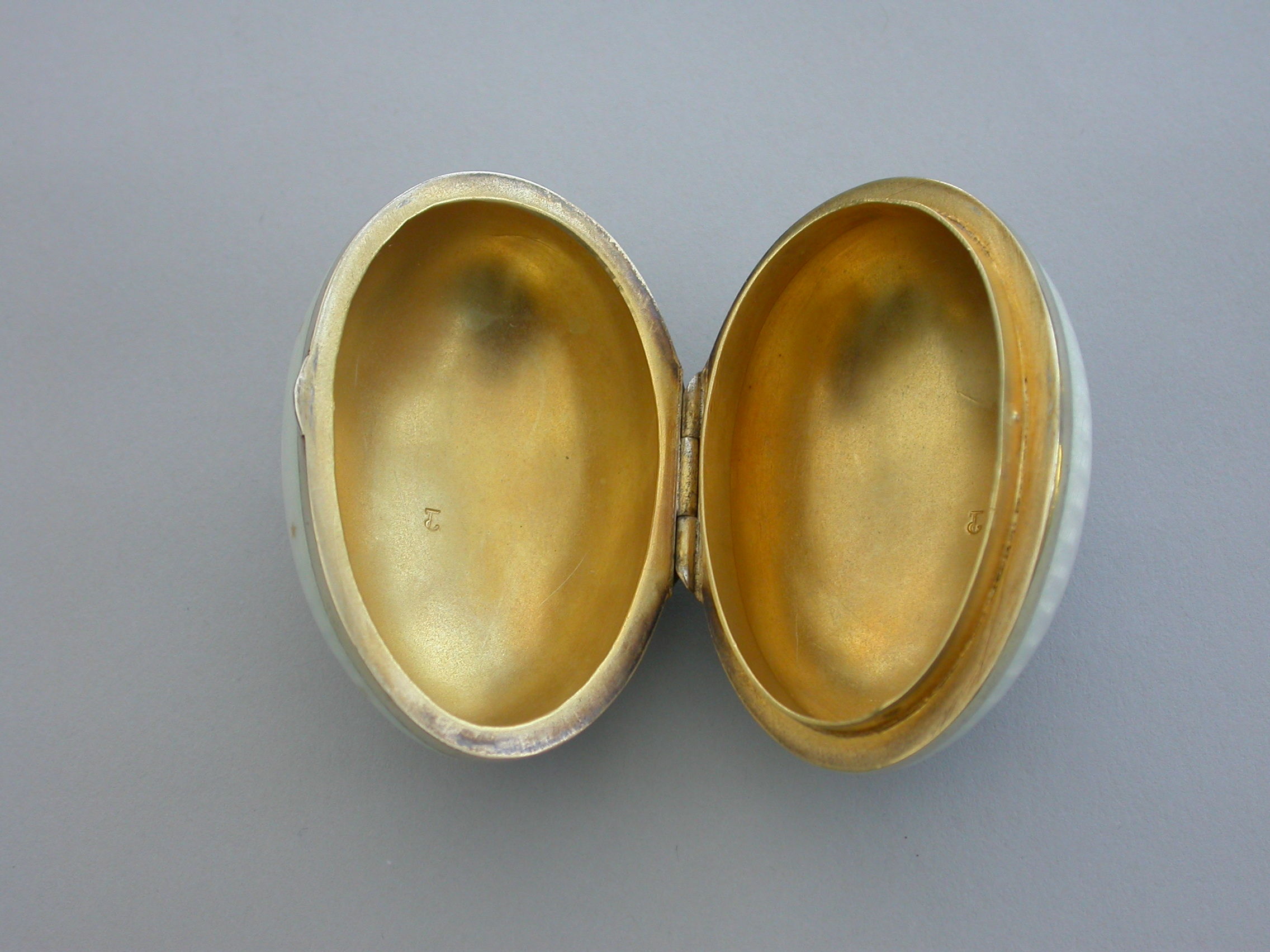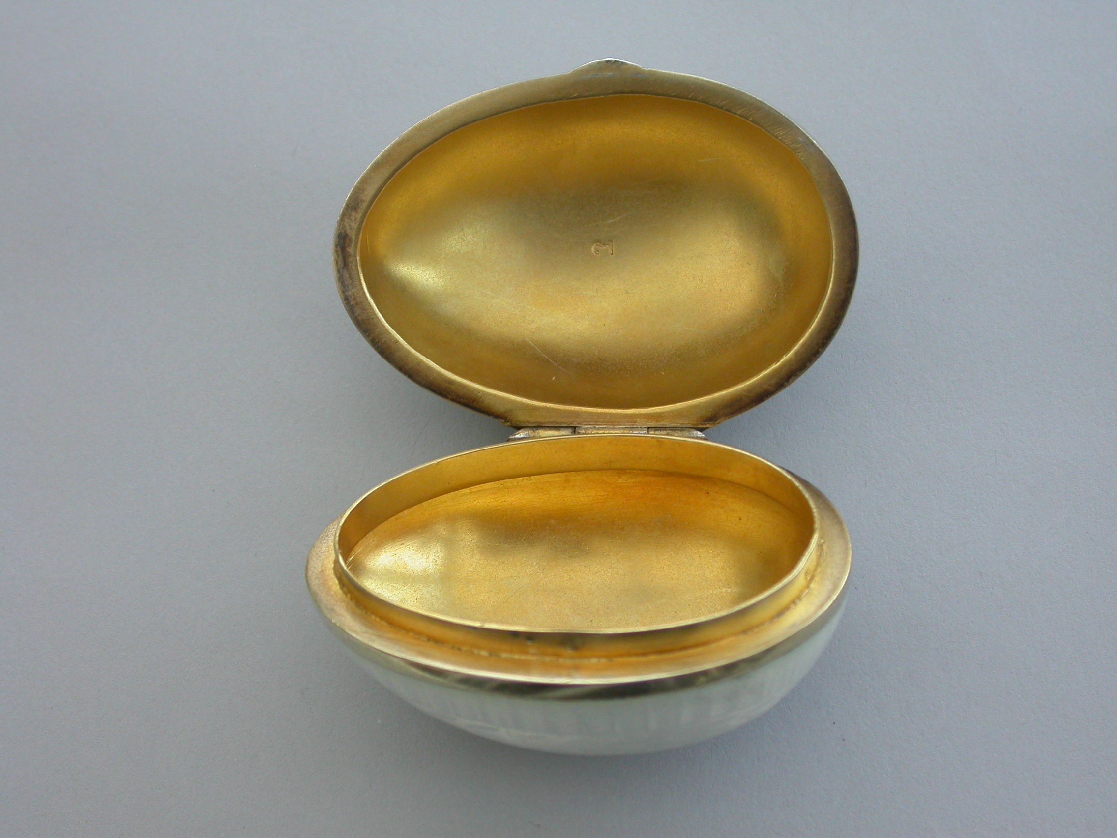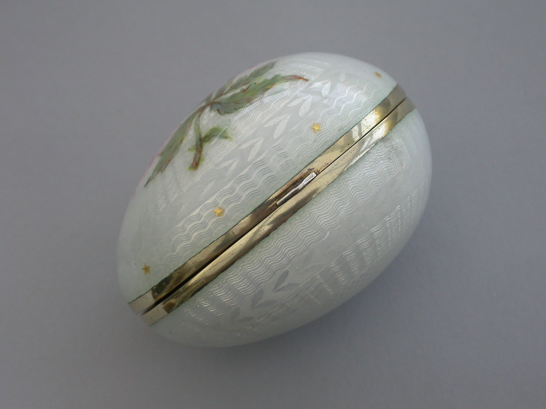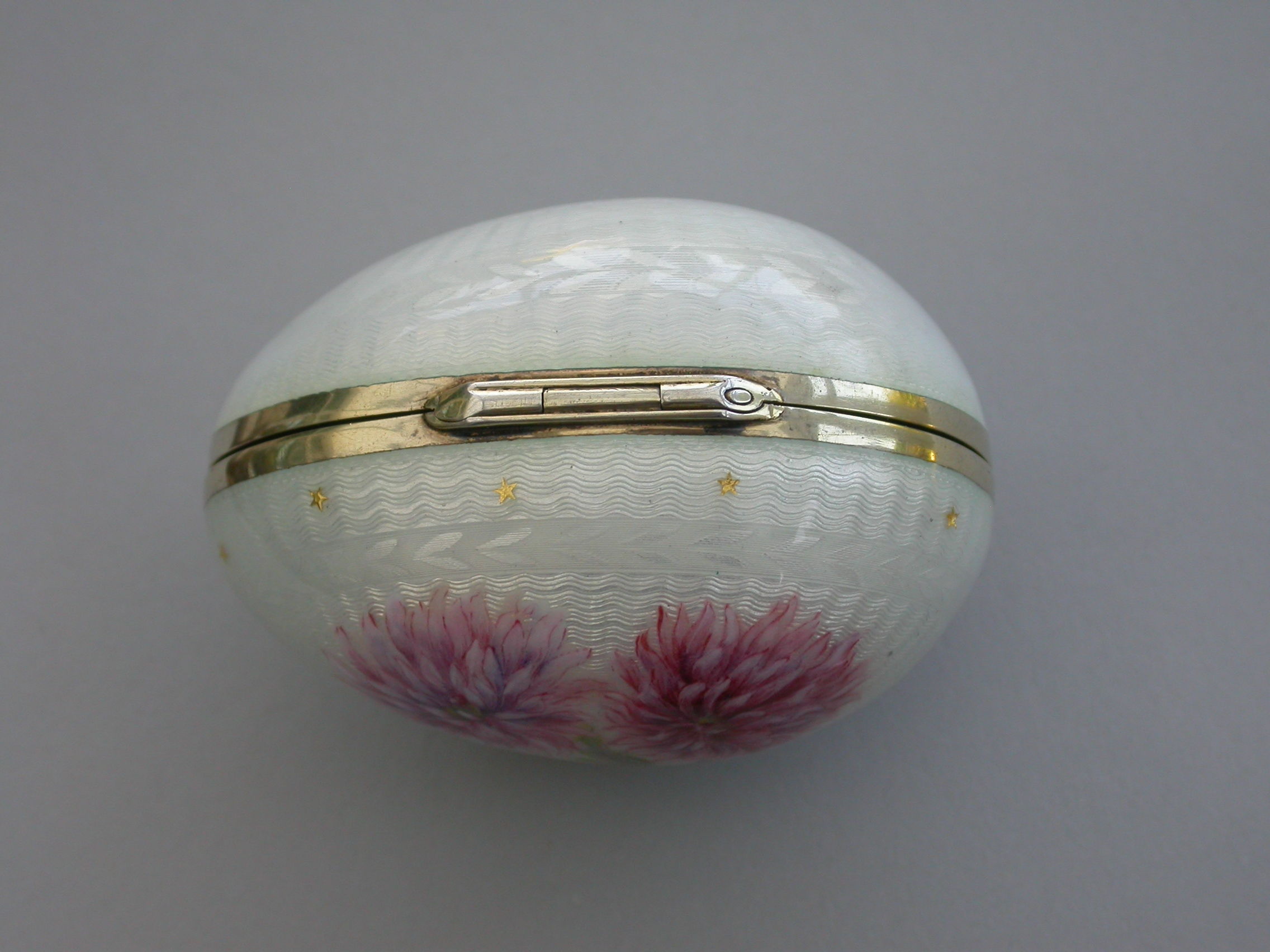 A superb quality early 20th century silver gilt and guilloche enamel Egg shaped Box decorated with Peonies and gold stars.