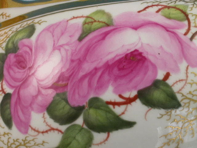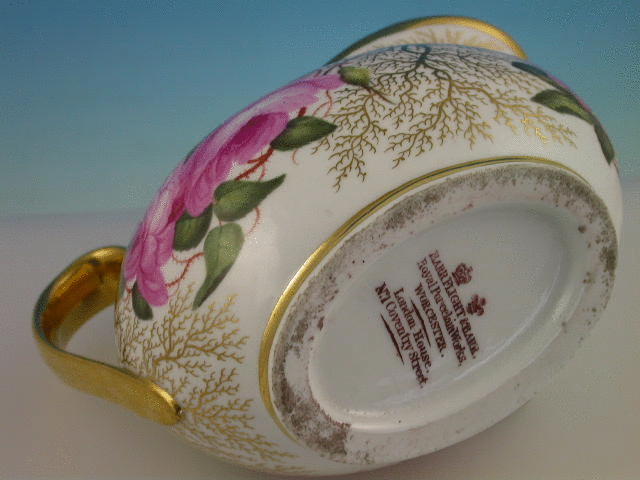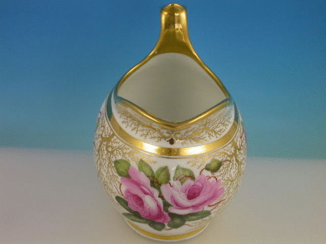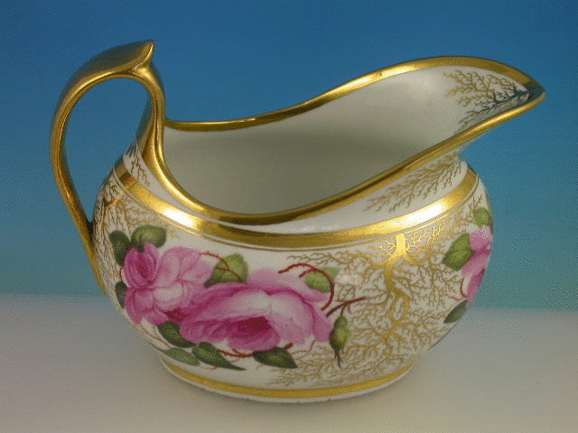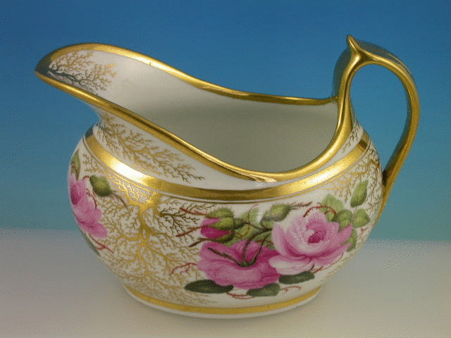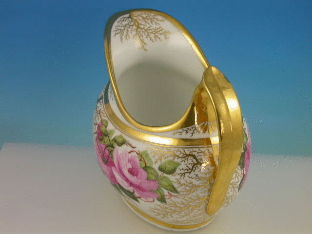 A very fine Barr, Flight and Barr Worcester helmet shaped Milk Jug with thumbnail moulded loop handle, finely painted with back to back roses in the style of William Billingsley, enriched with seaweed gilding, all within gilt line rims. c1804-13.
