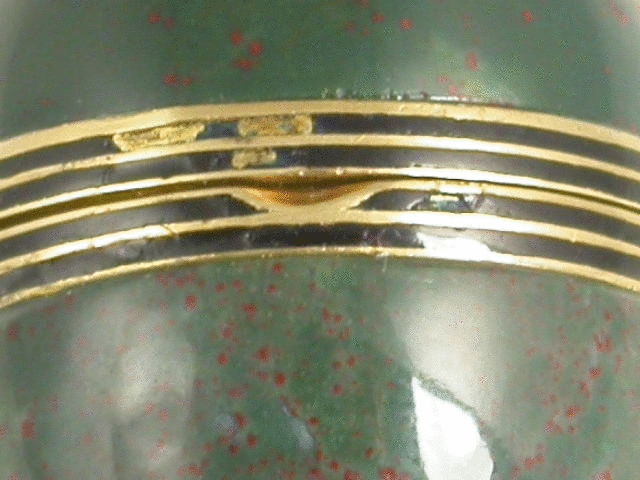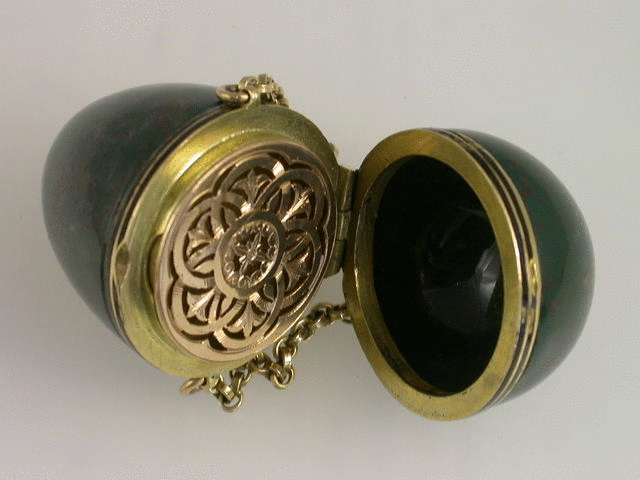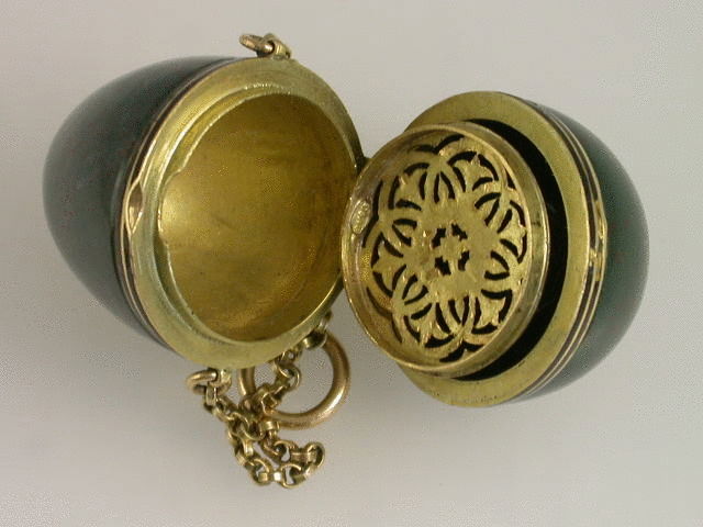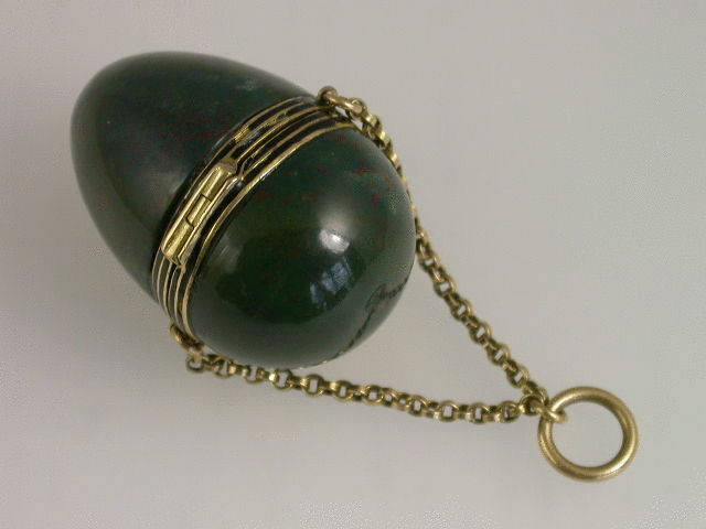 A very fine early 20th century gold mounted bloodstone and enamel egg shaped Vinaigrette, with intricately pierced grille and attached suspension chain.