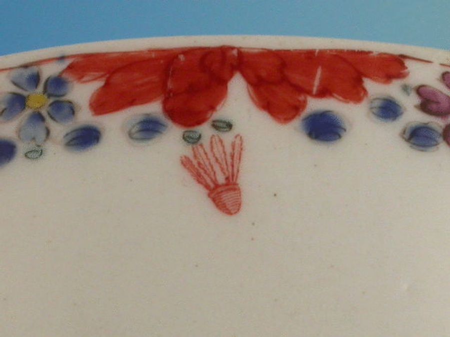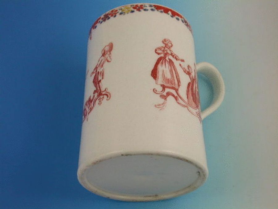 An extremely rare Bow cylindrical Mug with grooved strap handle, printed in iron red with Childrens Games including Blind Mans Buff, Battledore and Shuttlecock and Whip Top, after Gravelot, within a painted border consisting of a garland of flowers.