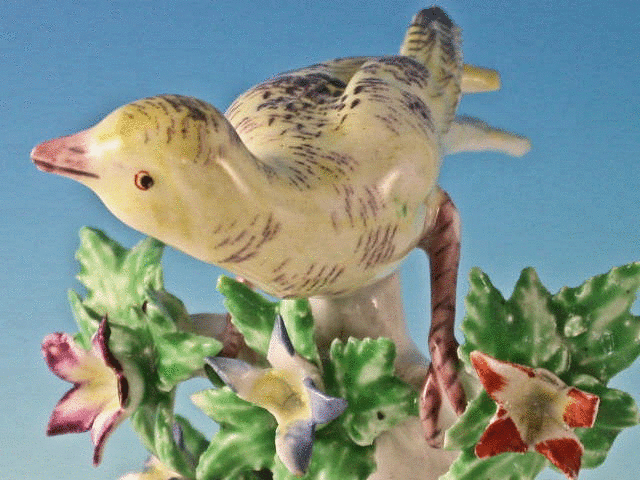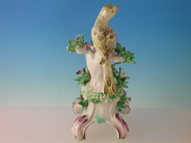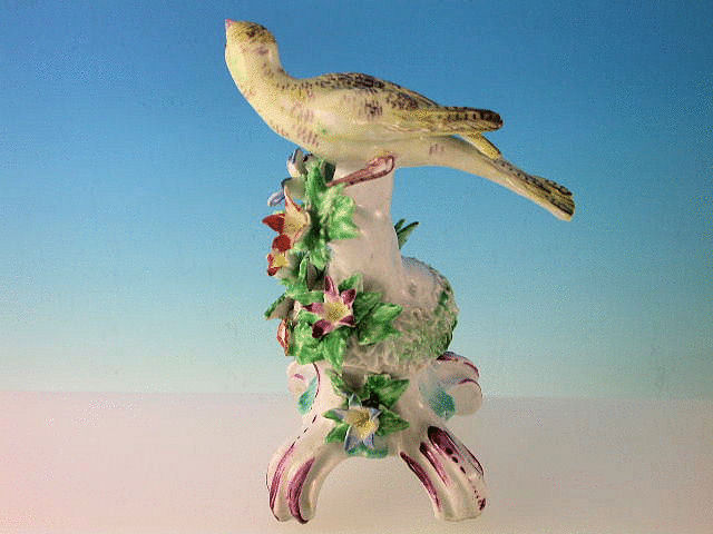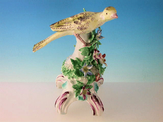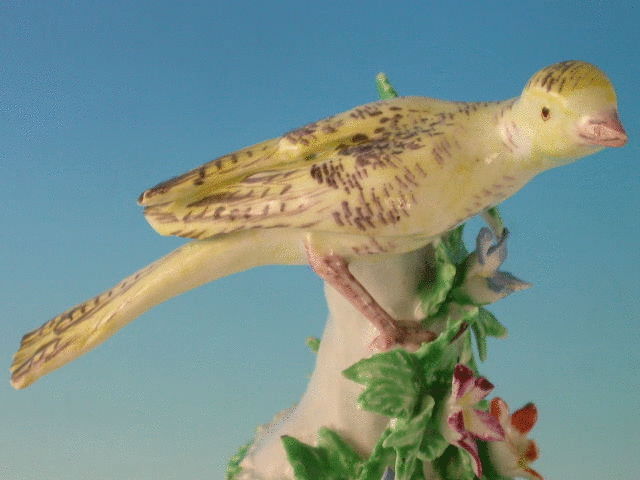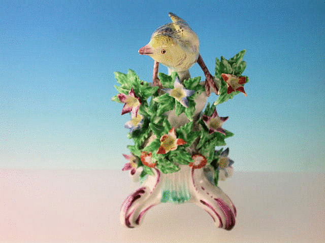 A fine Bow Figure of a Yellow Bunting on a moulded raised base, painted in polychrome enamels with encrusted flowers and leaves.