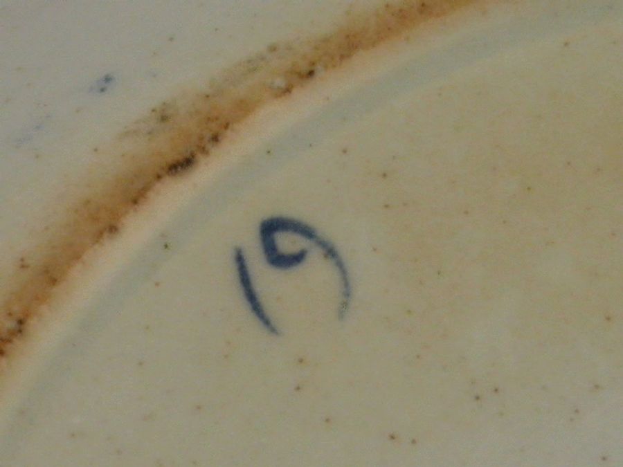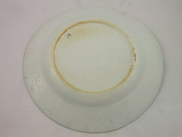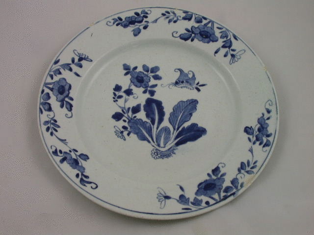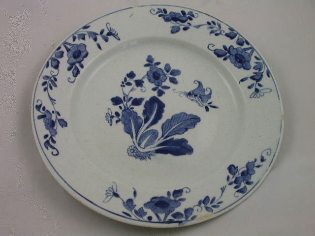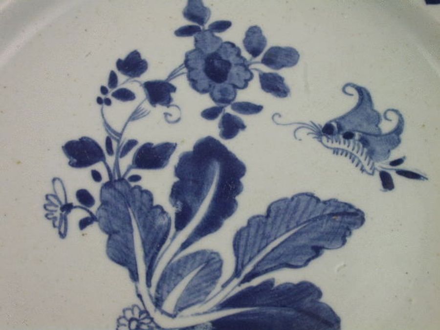 A wide rimmed Bow warped deep Plate with countersunk base, painted in blue with a plant with primula leaves, flowers in outline and profile and a large insect. The rim decorated with floral and foliate sprays within a line border. c1755.
