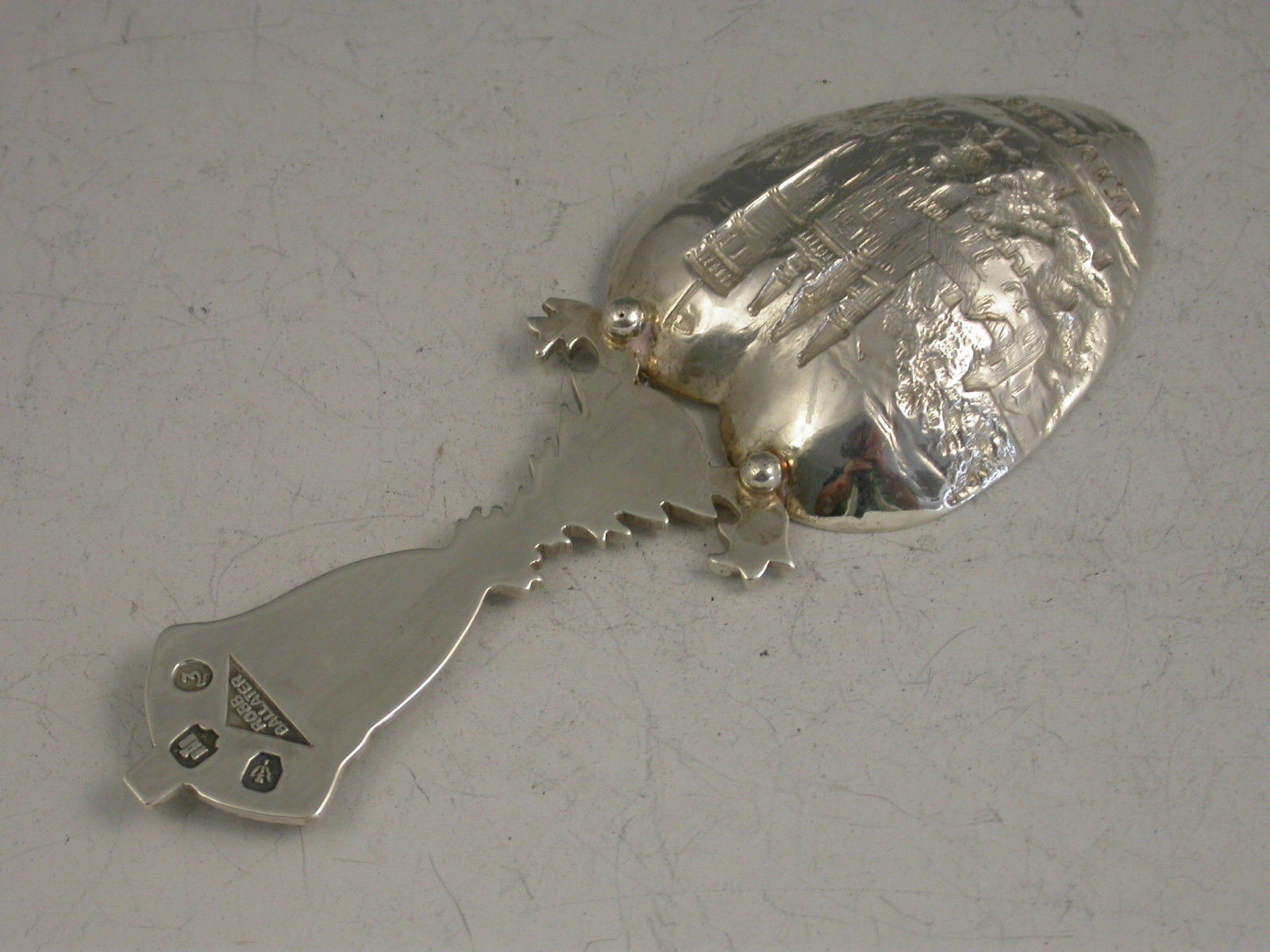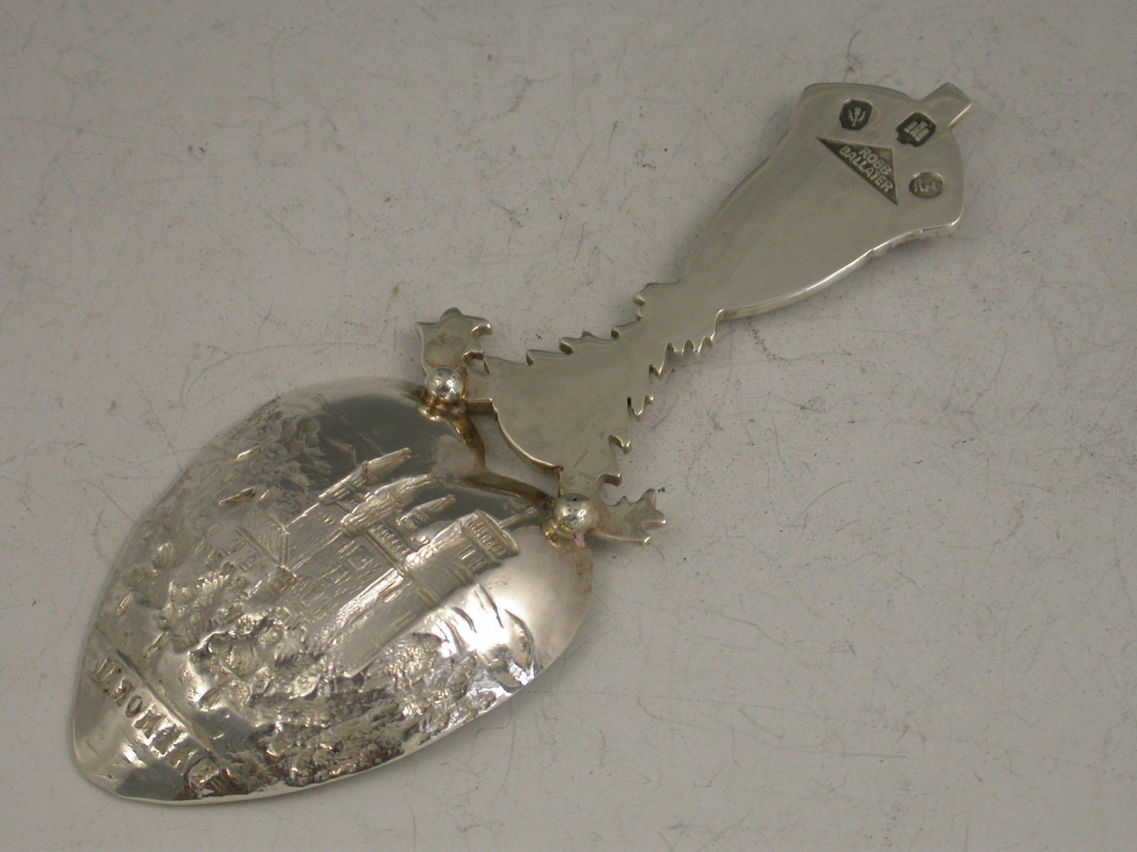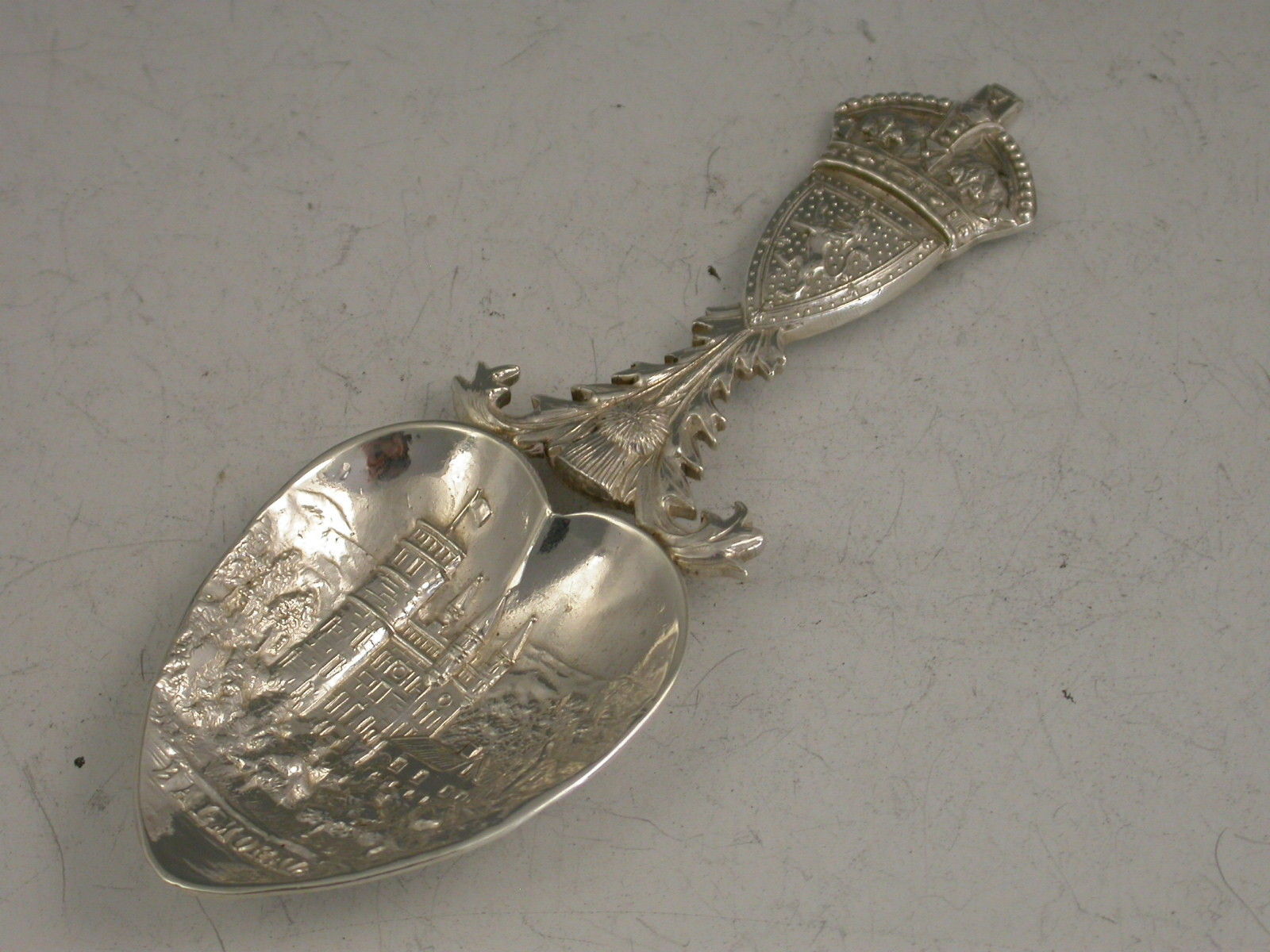 A rare early 20th century Scottish Provincial silver Caddy Spoon, the lightly gilded heart shaped bowl with chased and embossed view of BALMORAL CASTLE (the Royal Family’s Scottish home), the cast handle formed from the Scottish Thistle, the Lion rampant and the Union Crown.