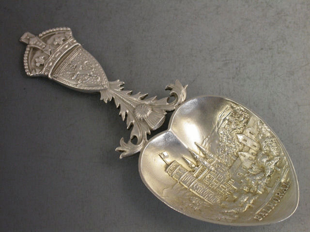 A rare early 20th century Scottish Provincial silver Caddy Spoon, the lightly gilded heart shaped bowl with chased and embossed view of BALMORAL CASTLE (the Royal Family’s Scottish home), the cast handle formed from the Scottish Thistle, the Lion rampant and the Union Crown.
