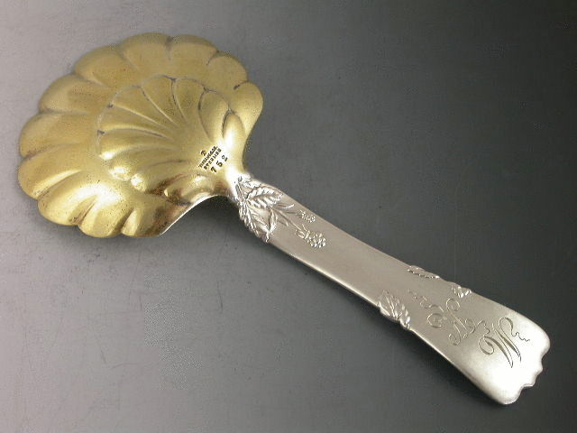 A good 19th century American silver Caddy or Bon Bon Spoon with gilded shell shaped bowl, the handle decorated with vine leaves and grapes on a matt back ground. Engraved with contemporary initials MK.