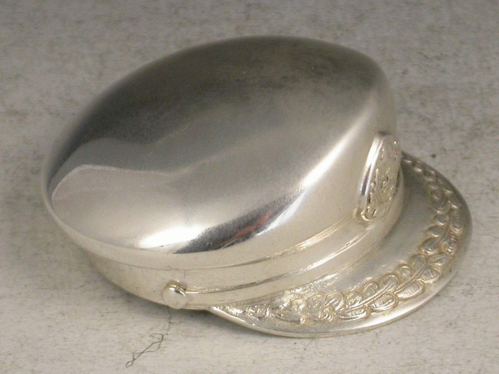 A fine quality contemporary silver Caddy Spoon made in the form of a Trinity House Pilots Cap, to commemorate the late Captain John D. Norie, founder member of the Society of Caddy Spoon collectors. Engraved: 12 09 63 JDN 12 09 02. Made as a limited edition of 48. This actual spoon belonged to the late Captain Norie.