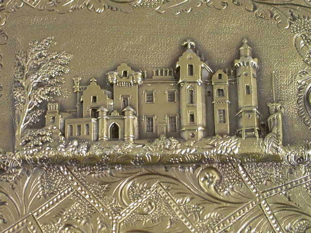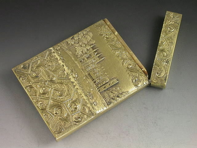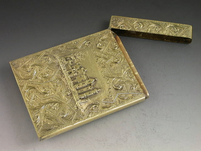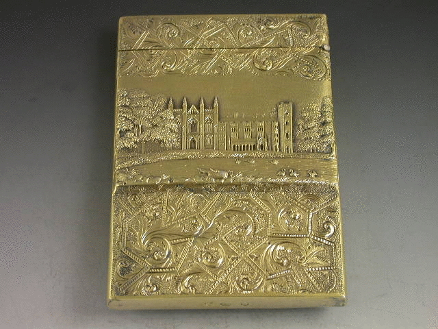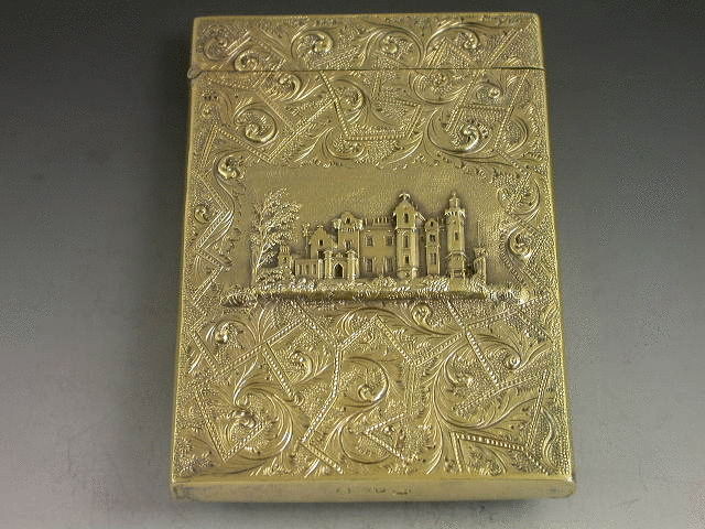 A very fine quality William IV silver gilt ‘Castletop’ Card Case with raised scenes to back and front, also decorated with foliate scroll work on a matt background. The front depicting Abbotsford House, the rear Newstead Abbey. With hinged flip top lid.