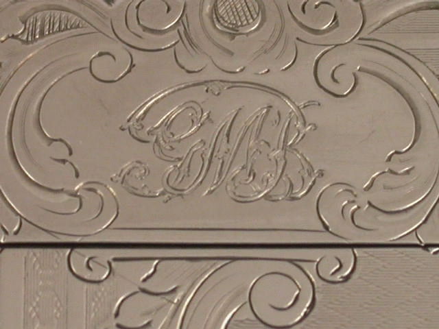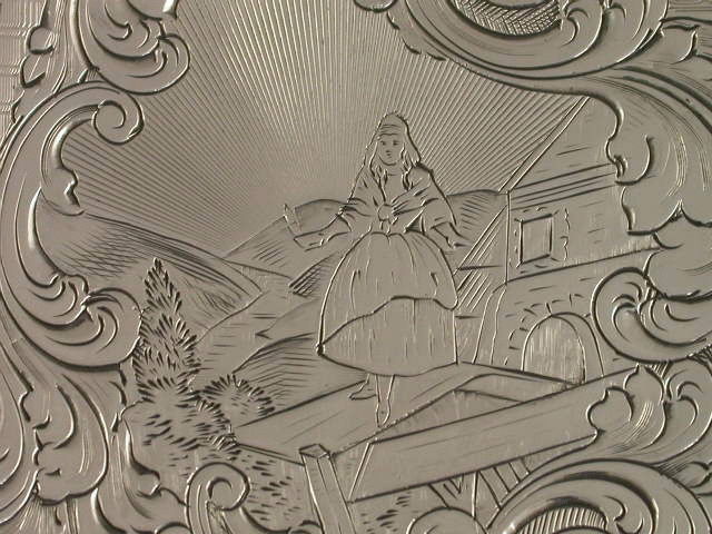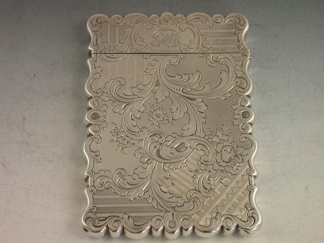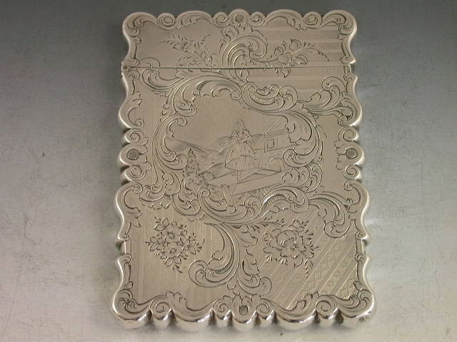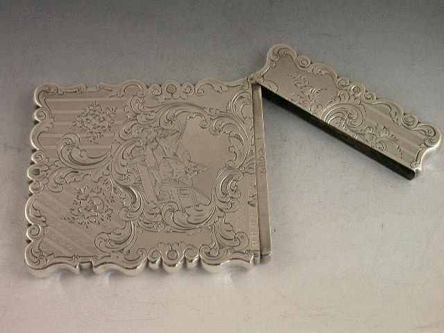 A rare Victorian silver Card Case finely bright-cut engraved with geometric designs and foliate scroll work, a rococo scroll cartouche to the front engraved with a scene depicting Jenny Lind, the famous 19th century Swedish Opera Singer.