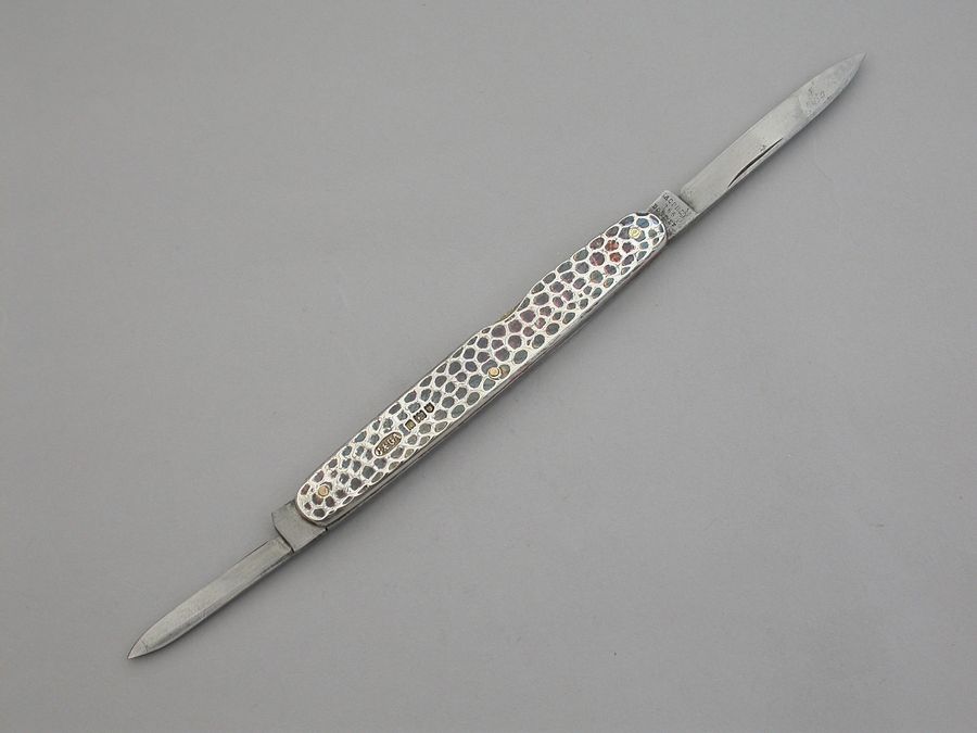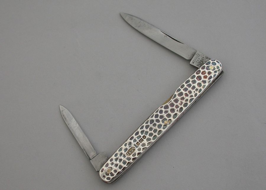 A good quality Edwardian silver Pen Knife with two folding steel blades, the silver side plates with spot hammered decoration filled with enamel. Complete with associated Morocco leather case.