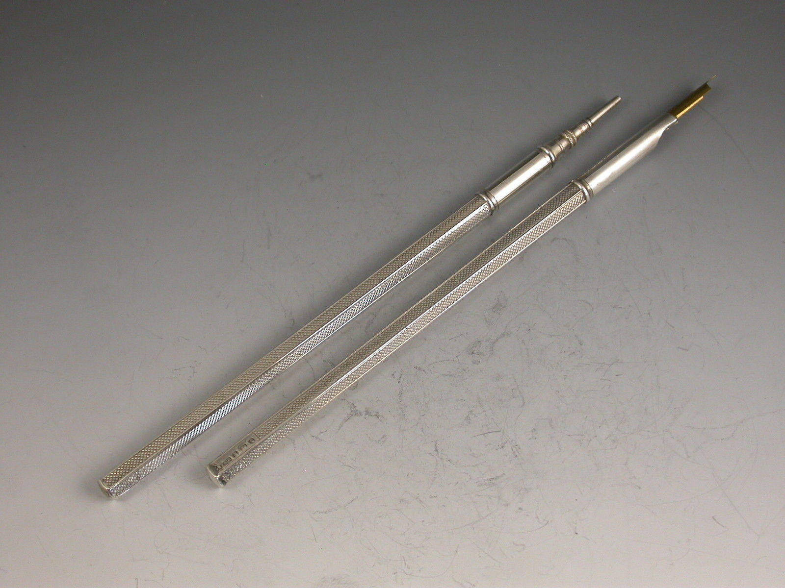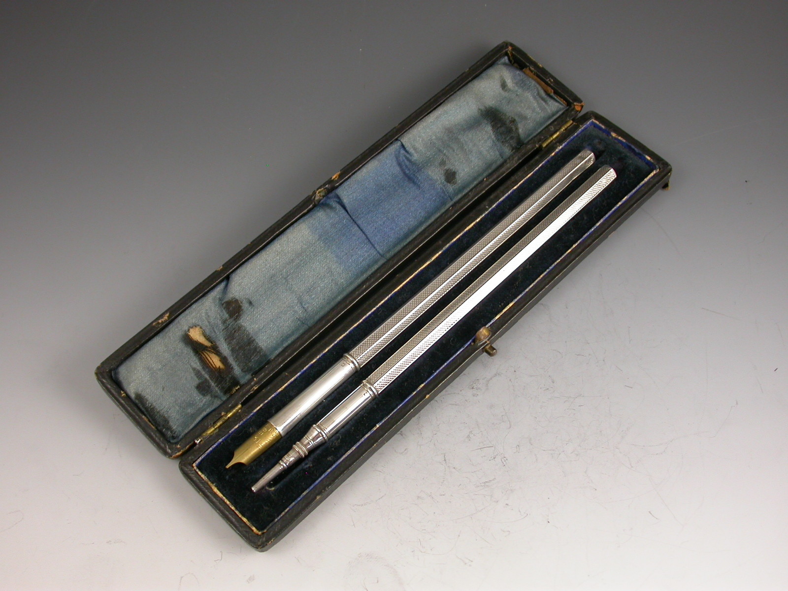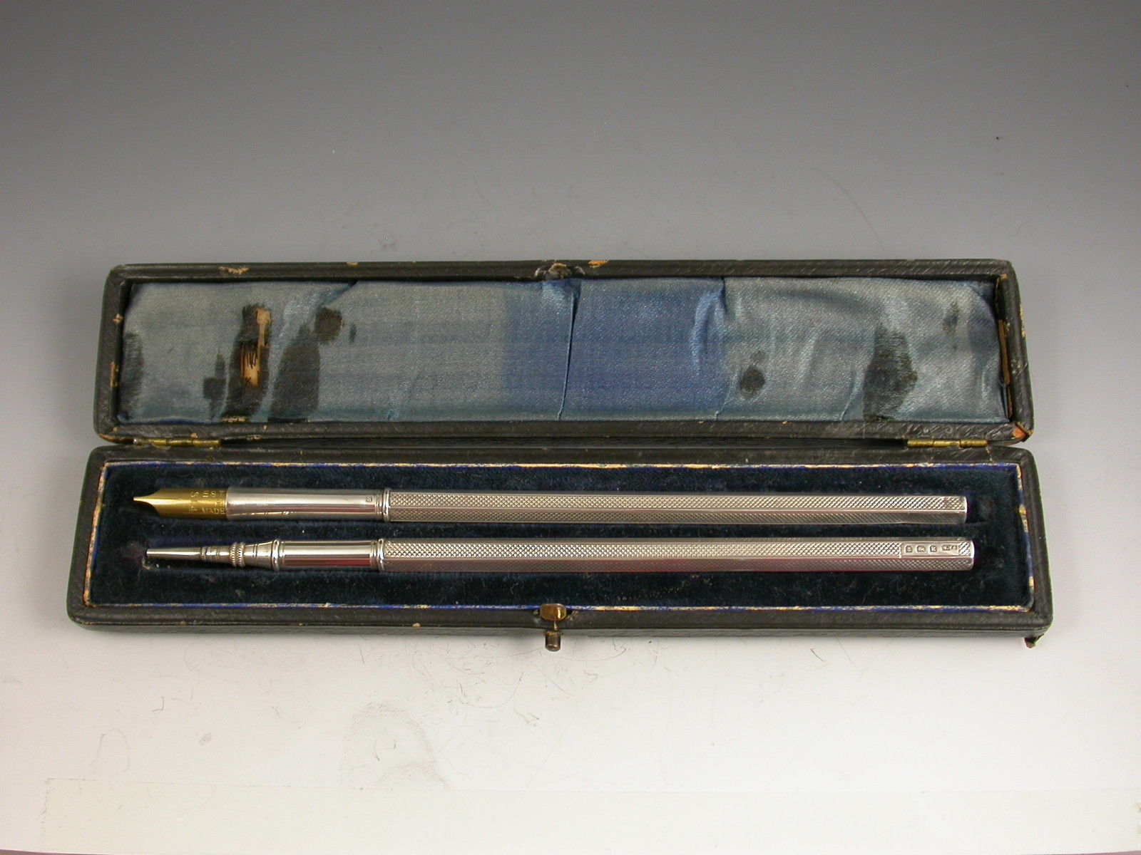 A pair of Edwardian cased fully hallmarked silver Propelling Pencil and Dip Pen, the hexagonal bodies with engine turned decoration and vacant rectangular cartouches. Complete with original silk and velvet lined leather case.