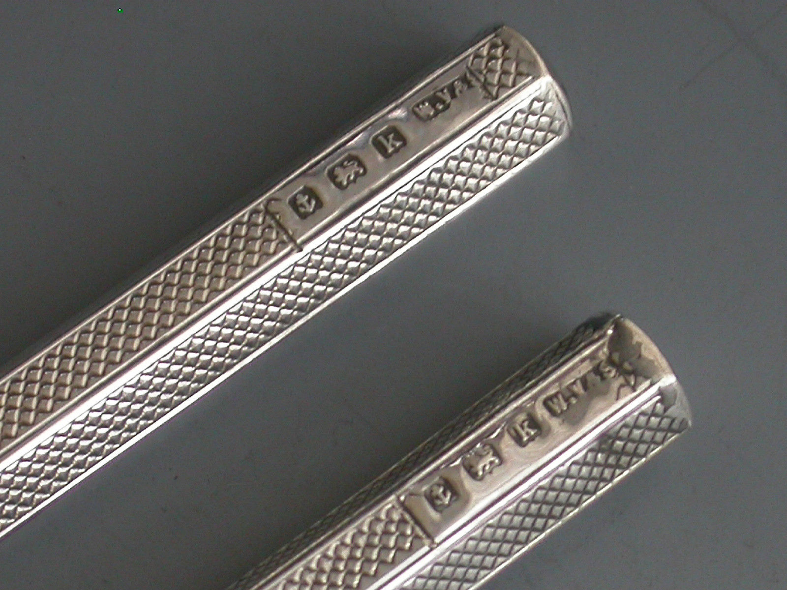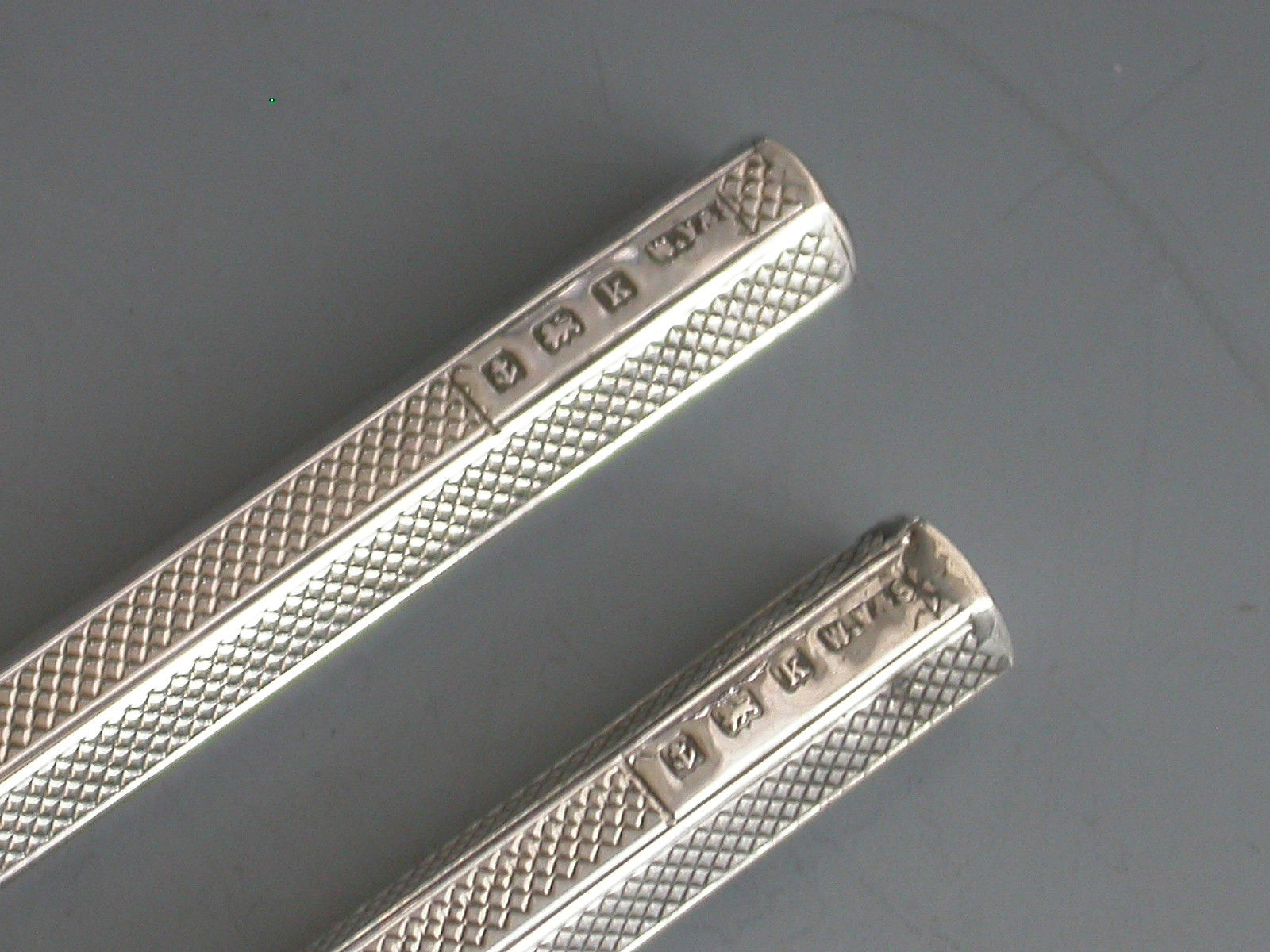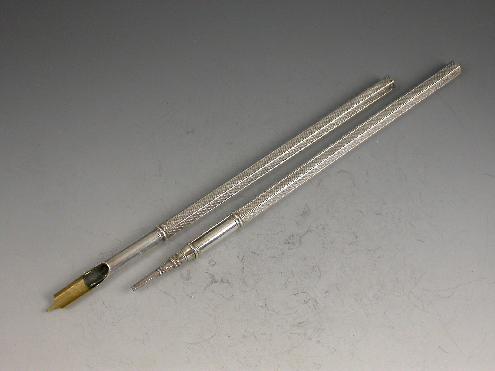 A pair of Edwardian cased fully hallmarked silver Propelling Pencil and Dip Pen, the hexagonal bodies with engine turned decoration and vacant rectangular cartouches. Complete with original silk and velvet lined leather case.