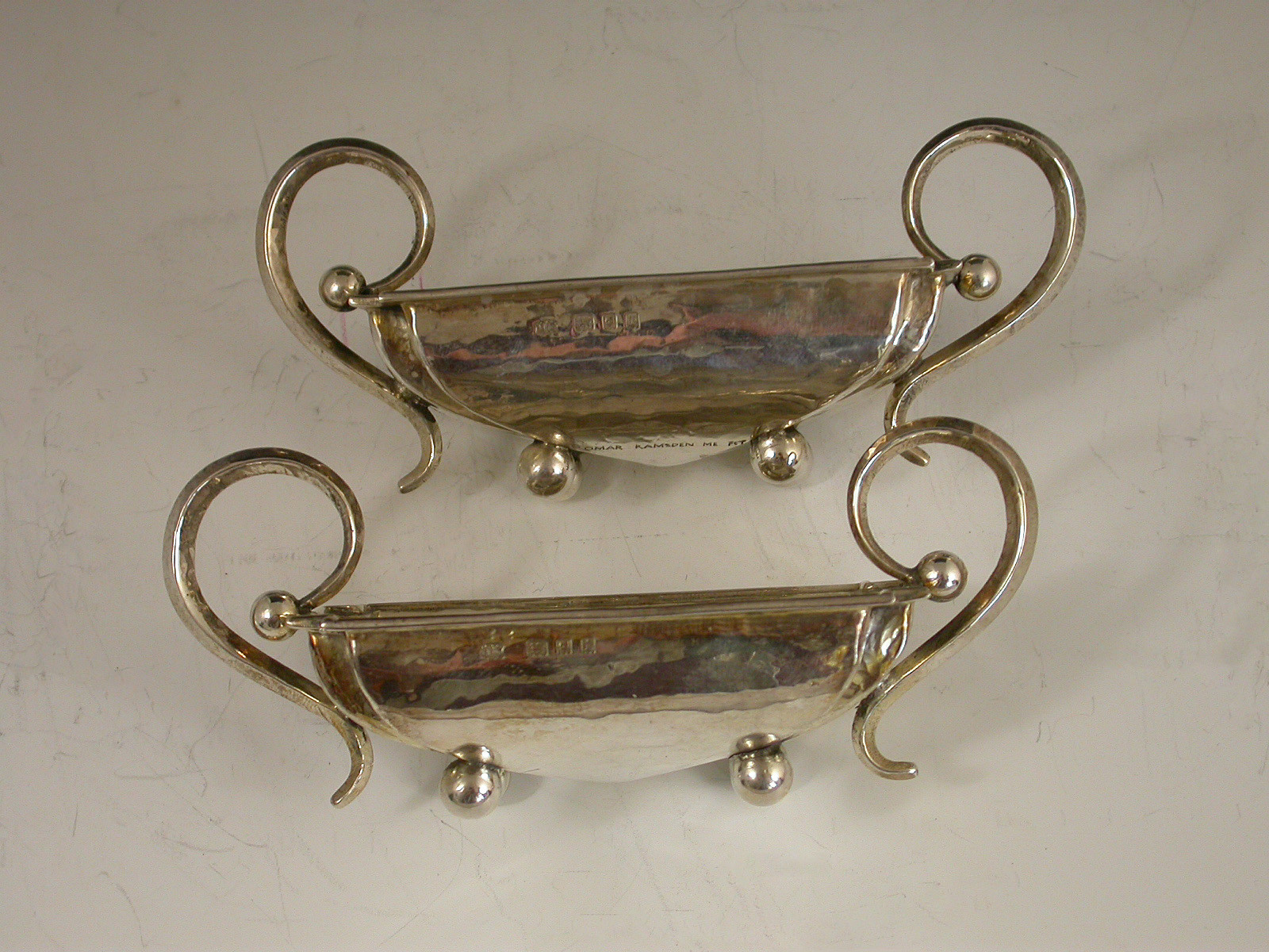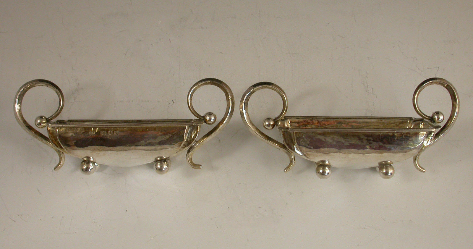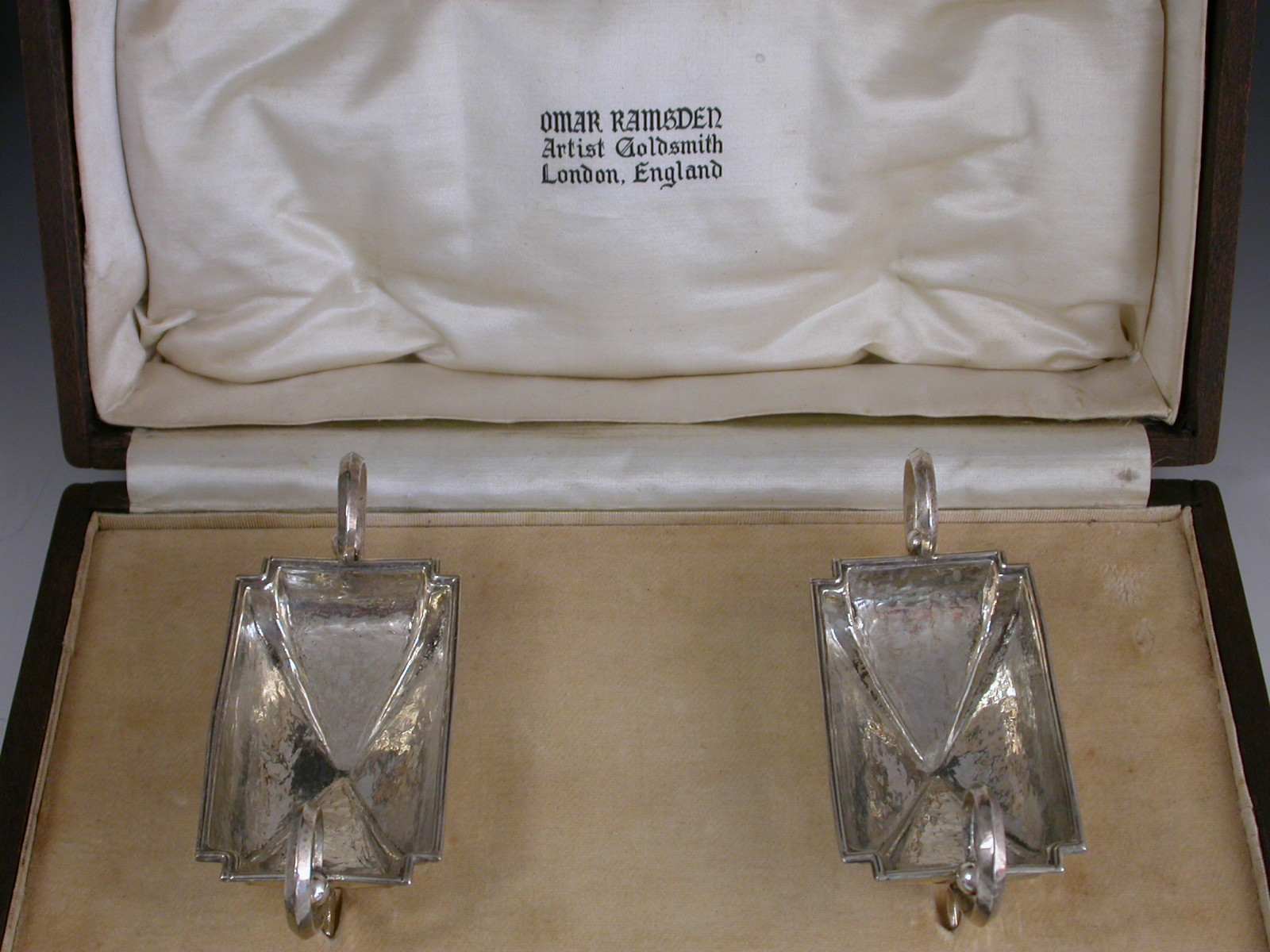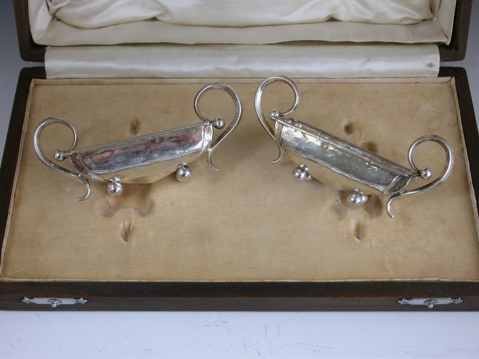 A good pair of cased George V hammered silver Salts made in the Arts & Crafts style, of shaped rectangular form with scrolled handles and four ball feet. Complete with original silk and velvet lined fitted wooden case with silver plated clasps.