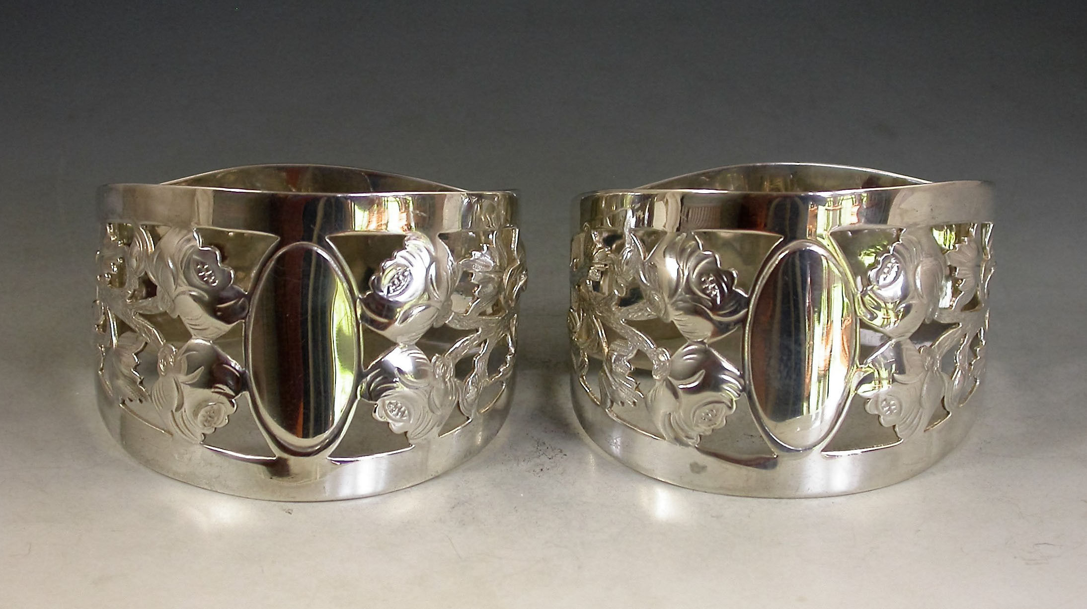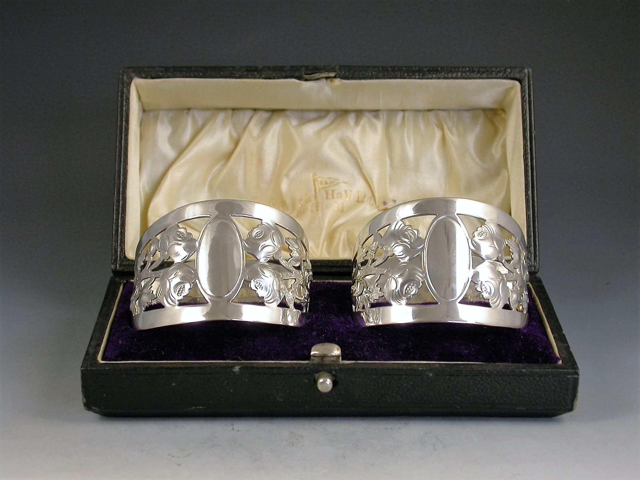 Cased Pair George V Pierced Silver Napkin Rings - English Roses