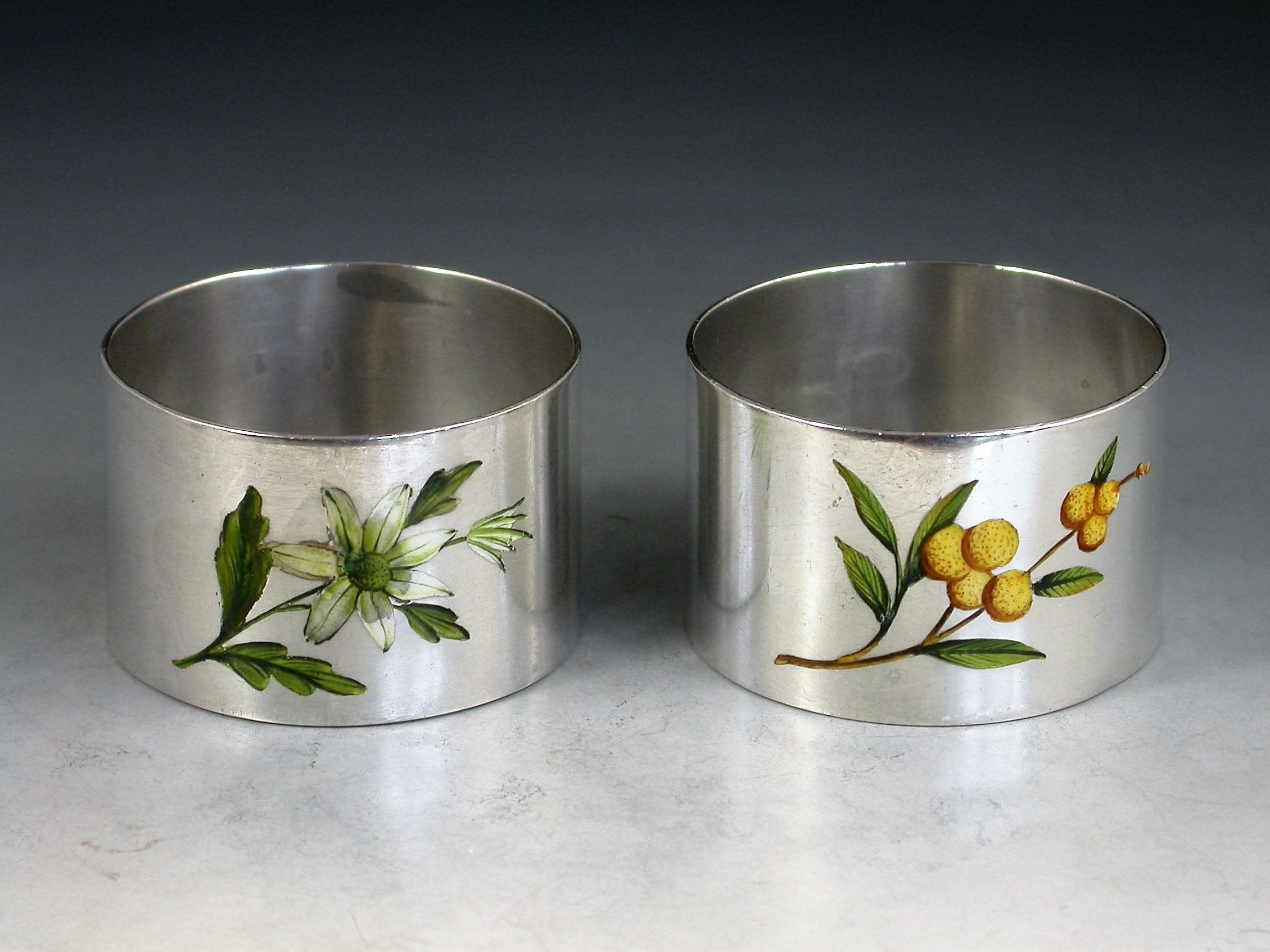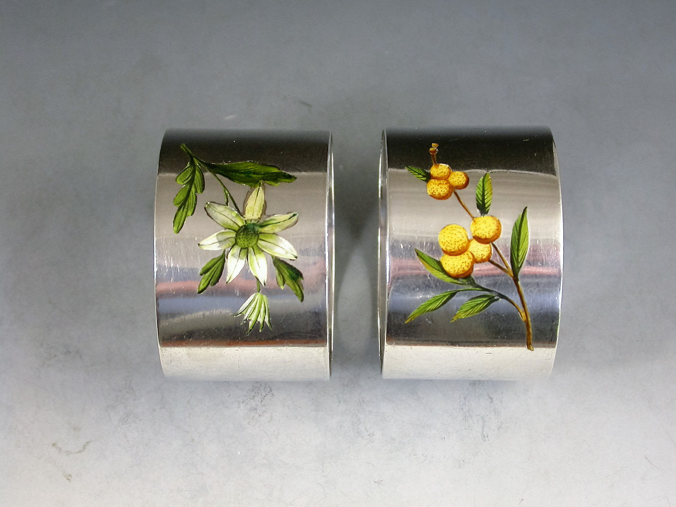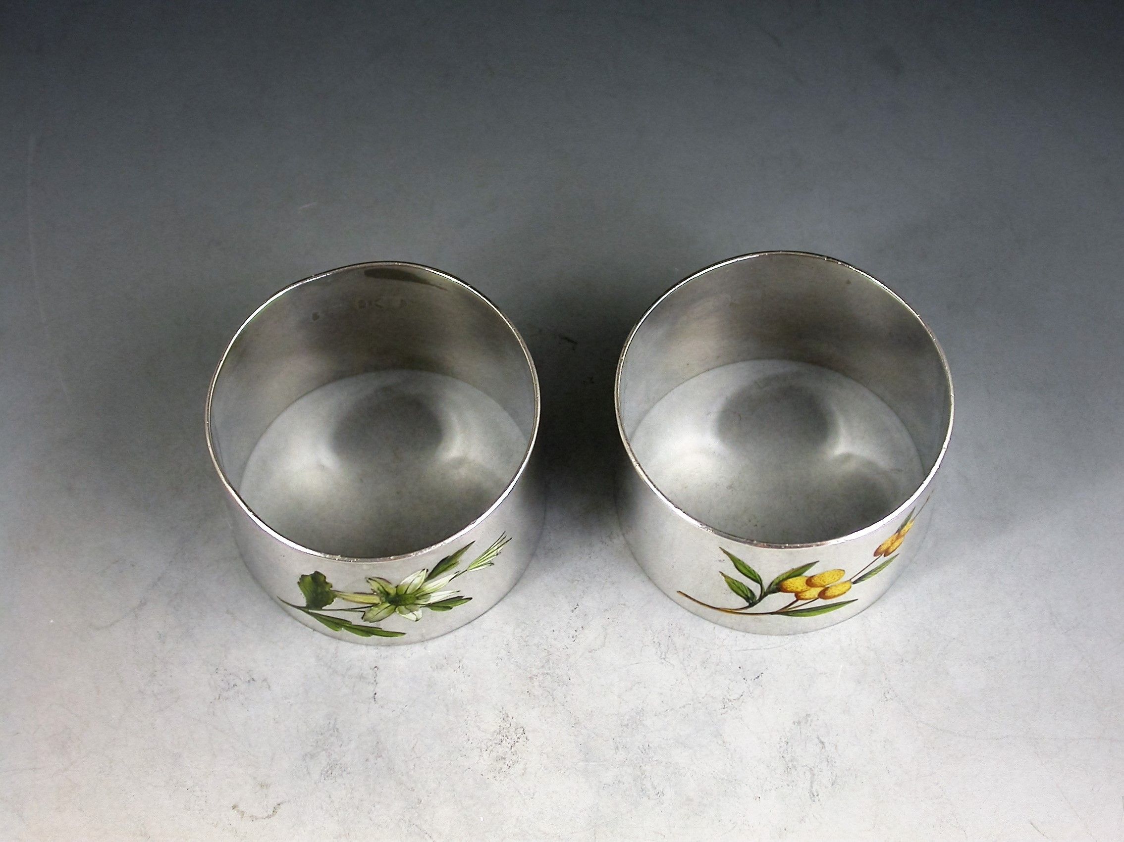 A good quality pair of early 20th century silver Napkin Rings of plain circular form inset with enamelled flowers.