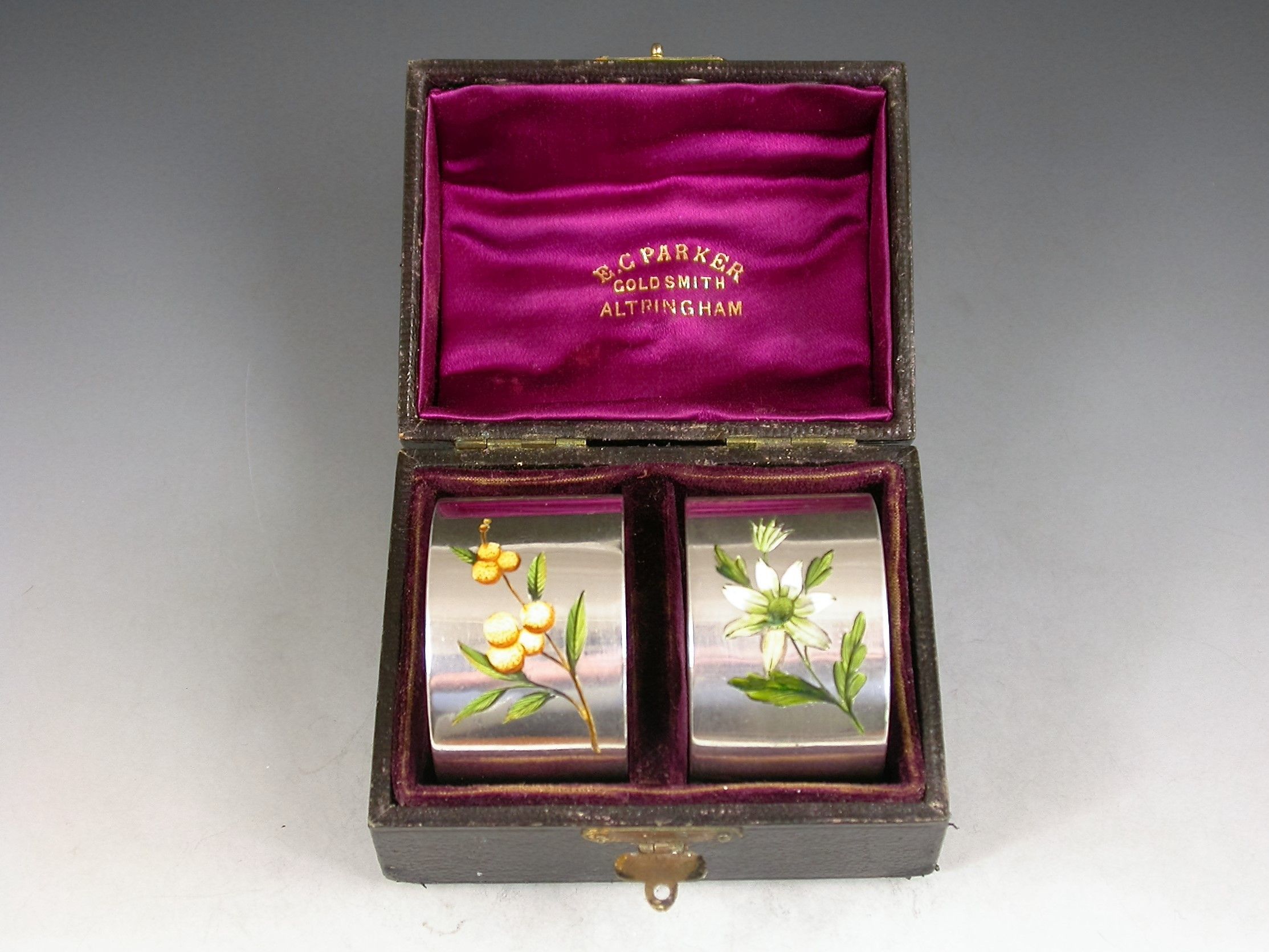 Cased Pair George V Silver & Enamel Flowers Napkin Rings