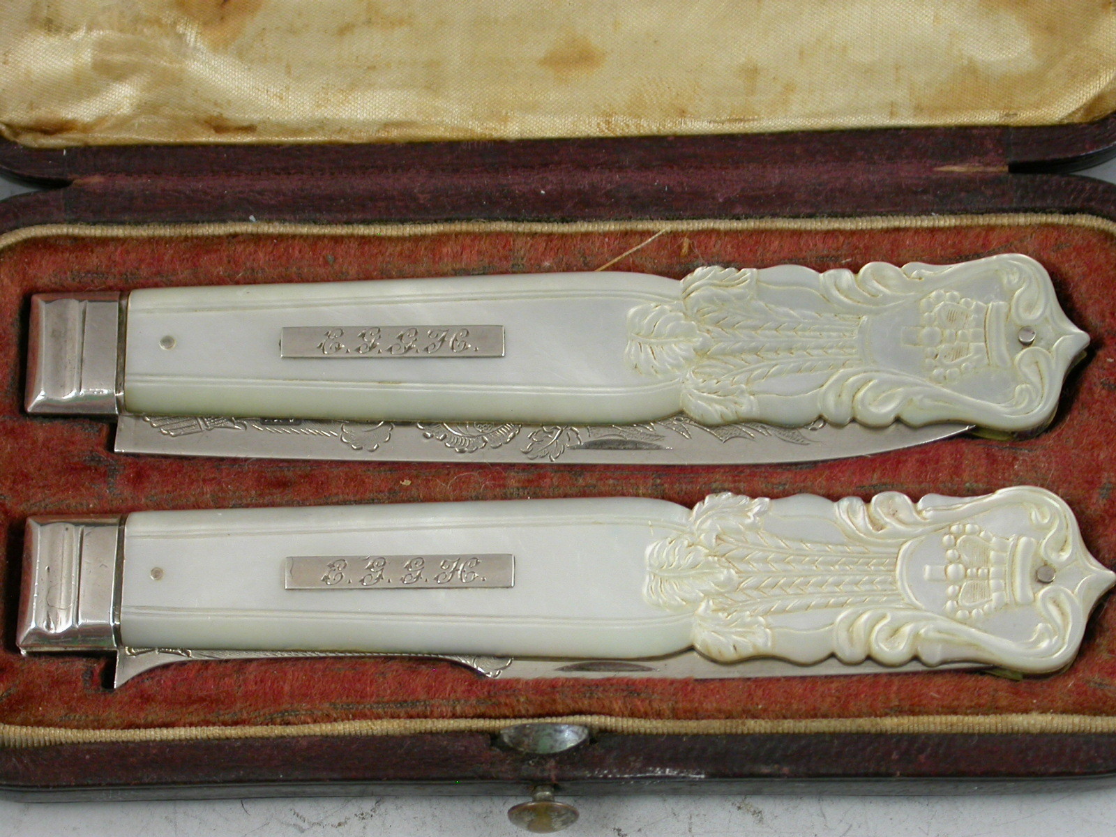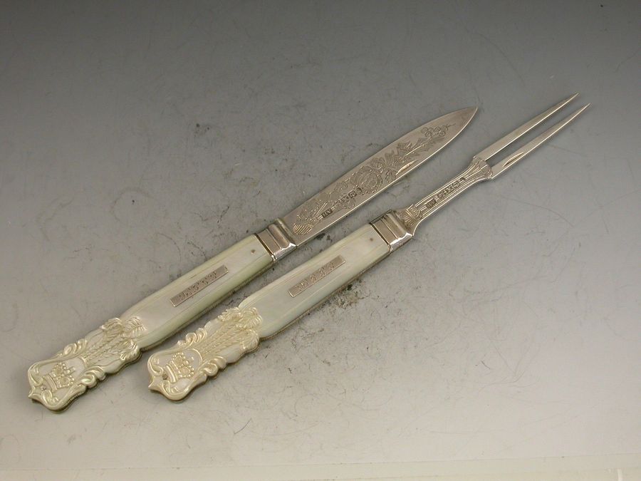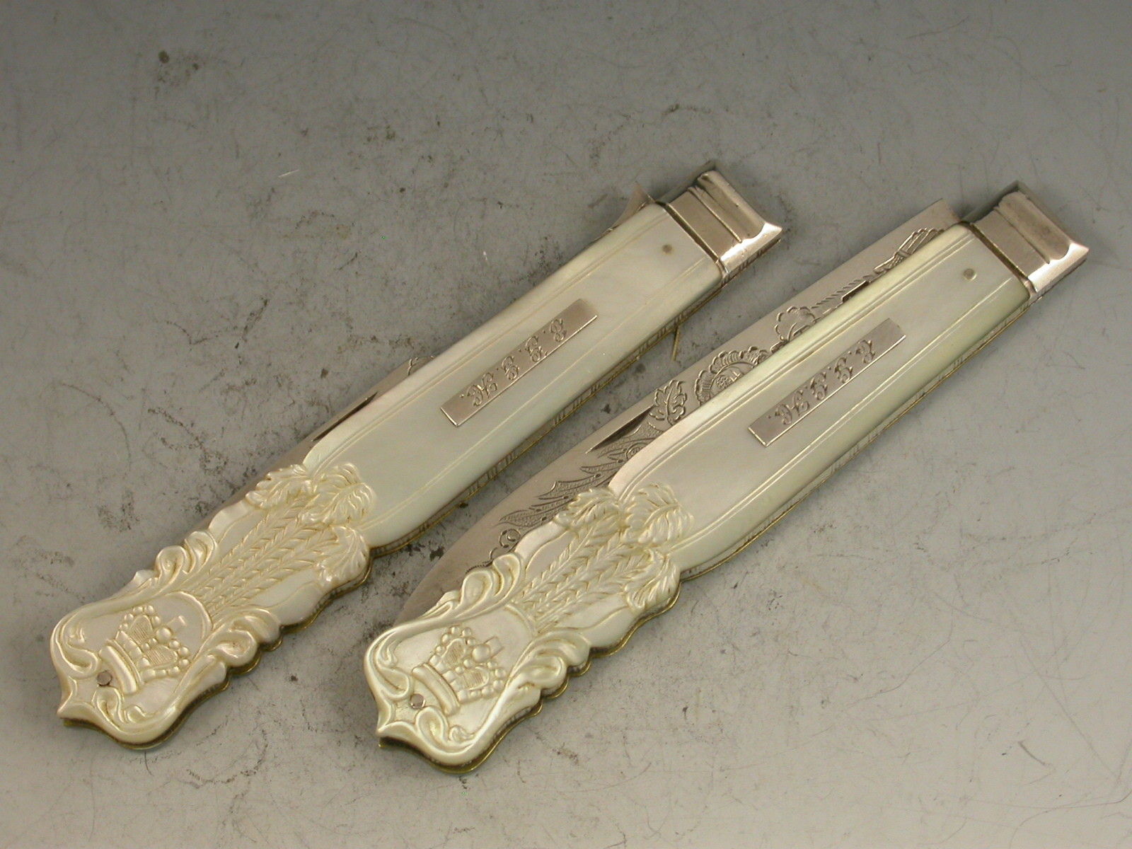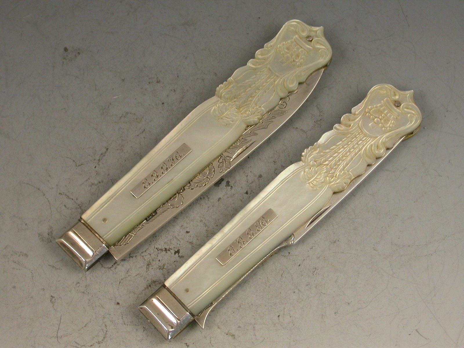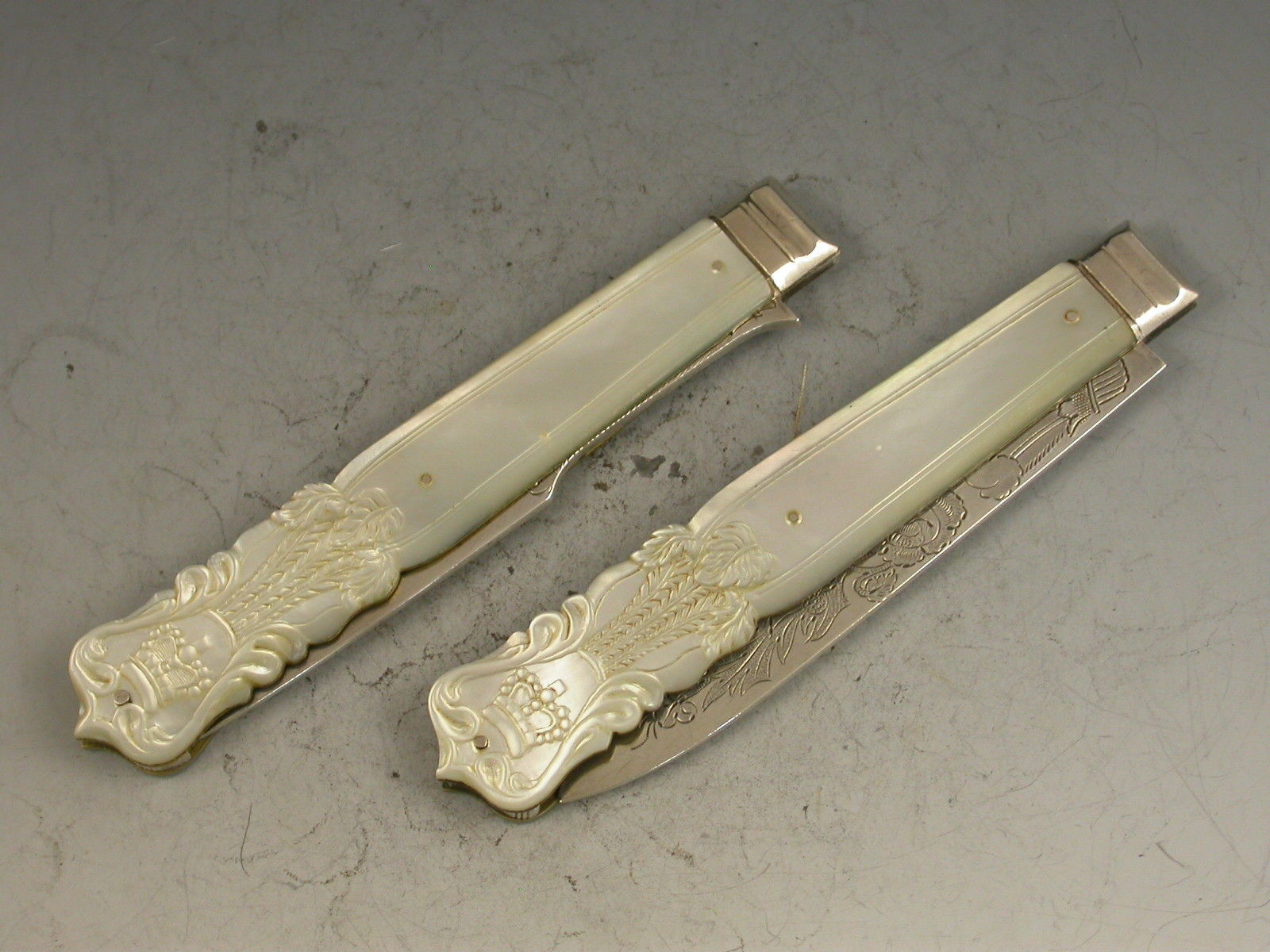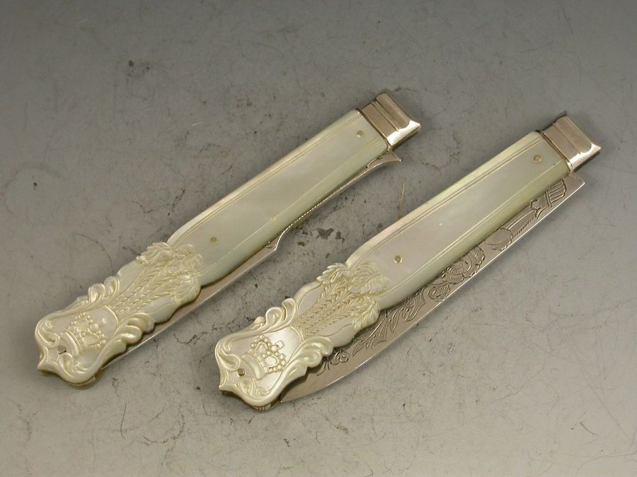 An extremely fine quality and rare pair of Victorian cased silver and mother of pearl folding Fruit Knife and Fork, the shaped mother of pearl handles engraved with the Prince of Wales feathers and the Royal Crown and inset with rectangular silver cartouches engraved with the initials E.G.G.H. The silver blade of the fork also engraved a stylised Prince of Wales feathers and the knife with the feathers and the Rose of England, the Thistle of Scotland and the Shamrock of Ireland.