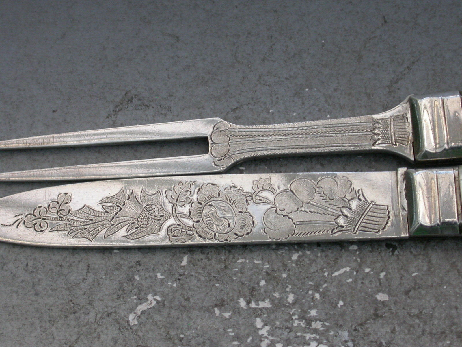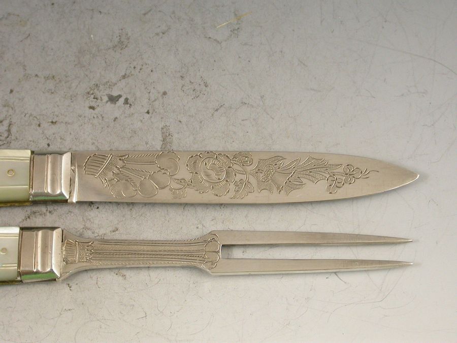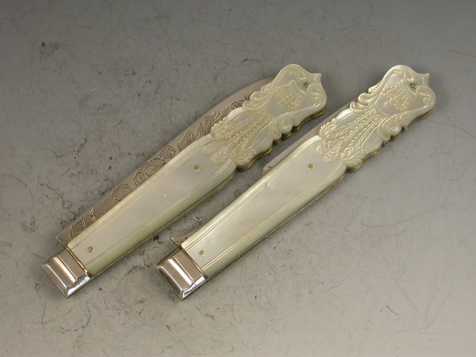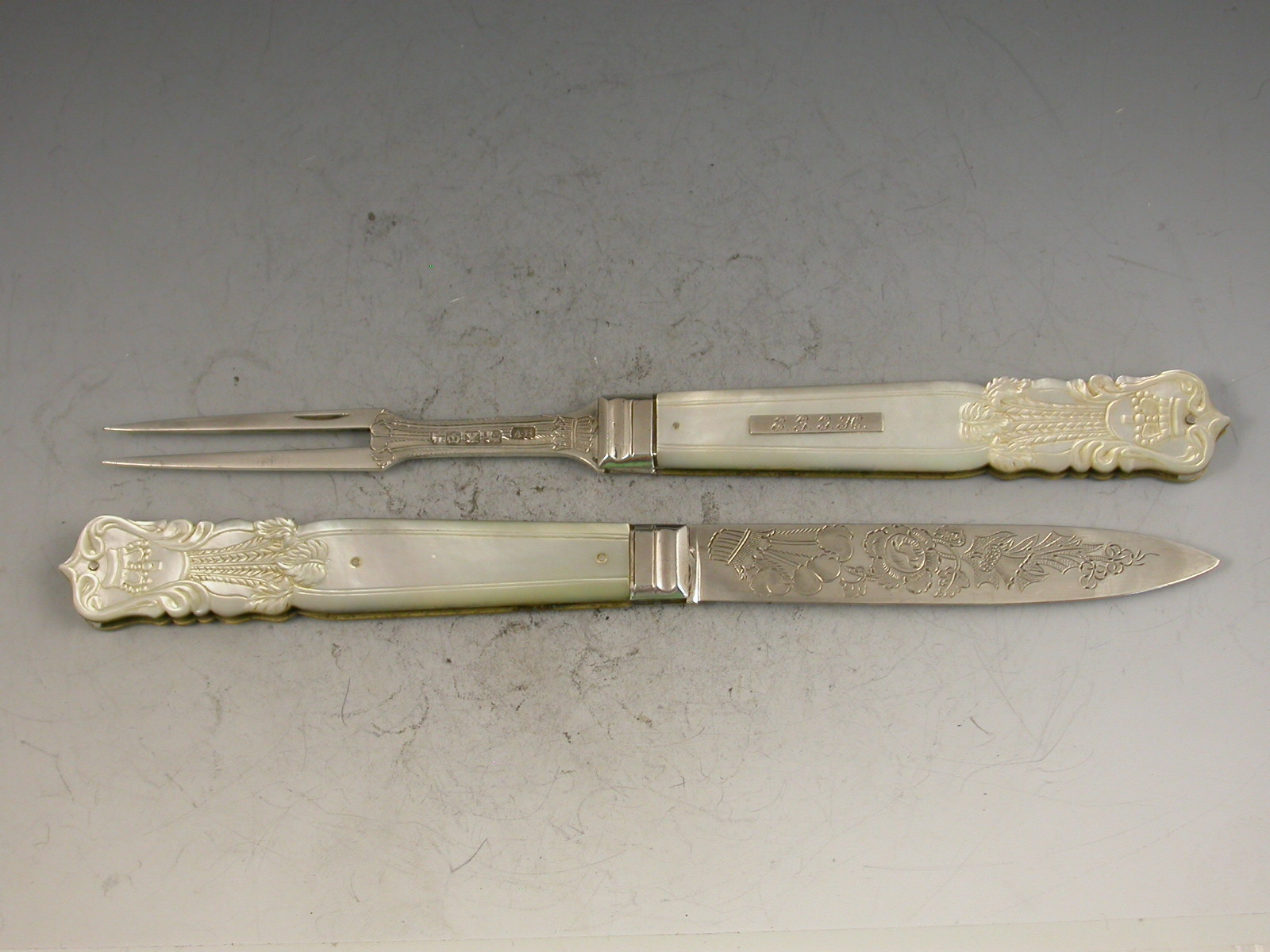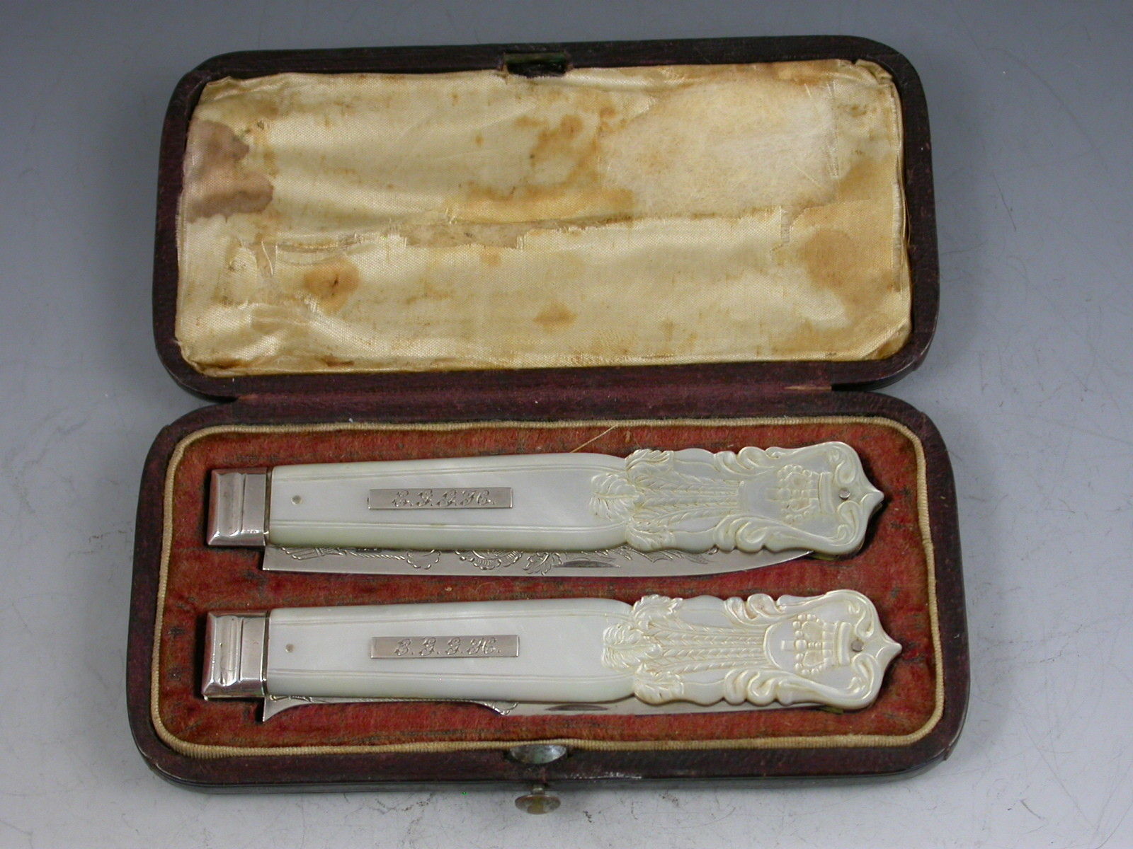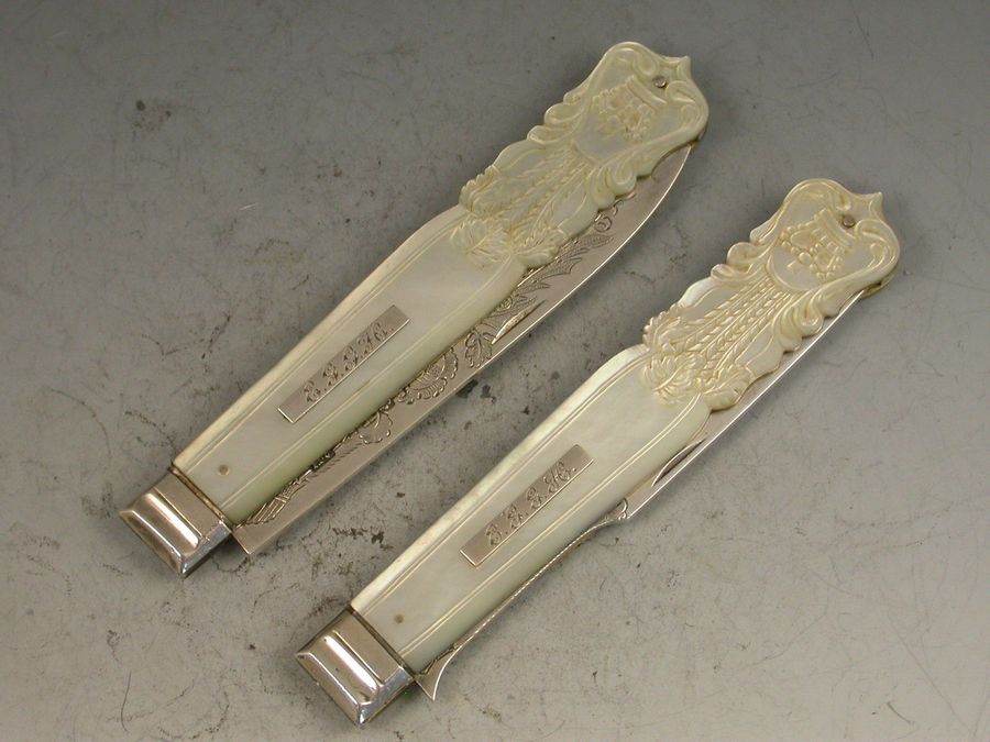 An extremely fine quality and rare pair of Victorian cased silver and mother of pearl folding Fruit Knife and Fork, the shaped mother of pearl handles engraved with the Prince of Wales feathers and the Royal Crown and inset with rectangular silver cartouches engraved with the initials E.G.G.H. The silver blade of the fork also engraved a stylised Prince of Wales feathers and the knife with the feathers and the Rose of England, the Thistle of Scotland and the Shamrock of Ireland.