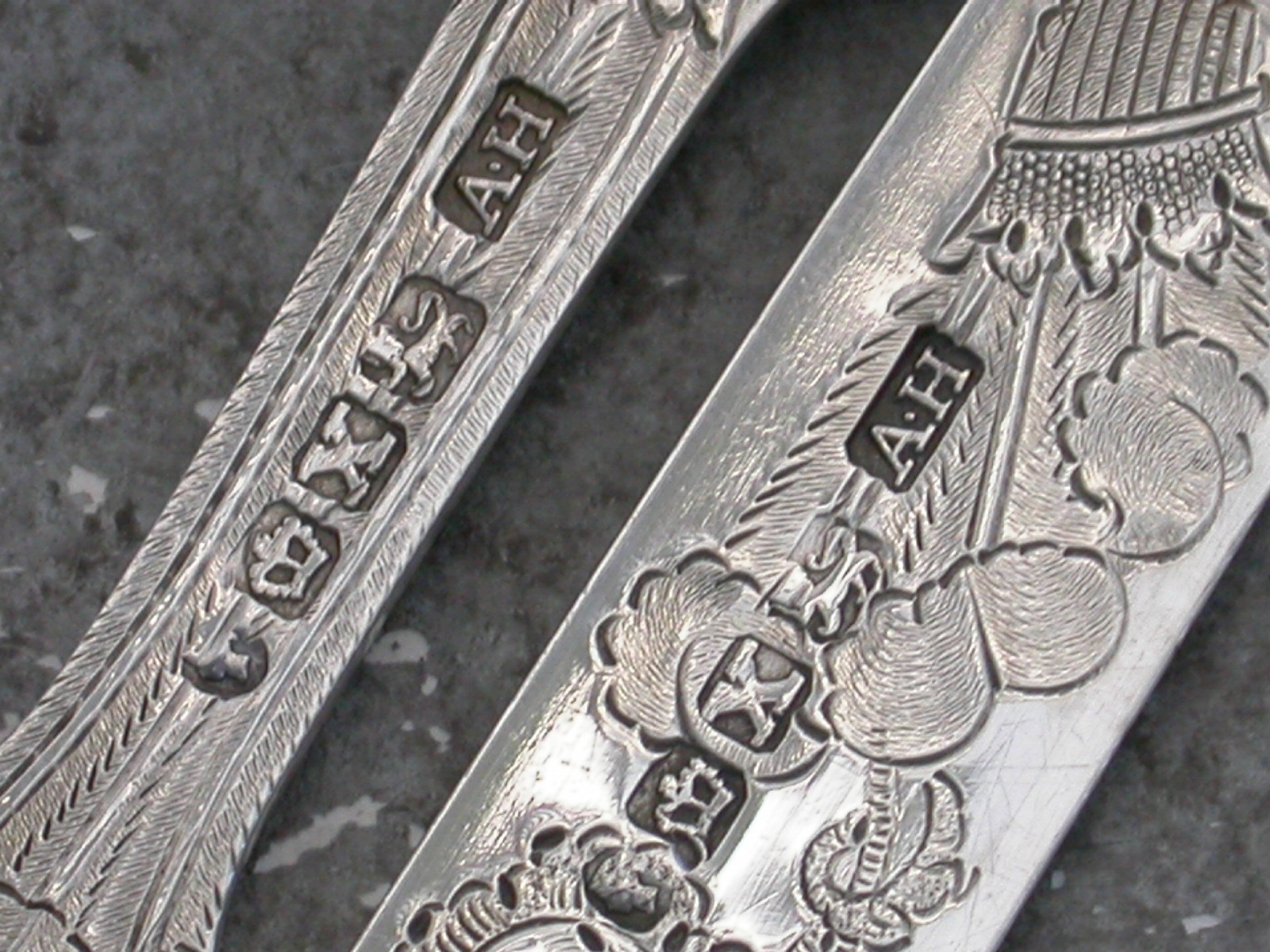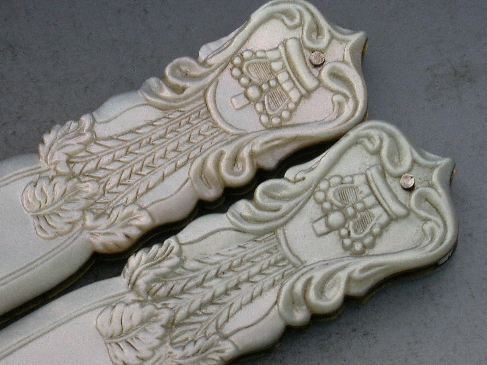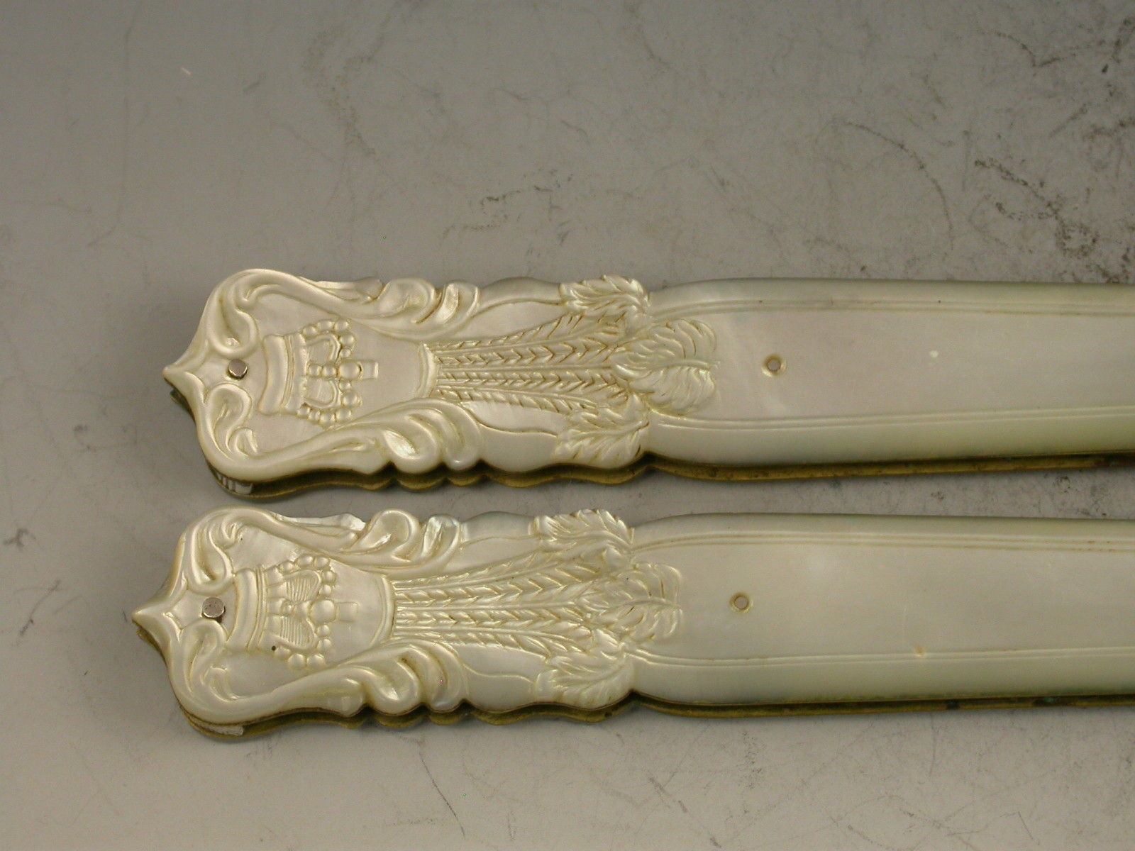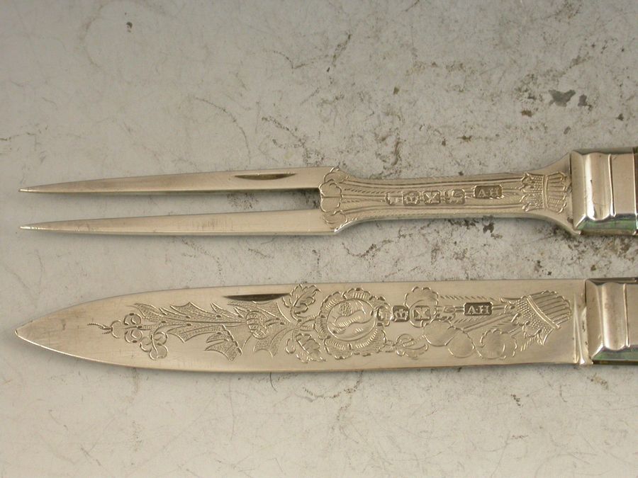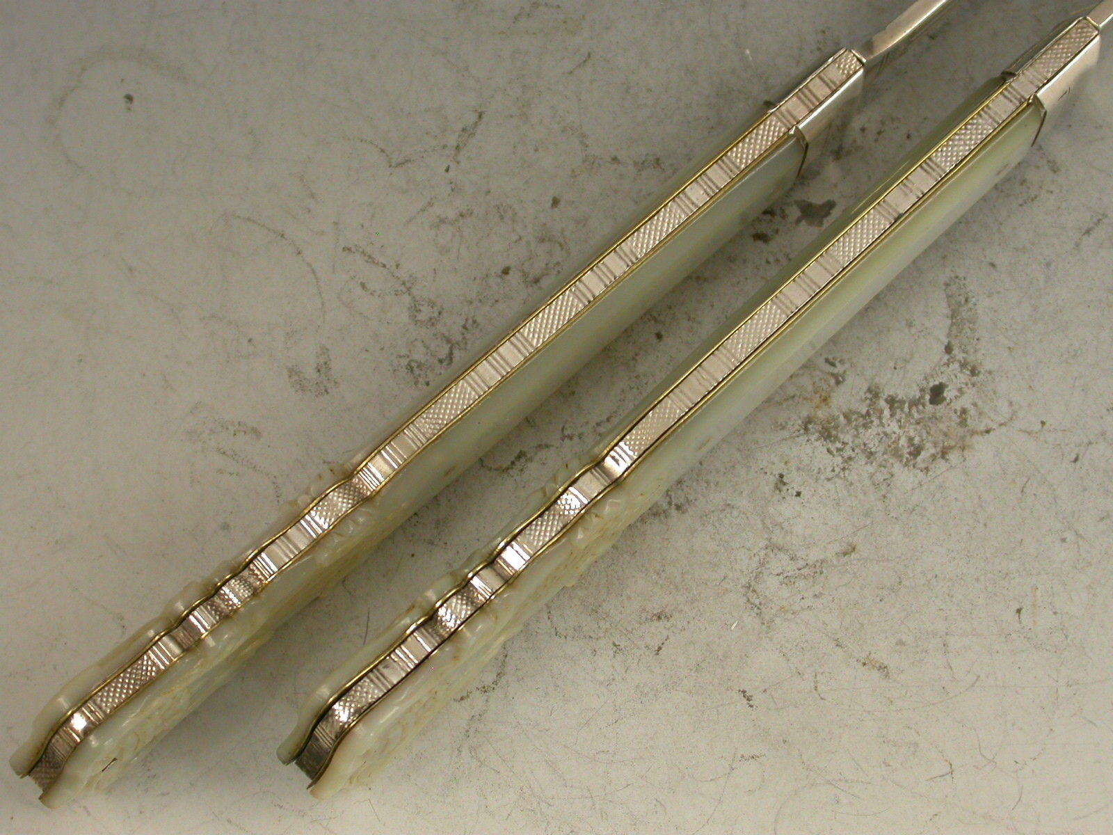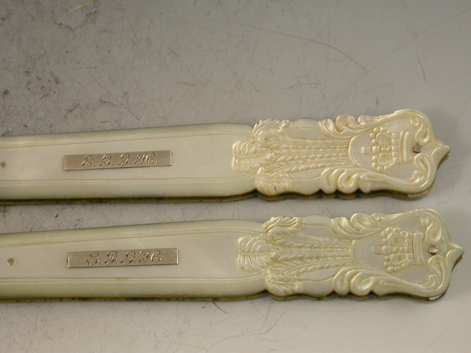 An extremely fine quality and rare pair of Victorian cased silver and mother of pearl folding Fruit Knife and Fork, the shaped mother of pearl handles engraved with the Prince of Wales feathers and the Royal Crown and inset with rectangular silver cartouches engraved with the initials E.G.G.H. The silver blade of the fork also engraved a stylised Prince of Wales feathers and the knife with the feathers and the Rose of England, the Thistle of Scotland and the Shamrock of Ireland.