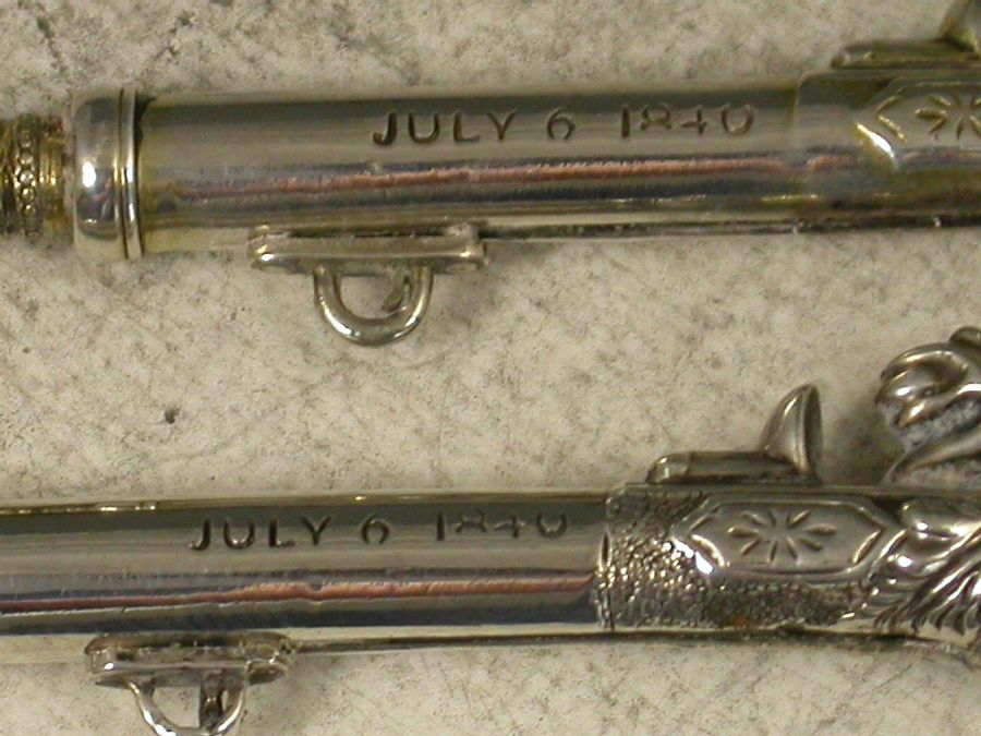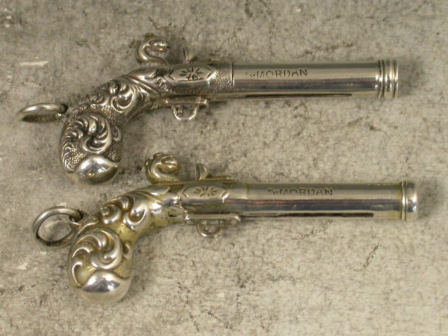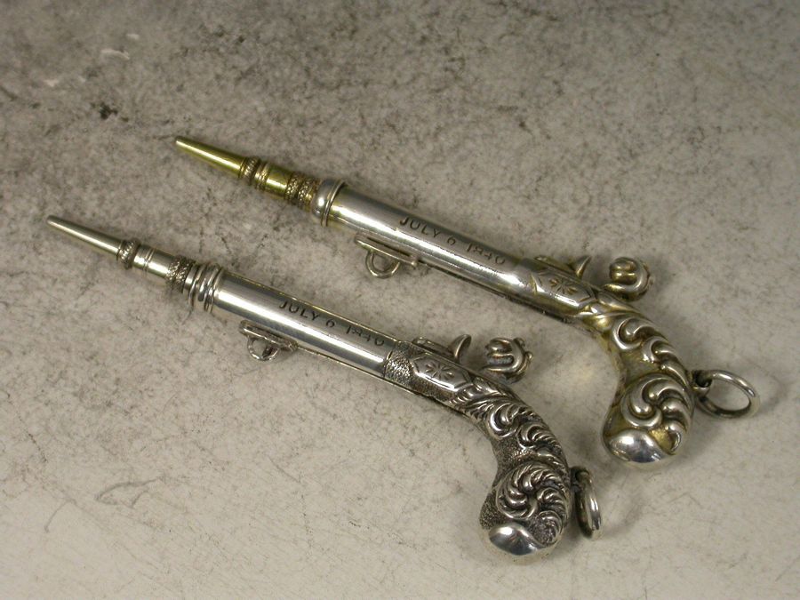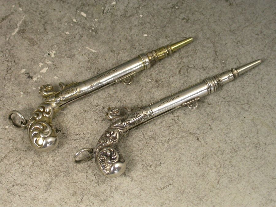 A fine and rare pair of Victorian novelty silver Propelling Pencils made in the form of Percussion Dueling Pistols, the trigger guards sliding to extend the pencil. Attached suspension rings. Complete with associated silk and velvet lined leather case. One pistol is gilded to differentiate.