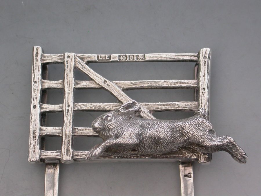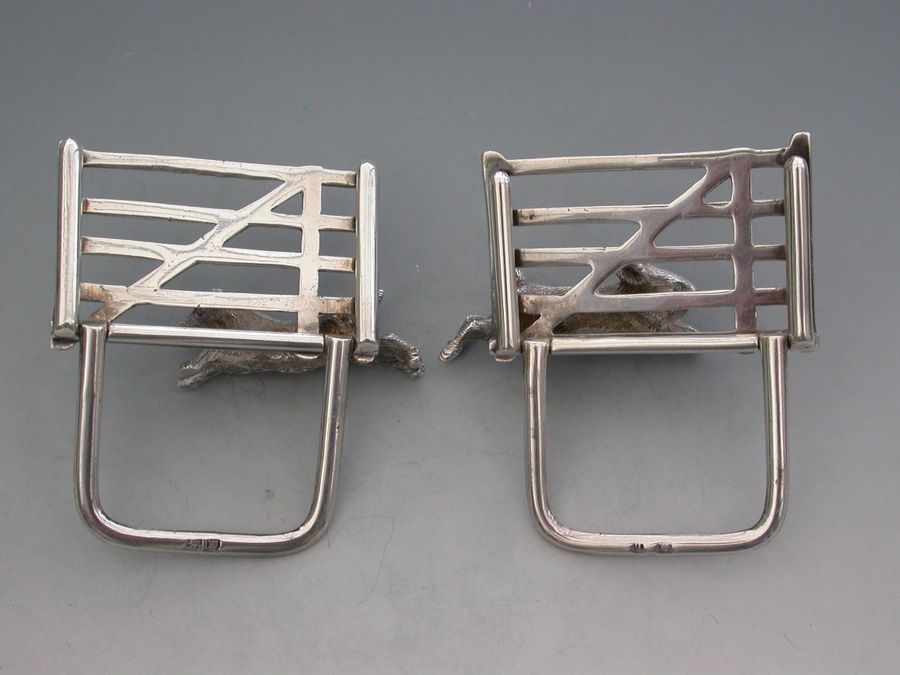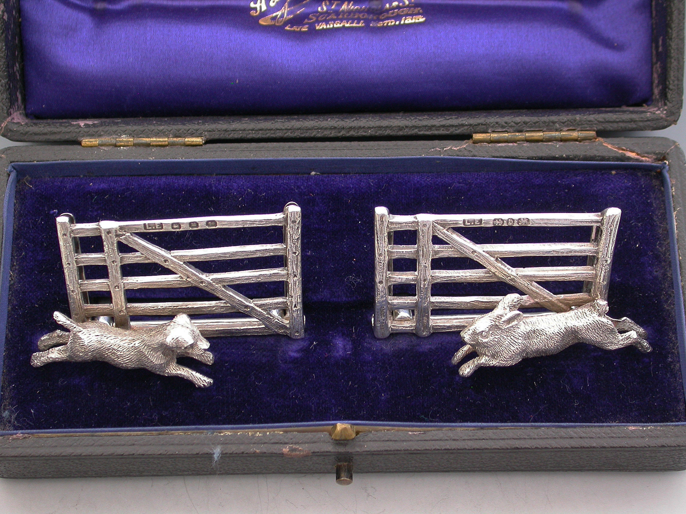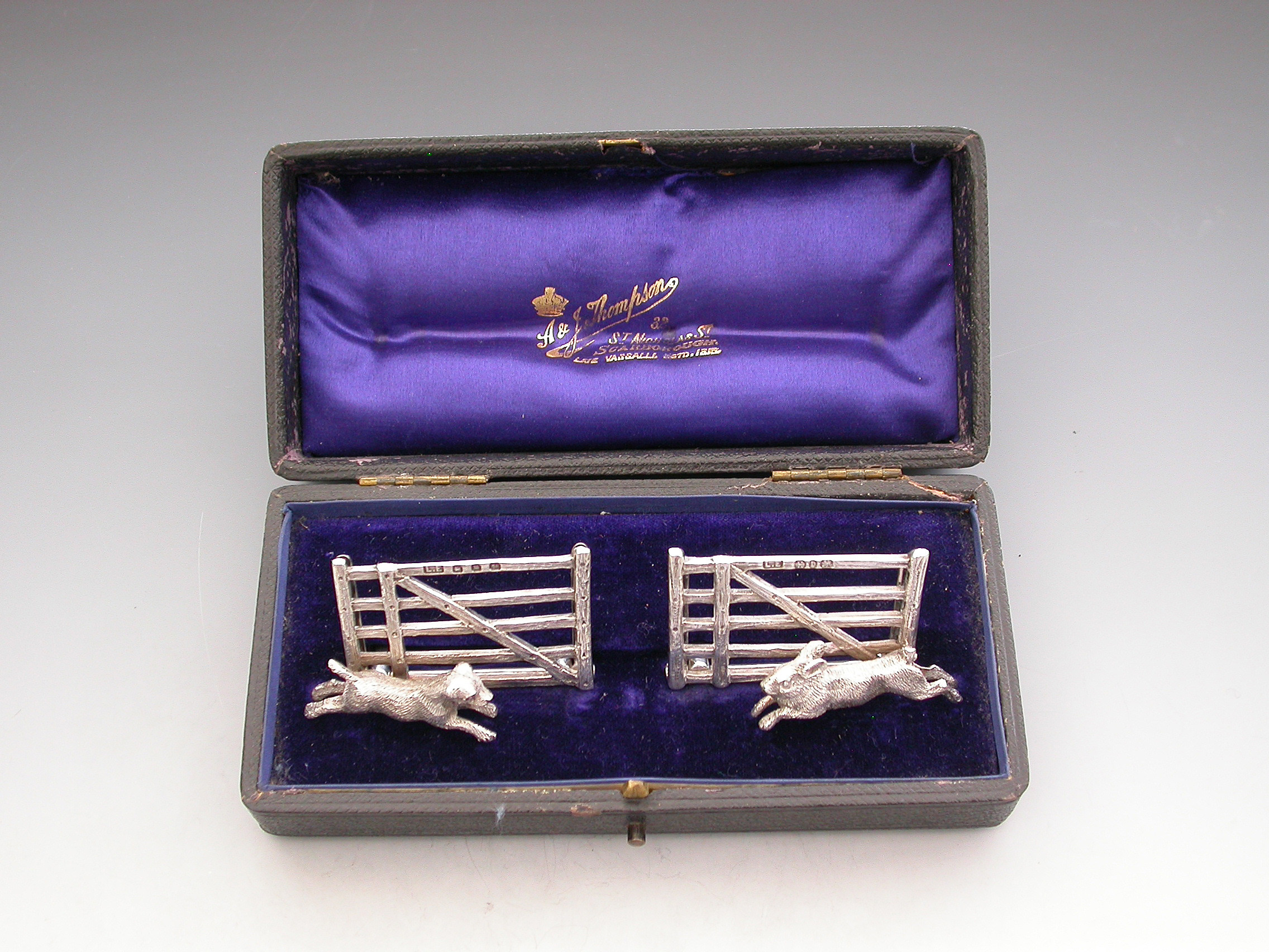 A nice quality pair of Victorian novelty silver Menu Holders made in the form of a Rabbit and a Terrier running in front of wooden five bar gates, supported by hinged 'D' shaped stands. Complete with original silk and velvet lined leather case.