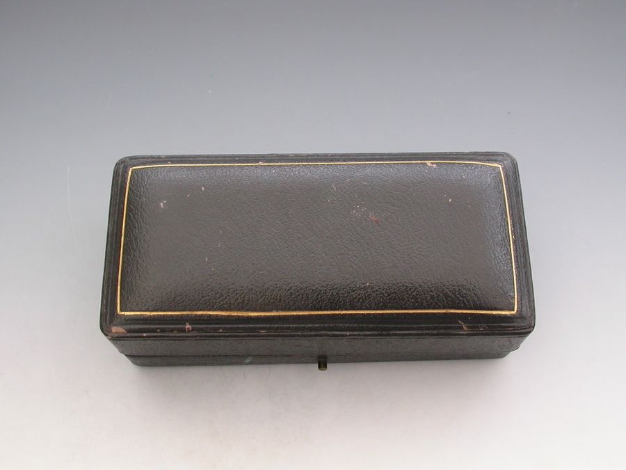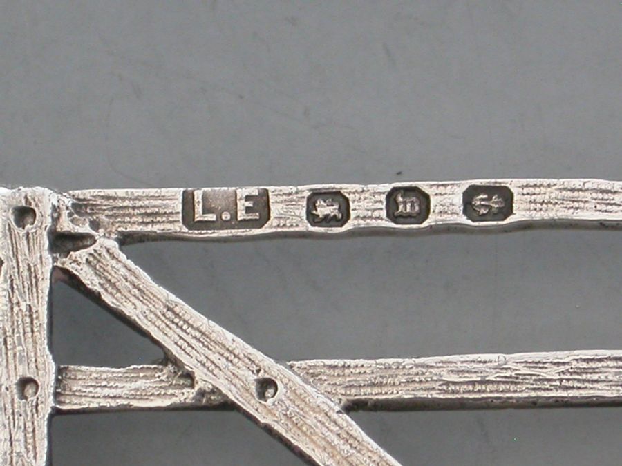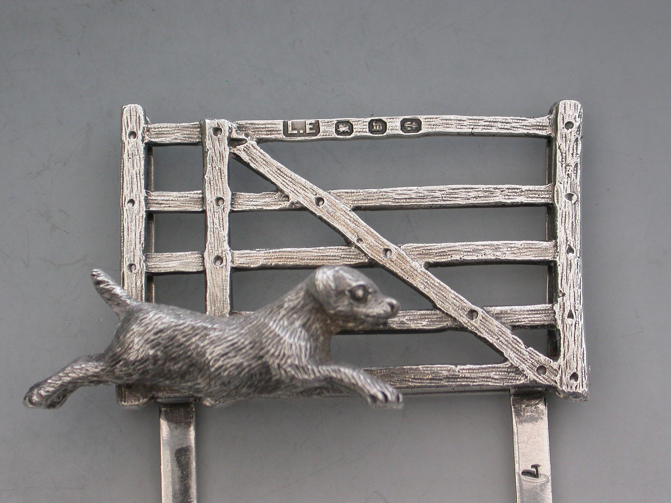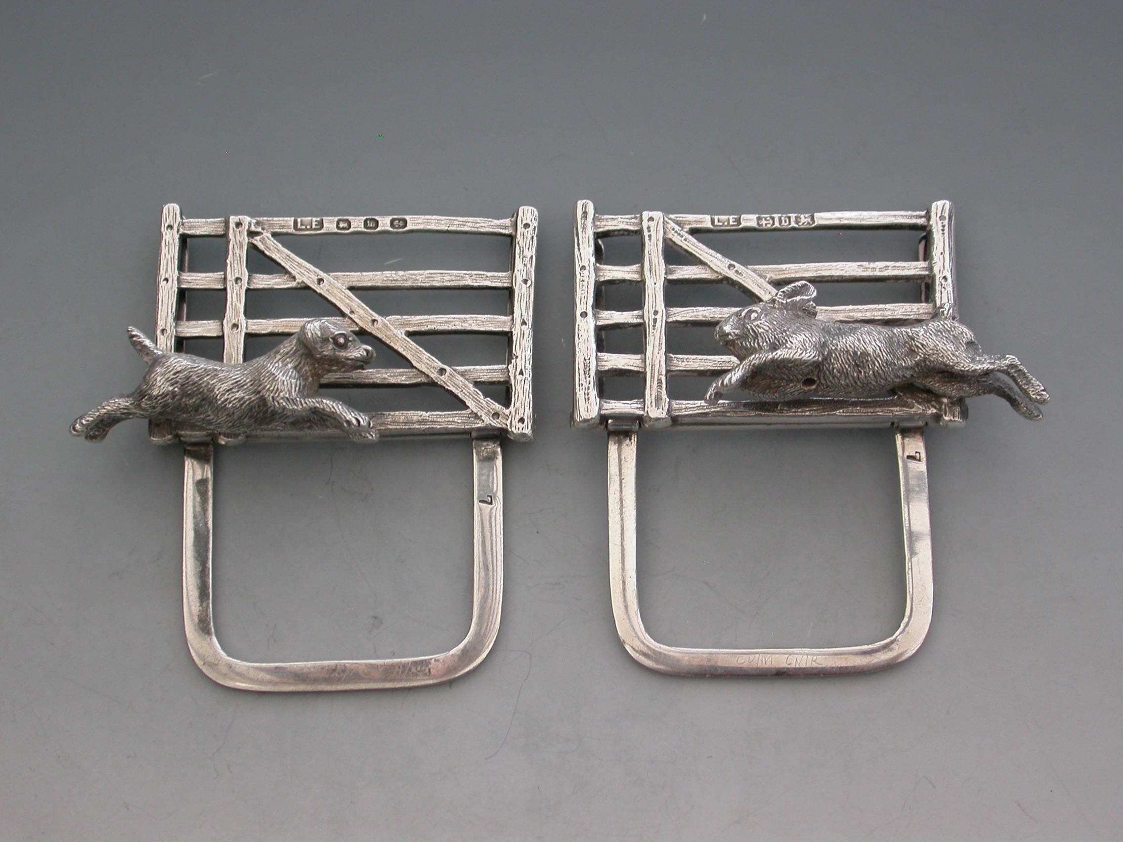 A nice quality pair of Victorian novelty silver Menu Holders made in the form of a Rabbit and a Terrier running in front of wooden five bar gates, supported by hinged 'D' shaped stands. Complete with original silk and velvet lined leather case.