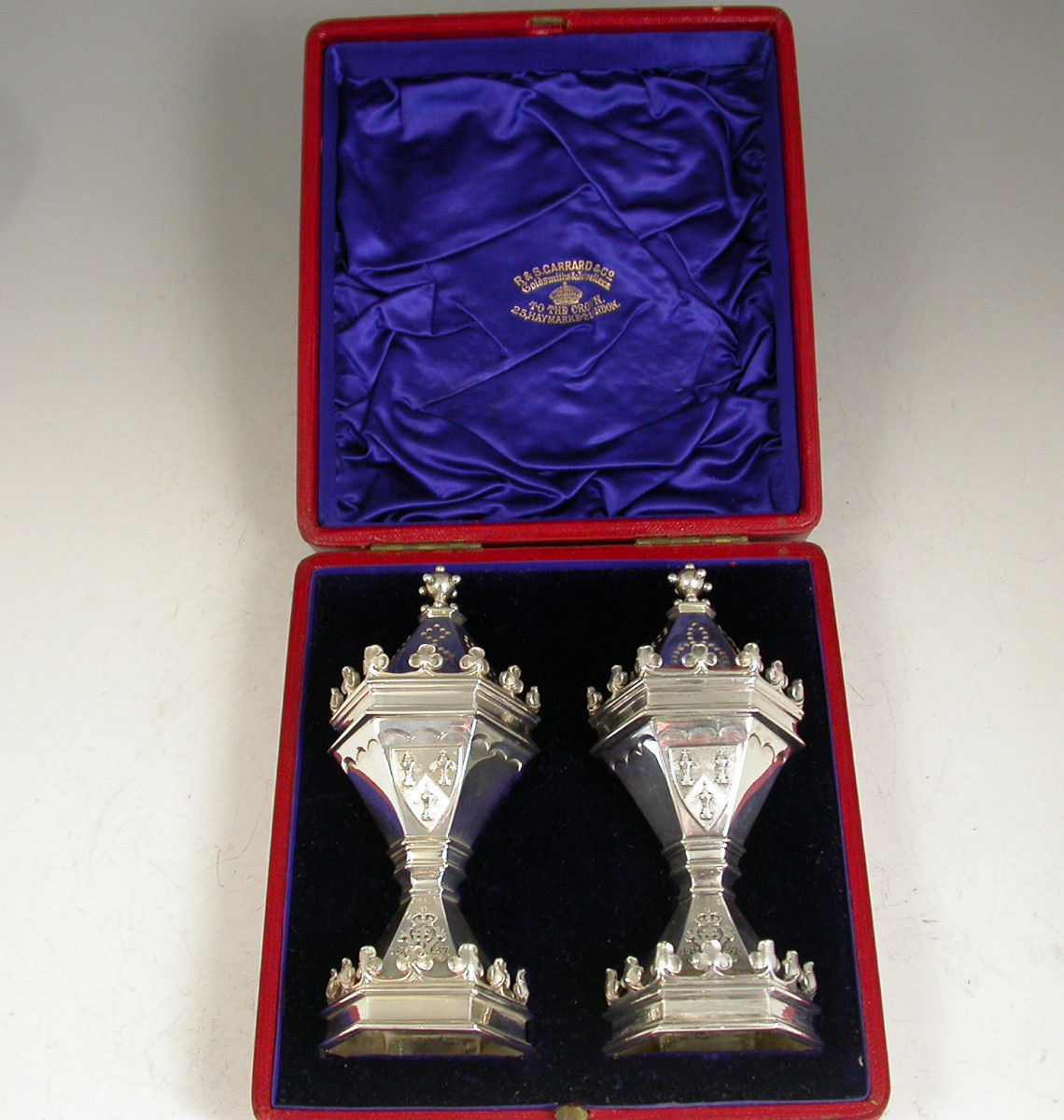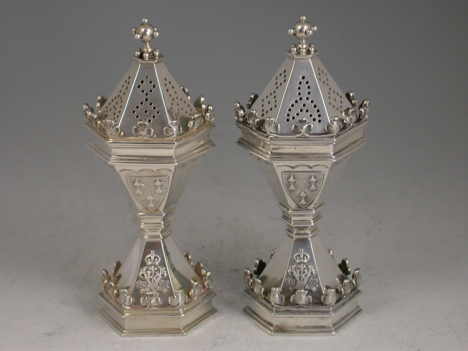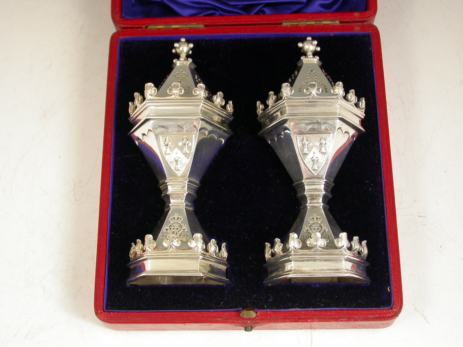 A fine quality cased pair of Victorian silver Master Salts / Peppers made in the form of the Salters' Livery Company Master Salt with their applied Coat of Arms, the bases also applied with the cypher of Queen Victoria and dated 1837-1897 (made to commemorate the Jubilee in 1897), silver gilt interiors.