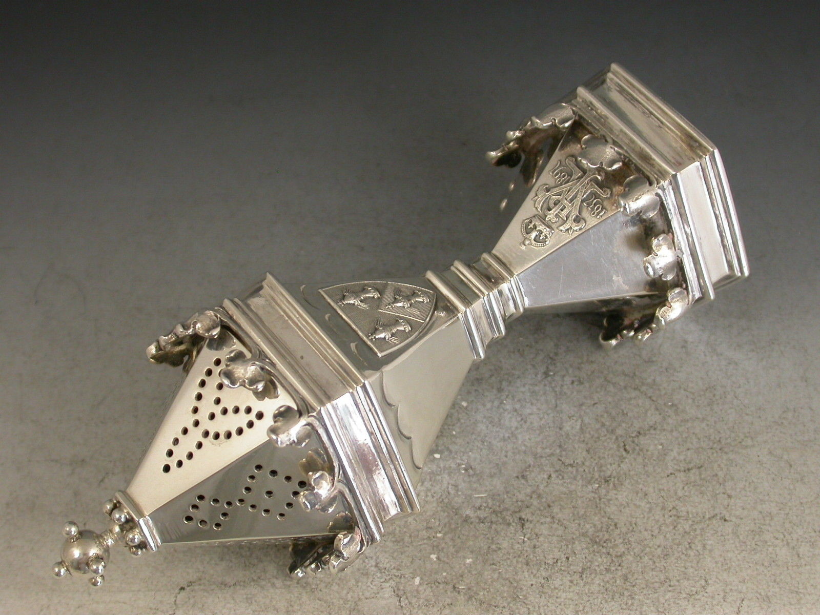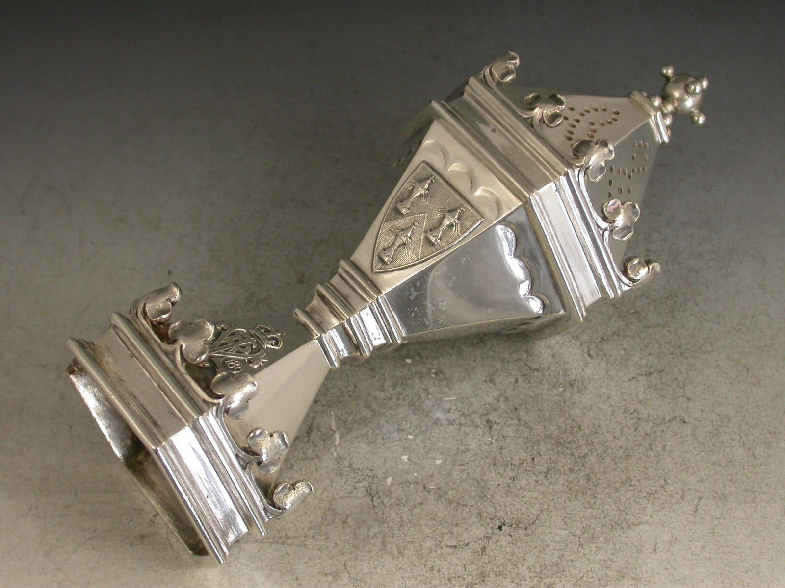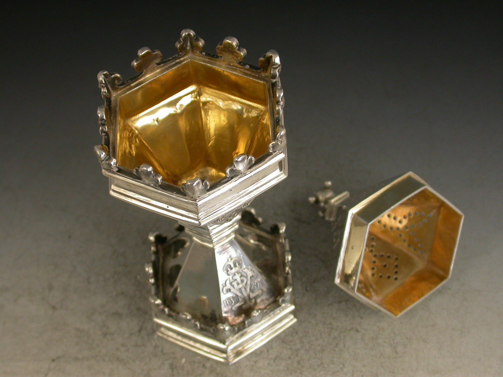 A fine quality cased pair of Victorian silver Master Salts / Peppers made in the form of the Salters' Livery Company Master Salt with their applied Coat of Arms, the bases also applied with the cypher of Queen Victoria and dated 1837-1897 (made to commemorate the Jubilee in 1897), silver gilt interiors.