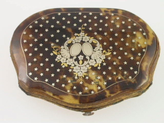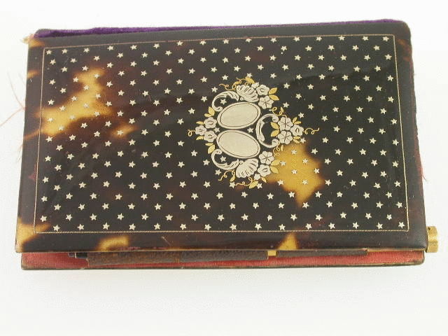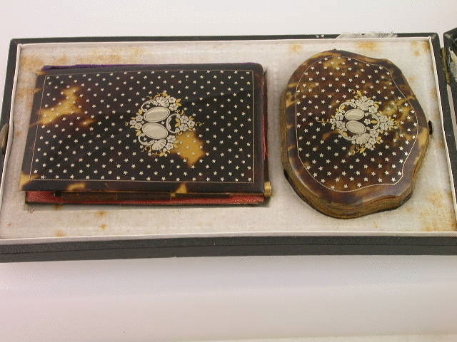 A very fine cased set of matching tortoiseshell Coin Purse and Aide Memoire, the tortoiseshell facing panels inlaid with silver stars and silver and two colour gold pique work. The coin purse has a simple push down locking clasp and has a red silk interior with concealed central compartment and leather bindings. The aide-memoir is held together by a series of leather loops through which the original gilt metal pencil is inserted and has a purple velvet spine. The aide-memoir contains an original printed souvenir notebook and calendar within a red silk binding. The original fitted leather case has a retailers label to the base marked BUFFET Palais Royal.