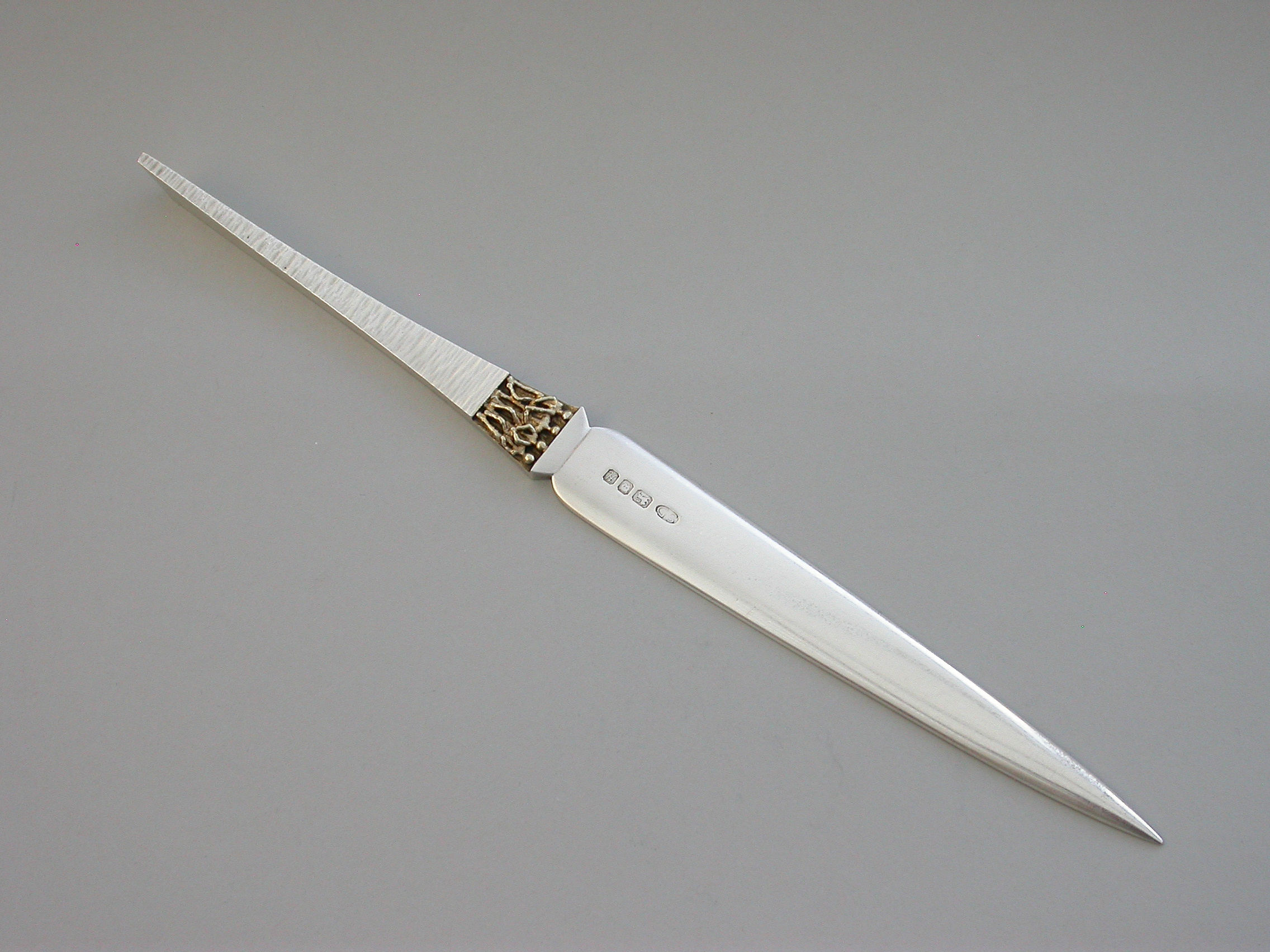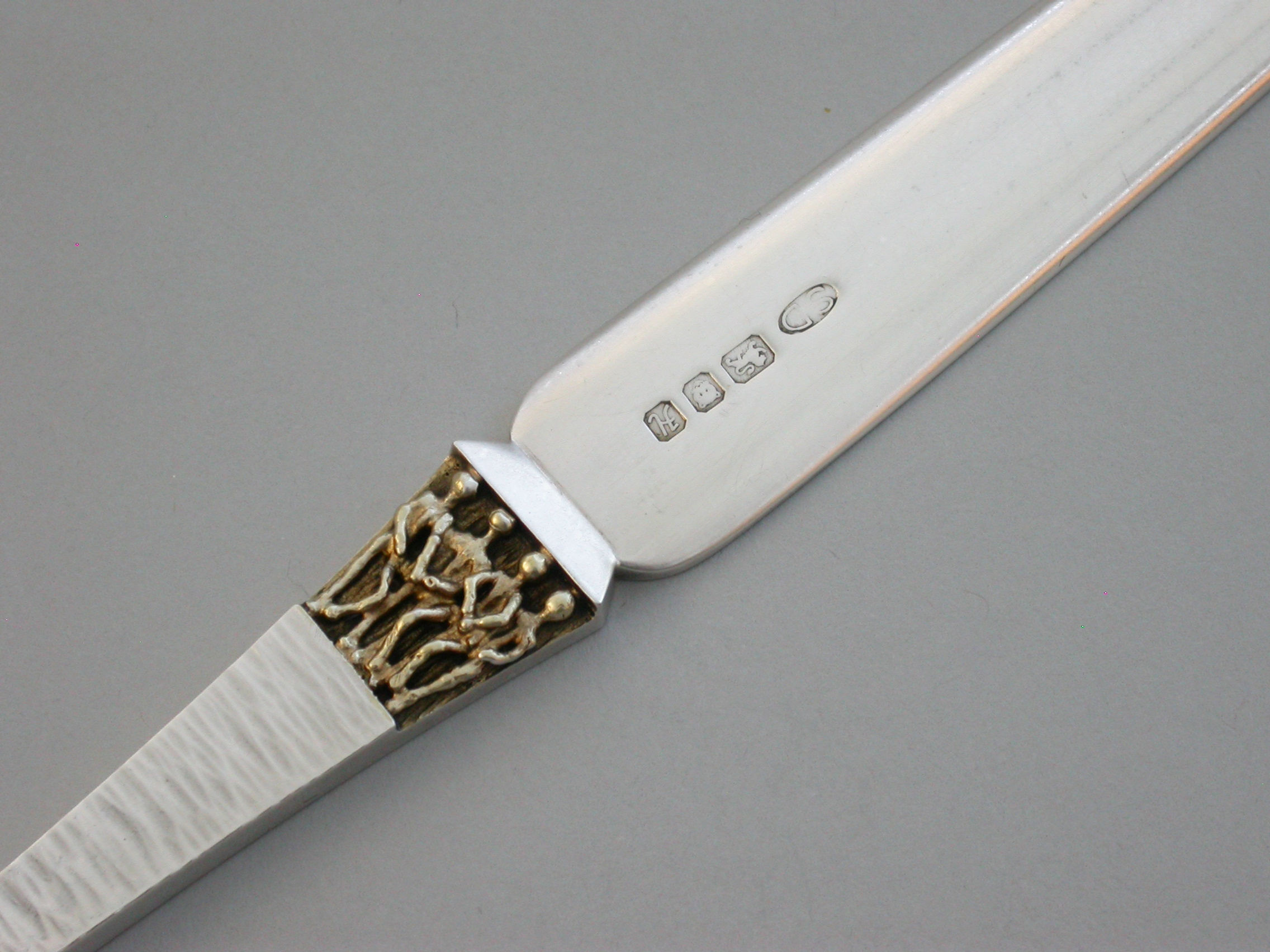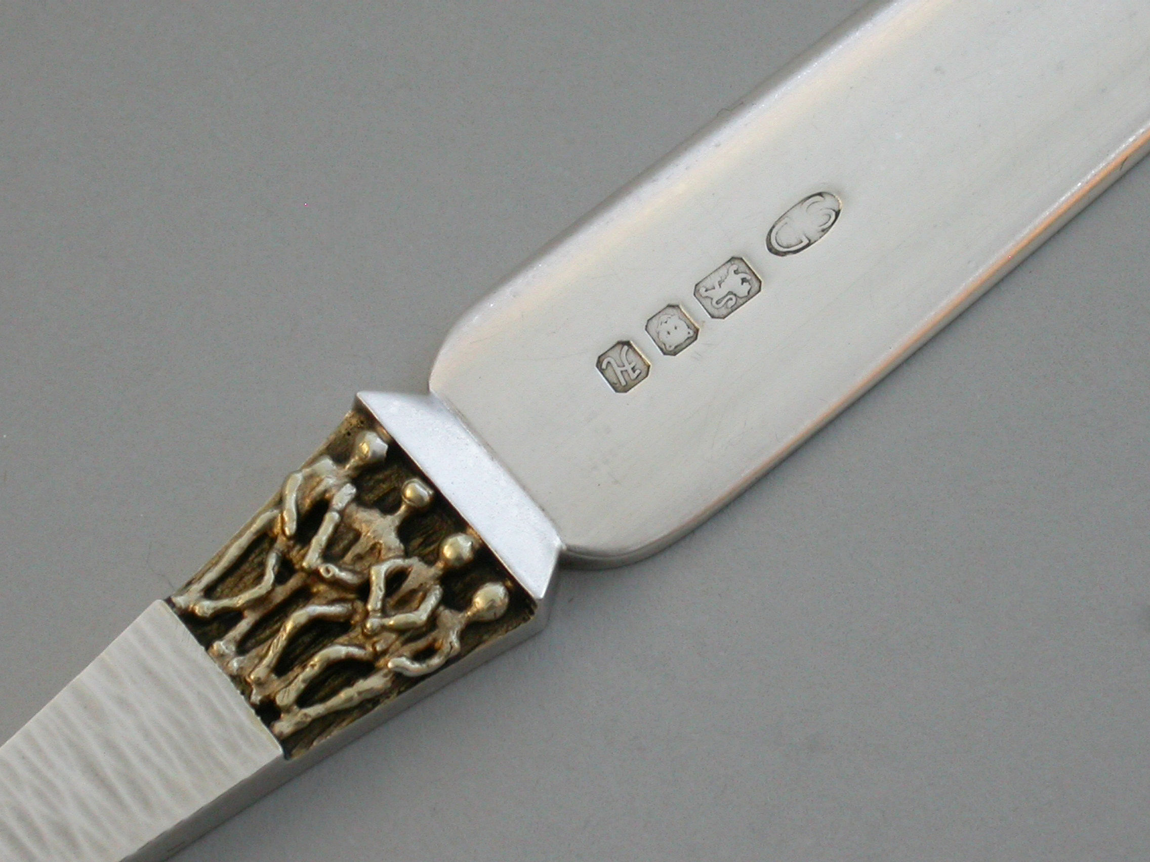 A fine quality post war silver Letter Opener with plain tapering blade and bark effect shaped handle, a gilded panel of naive figures at the hilt.