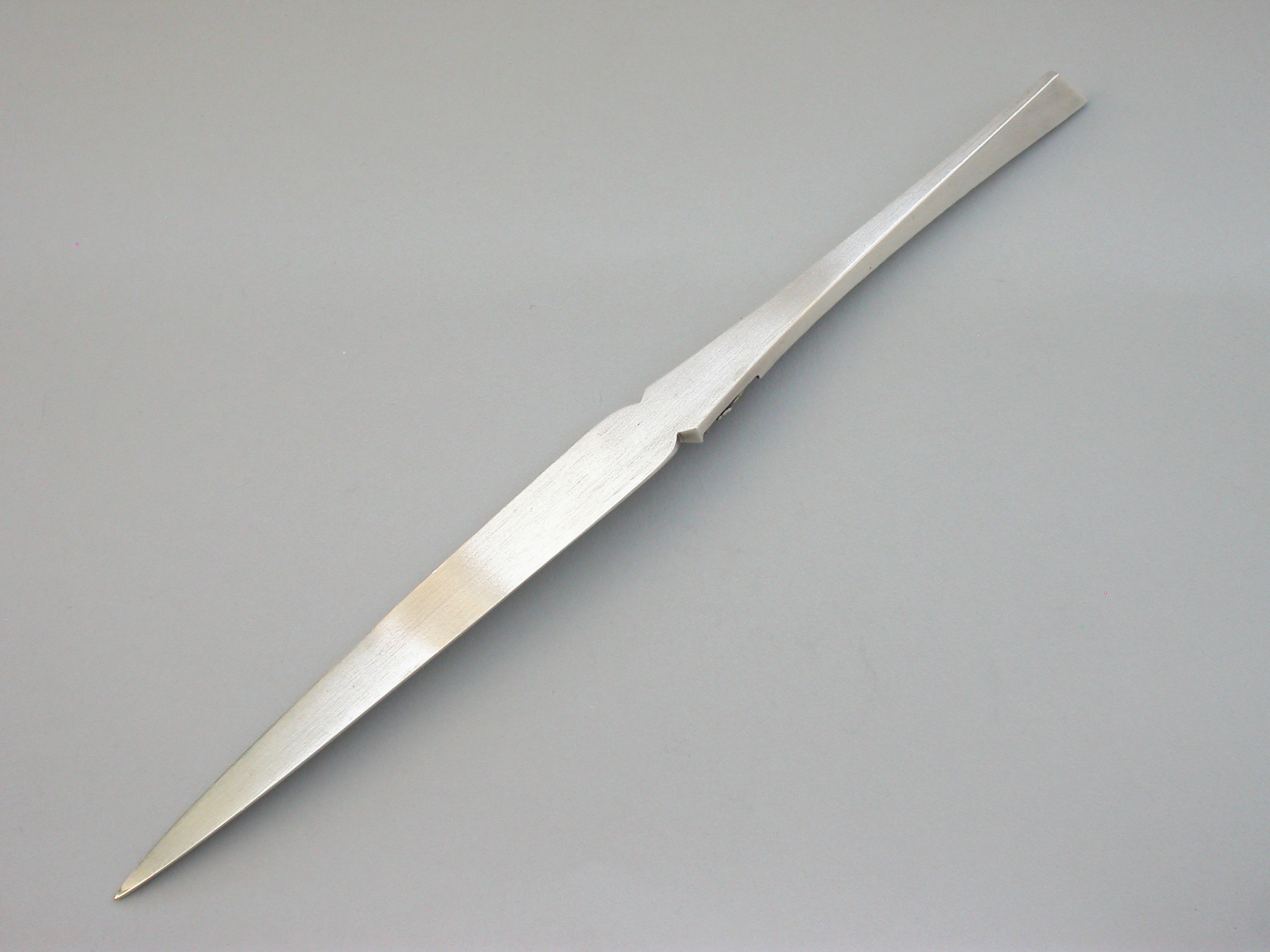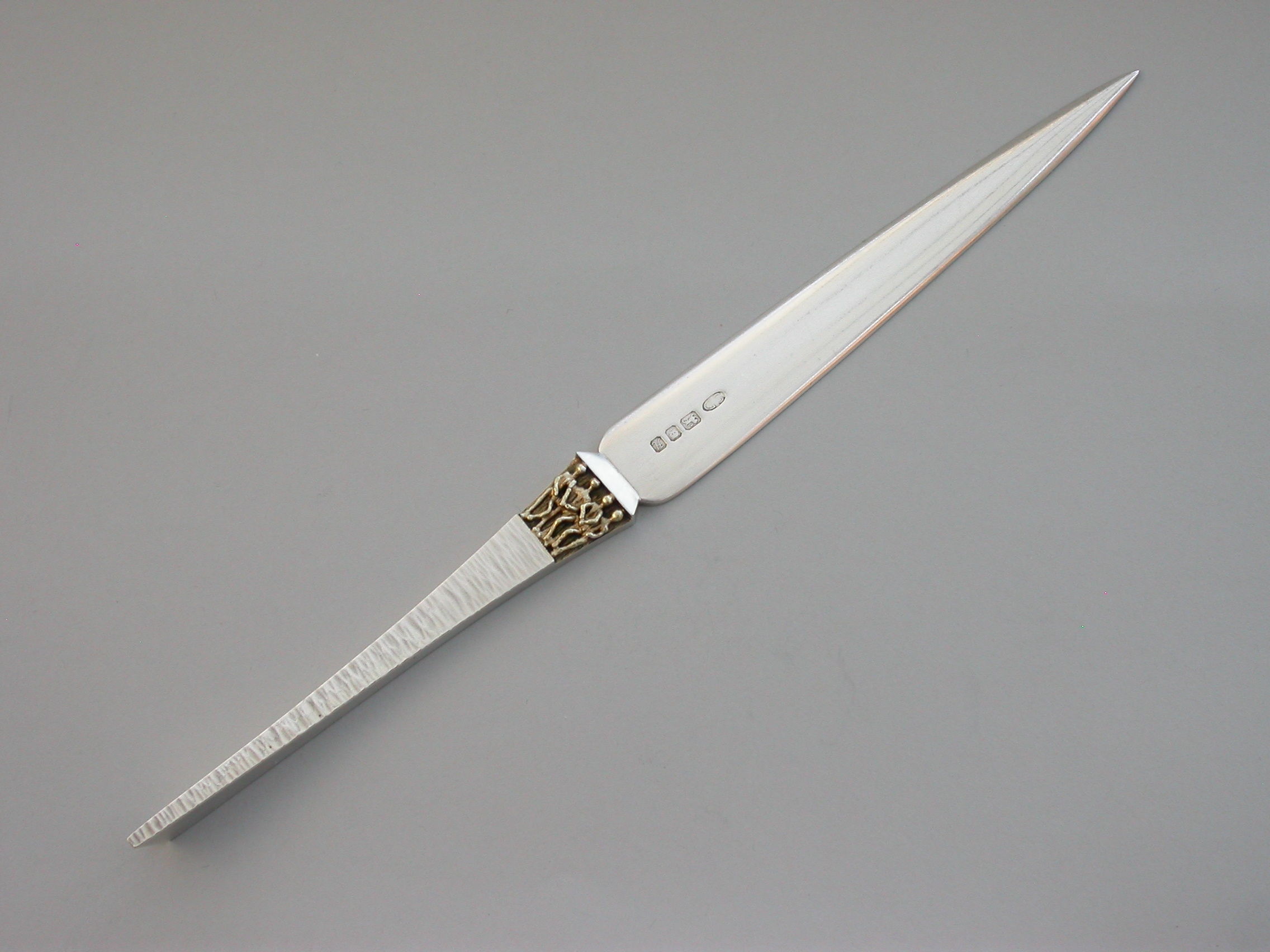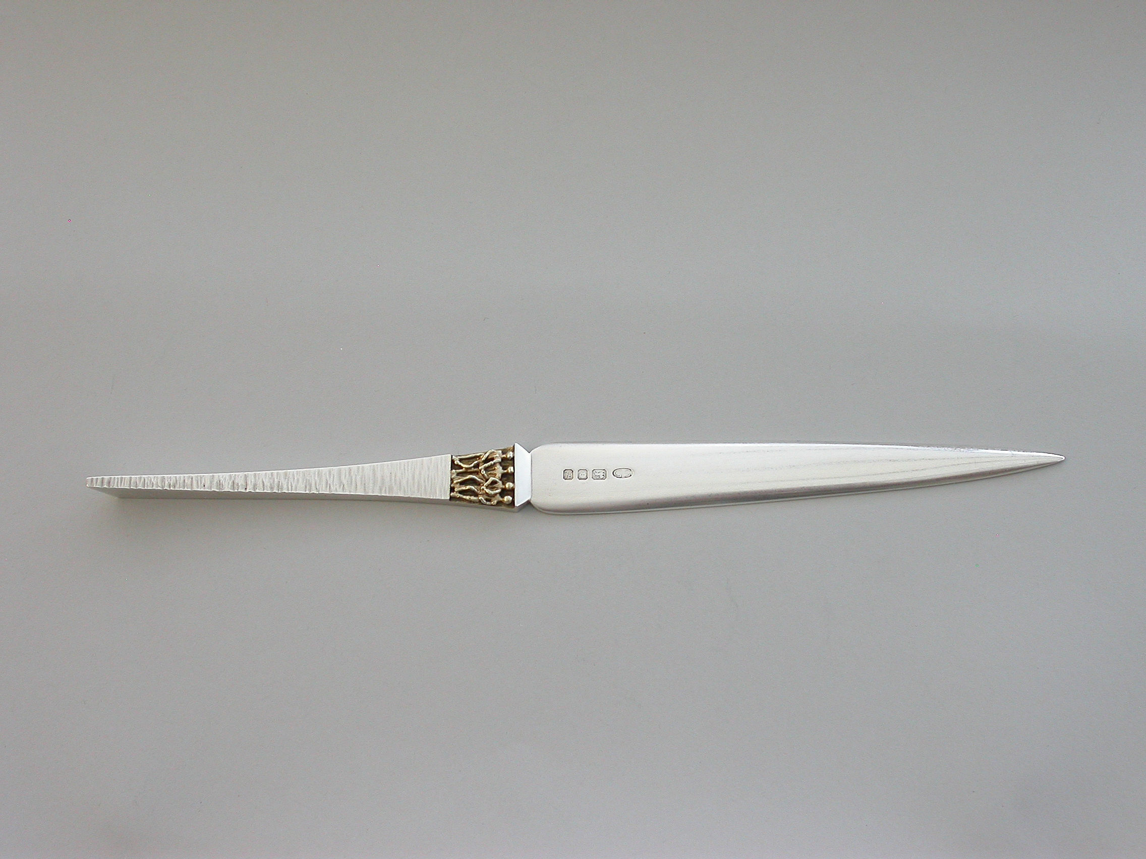 A fine quality post war silver Letter Opener with plain tapering blade and bark effect shaped handle, a gilded panel of naive figures at the hilt.