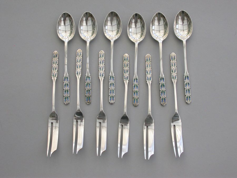 A good cased set of twelve silver and enamel Pastry Spoons and Forks, the handles decorated with a stylised fern pattern in blue and green enamels. Complete with original Liberty retailers case.