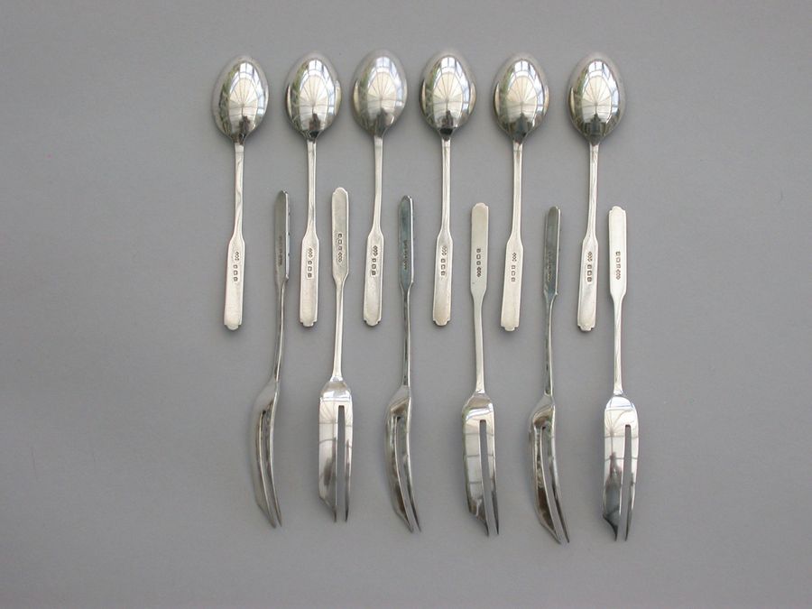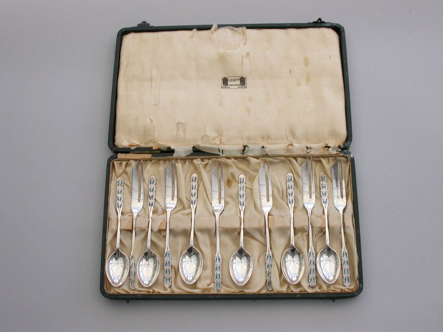 Cased Set 12 Silver & Enamel Pastry Spoons & Forks
