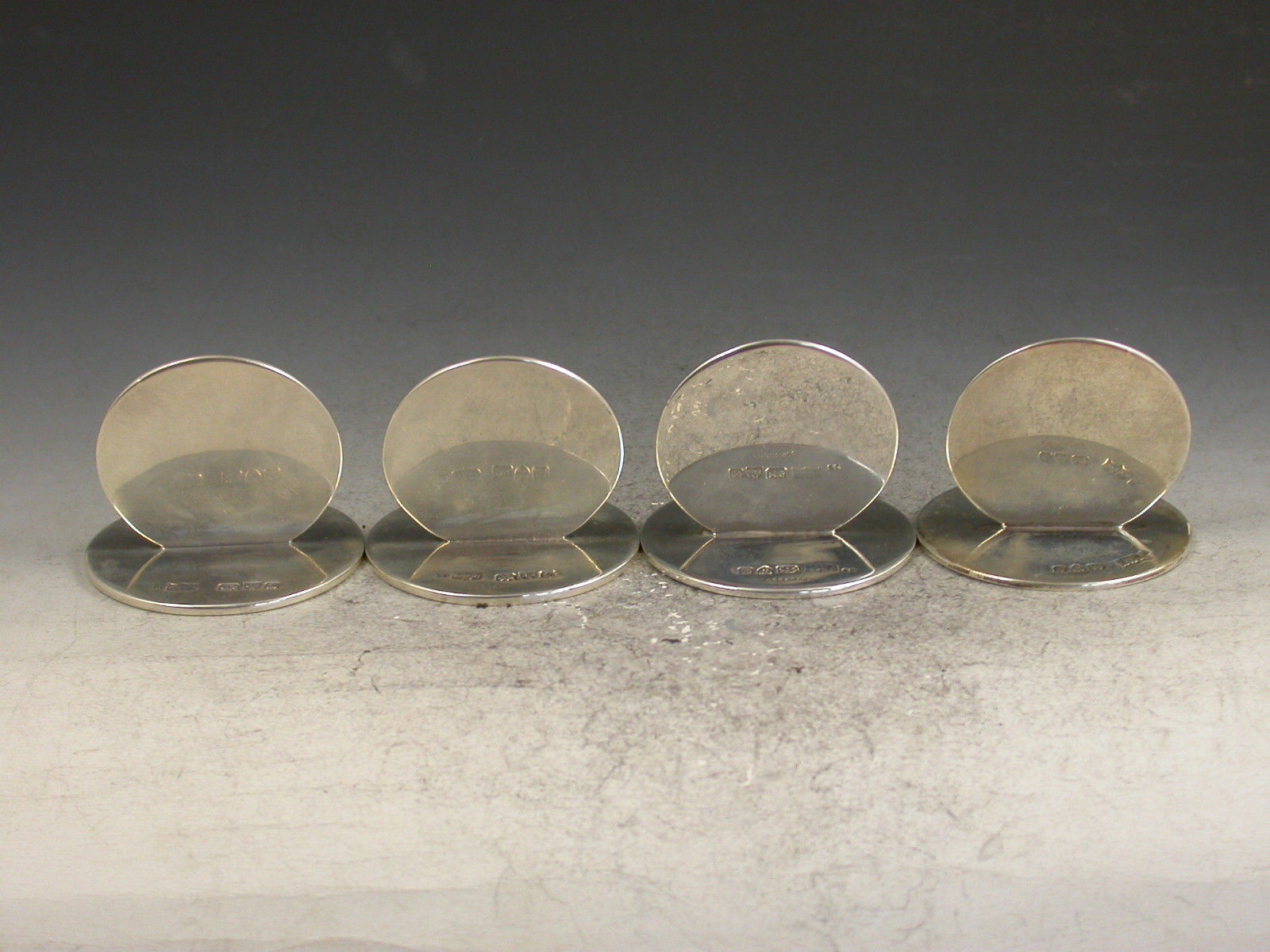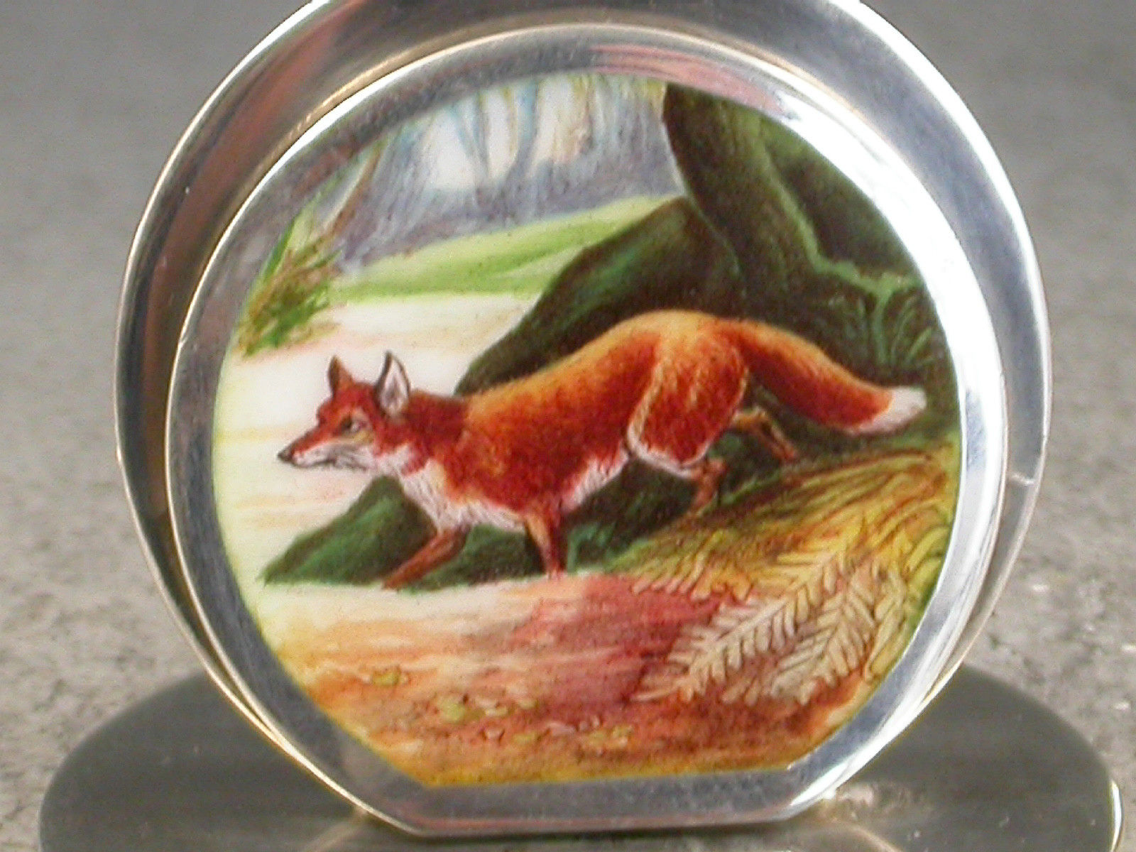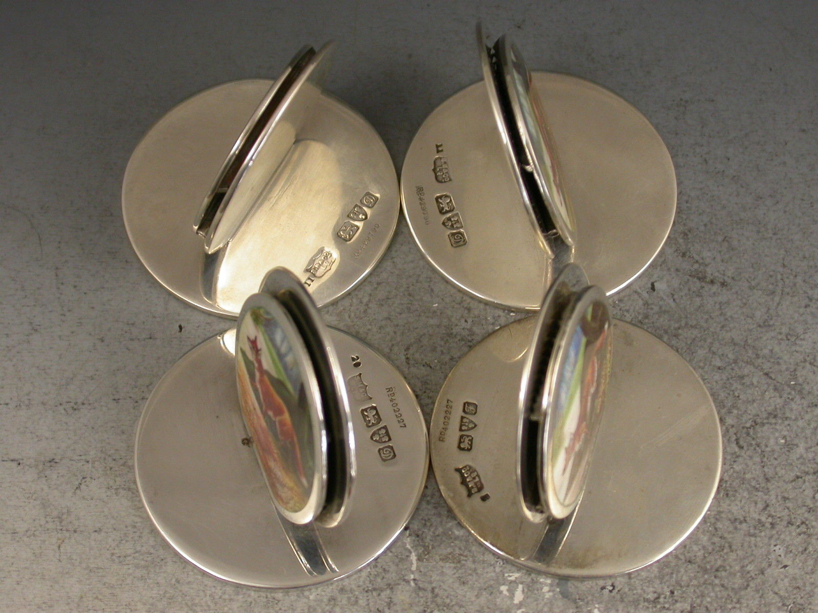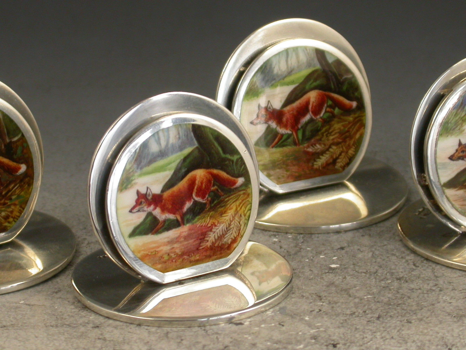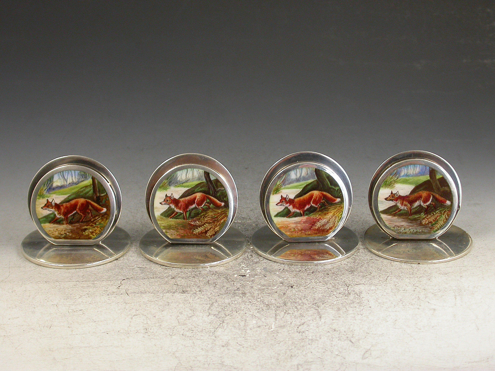 A fine and rare assembled set of four Edwardian silver and enamel Menu Holders of double-disc form on circular bases, the sprung circular front panels finely enamelled with foxes in woodland landscape scenes.
