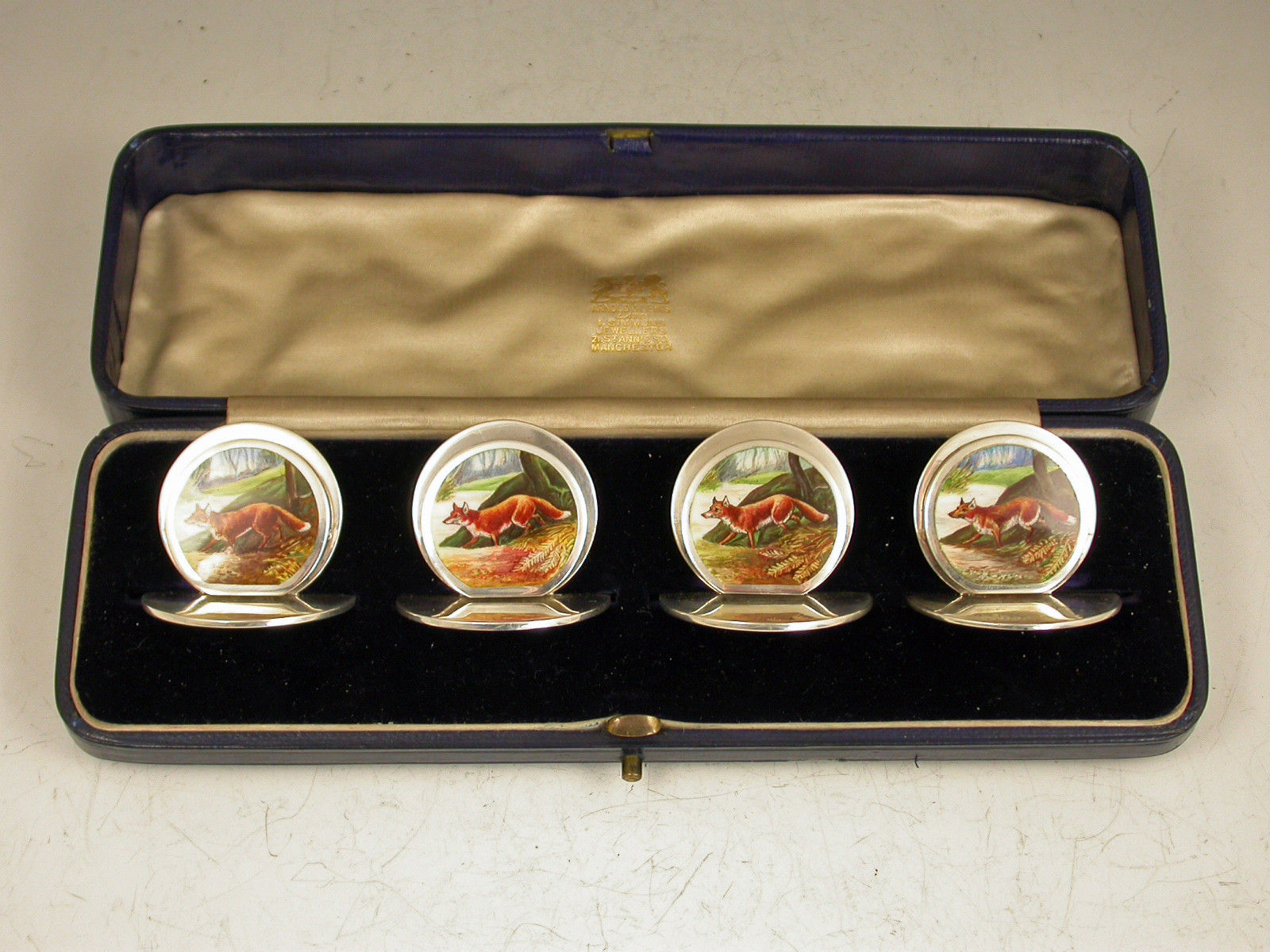 Cased Set 4 Edwardian Silver & Enamel 'Fox' Menu Holders