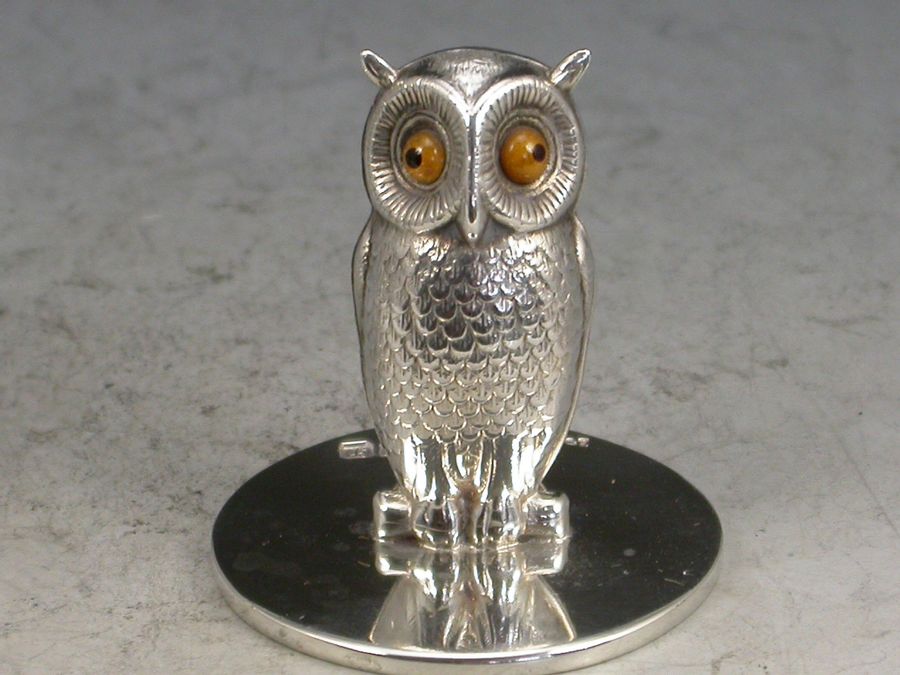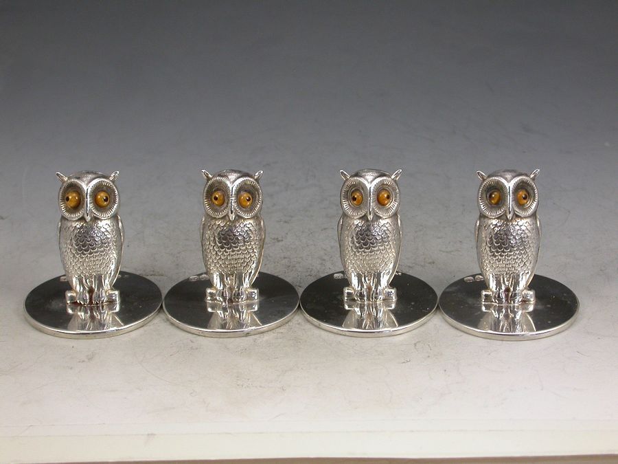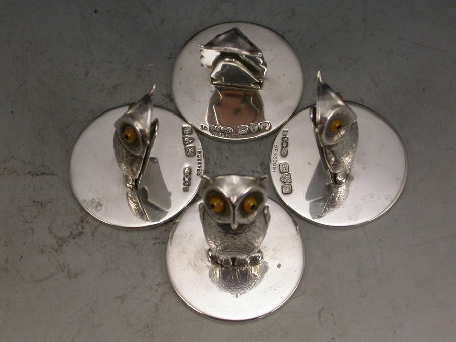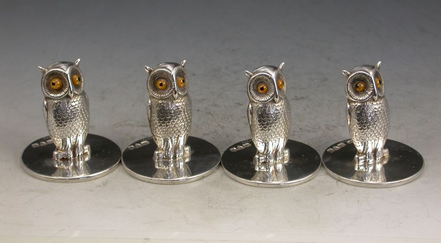 Cased Set 4 Edwardian Silver Owl Menu Holders
