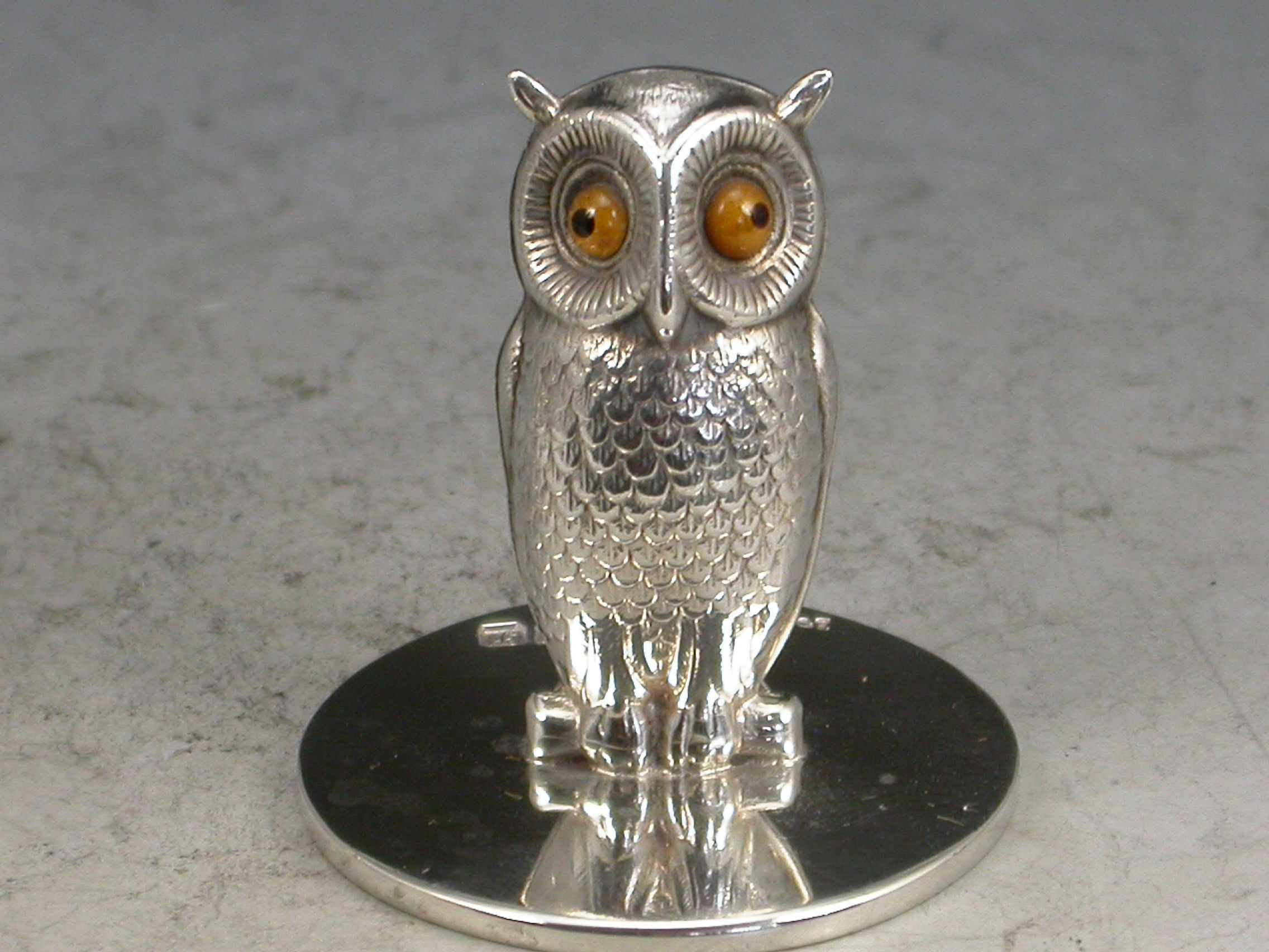 A cased set of four early 20th century Edwardian silver Menu Holders formed as Owls standing on perches, with amber glass eyes and flat circular bases.
