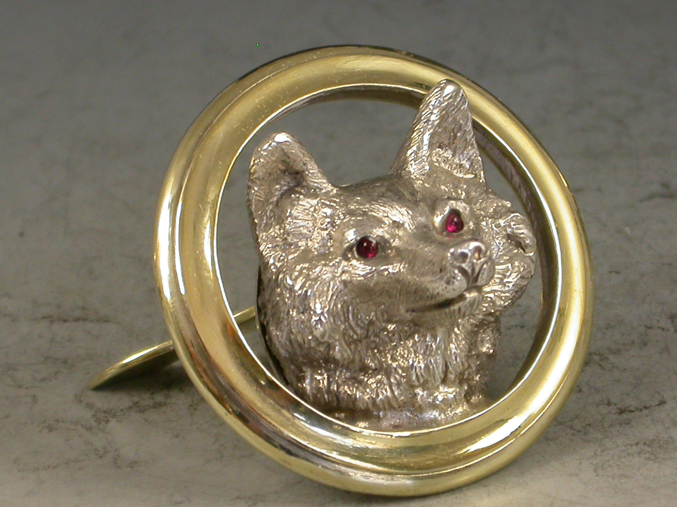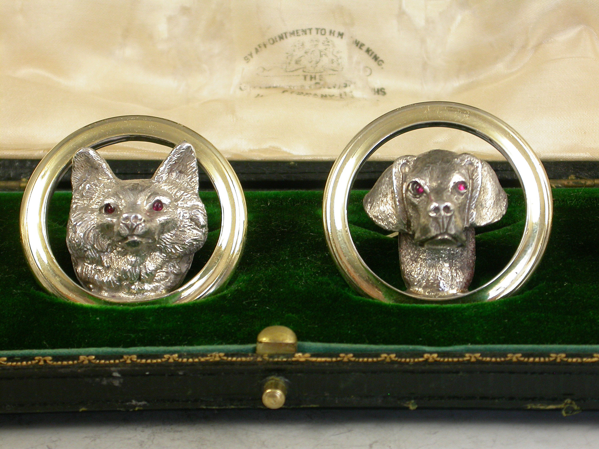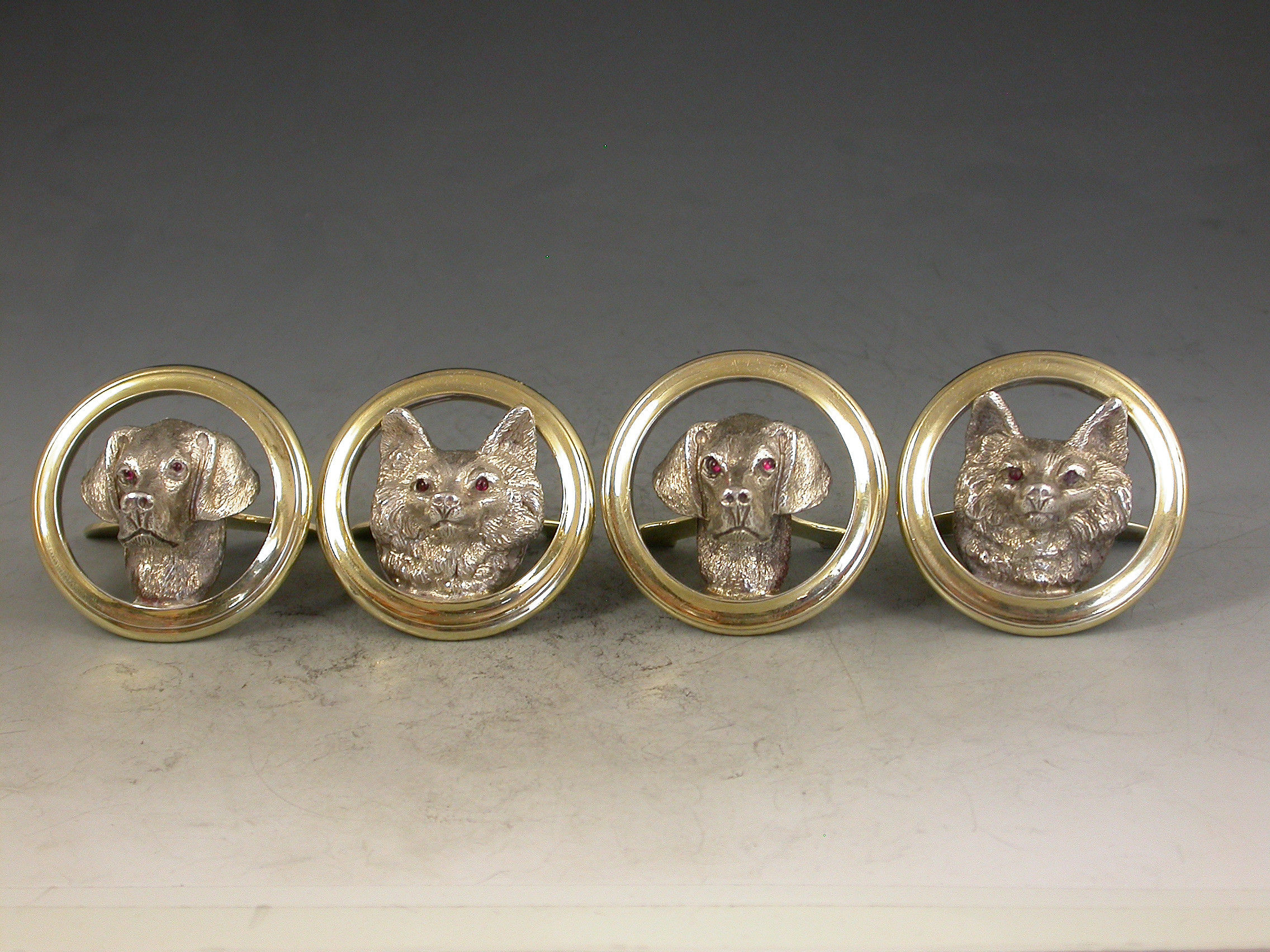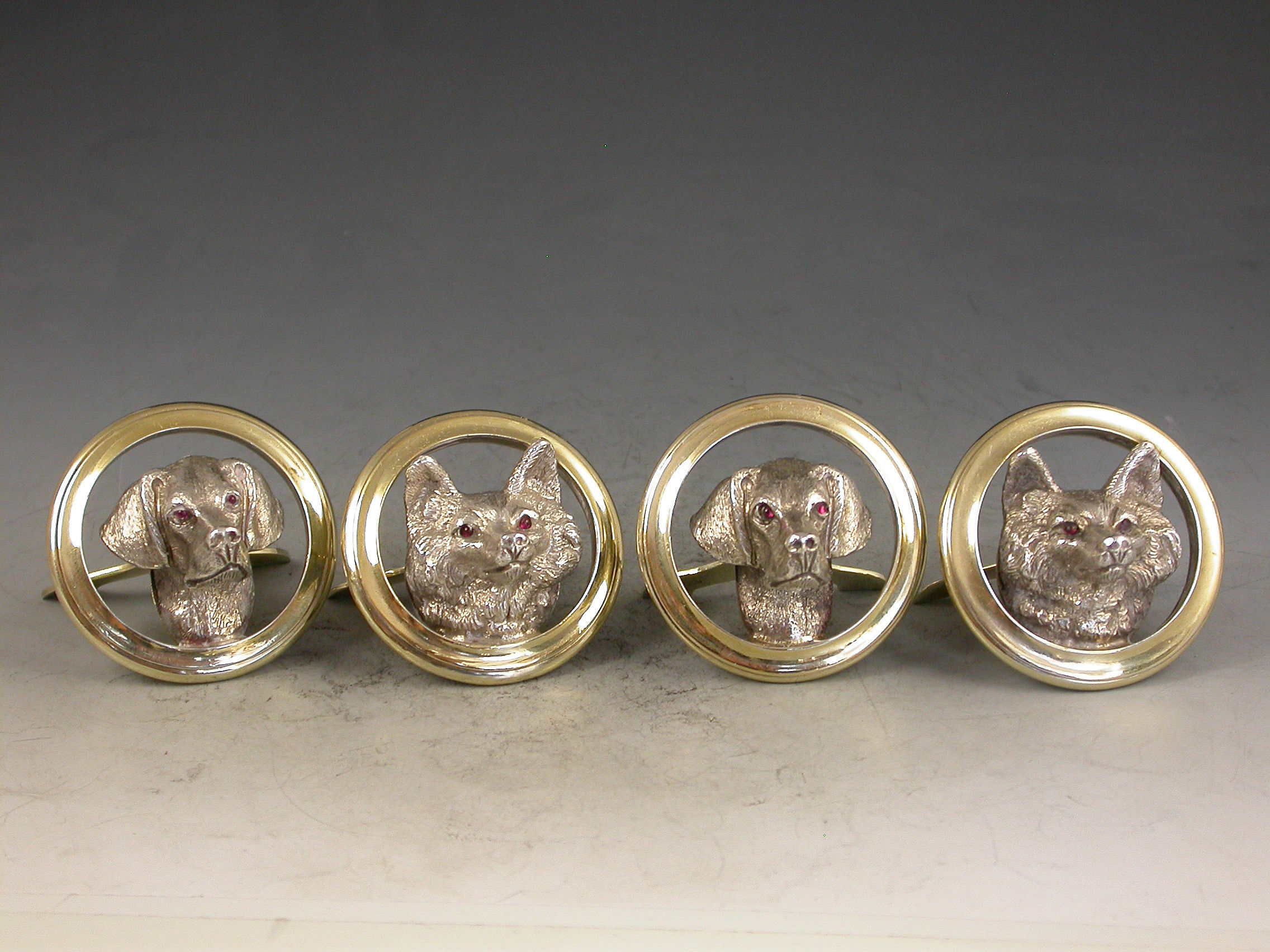 A superb quality cased set of four George V novelty silver and gilt Menu Holders, two cast as fox heads and two cast as hounds heads, within circular gilded frames with hinged stands. Complete with ruby glass eyes and original fitted green leather case.