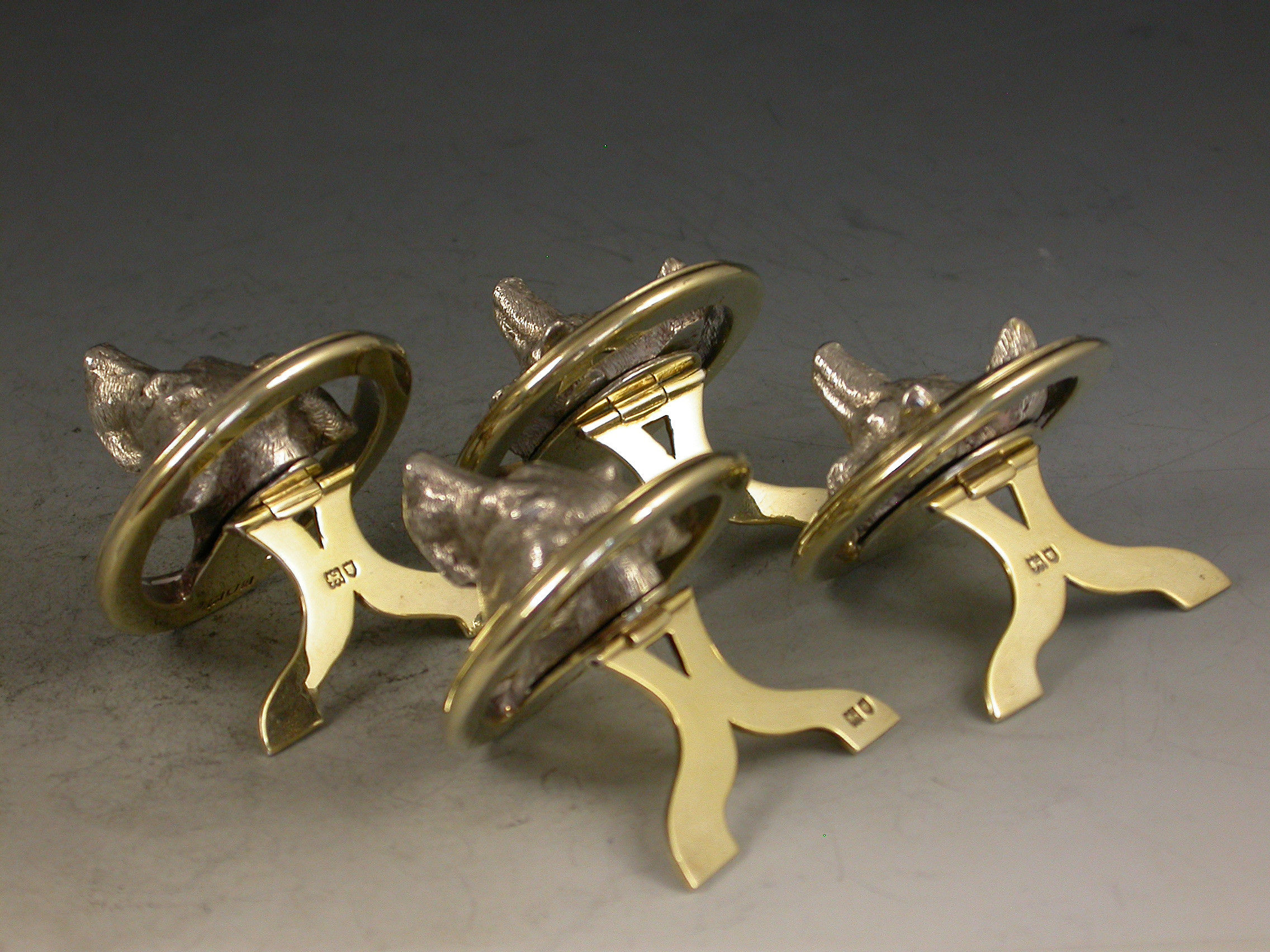 Cased Set 4 George V Cast Silver & Gilt Fox & Hound Menu Holders