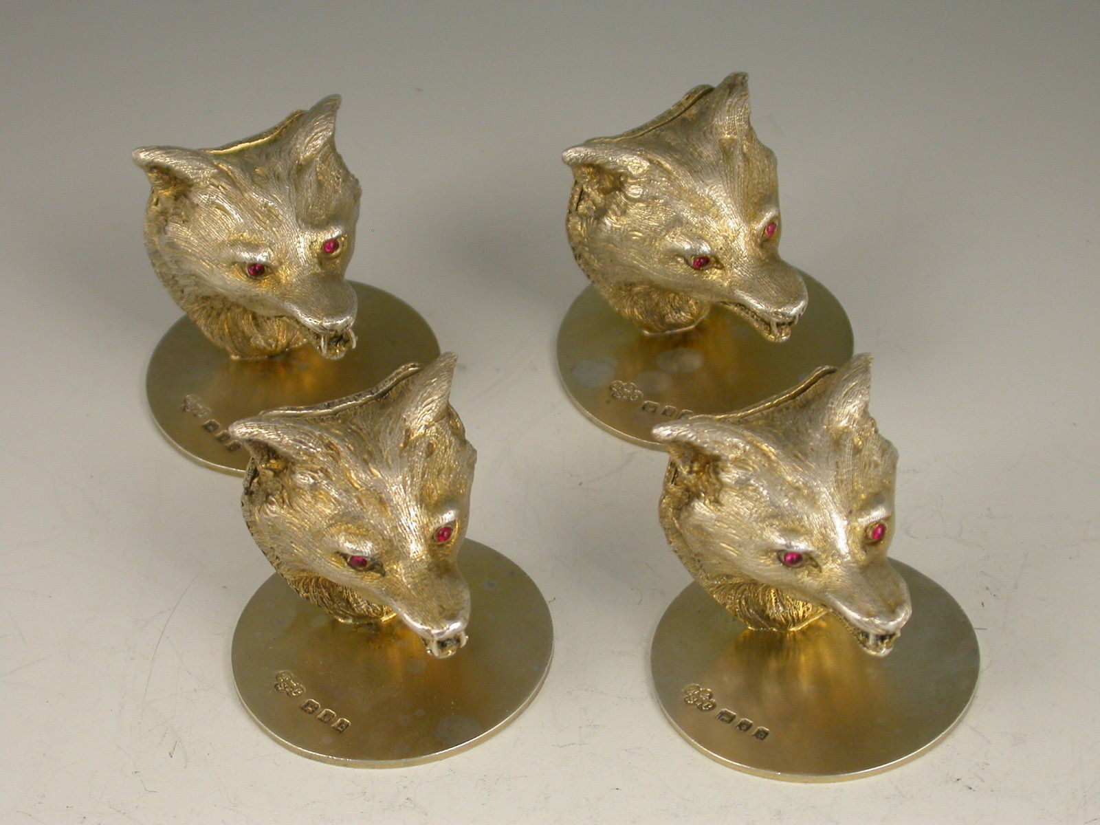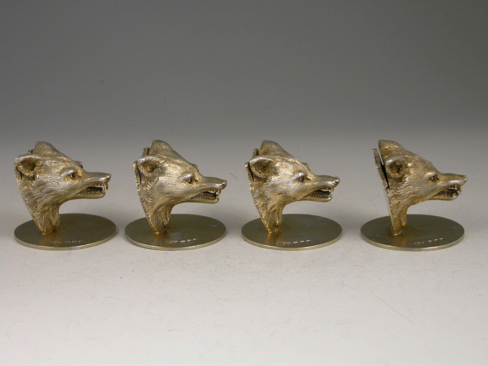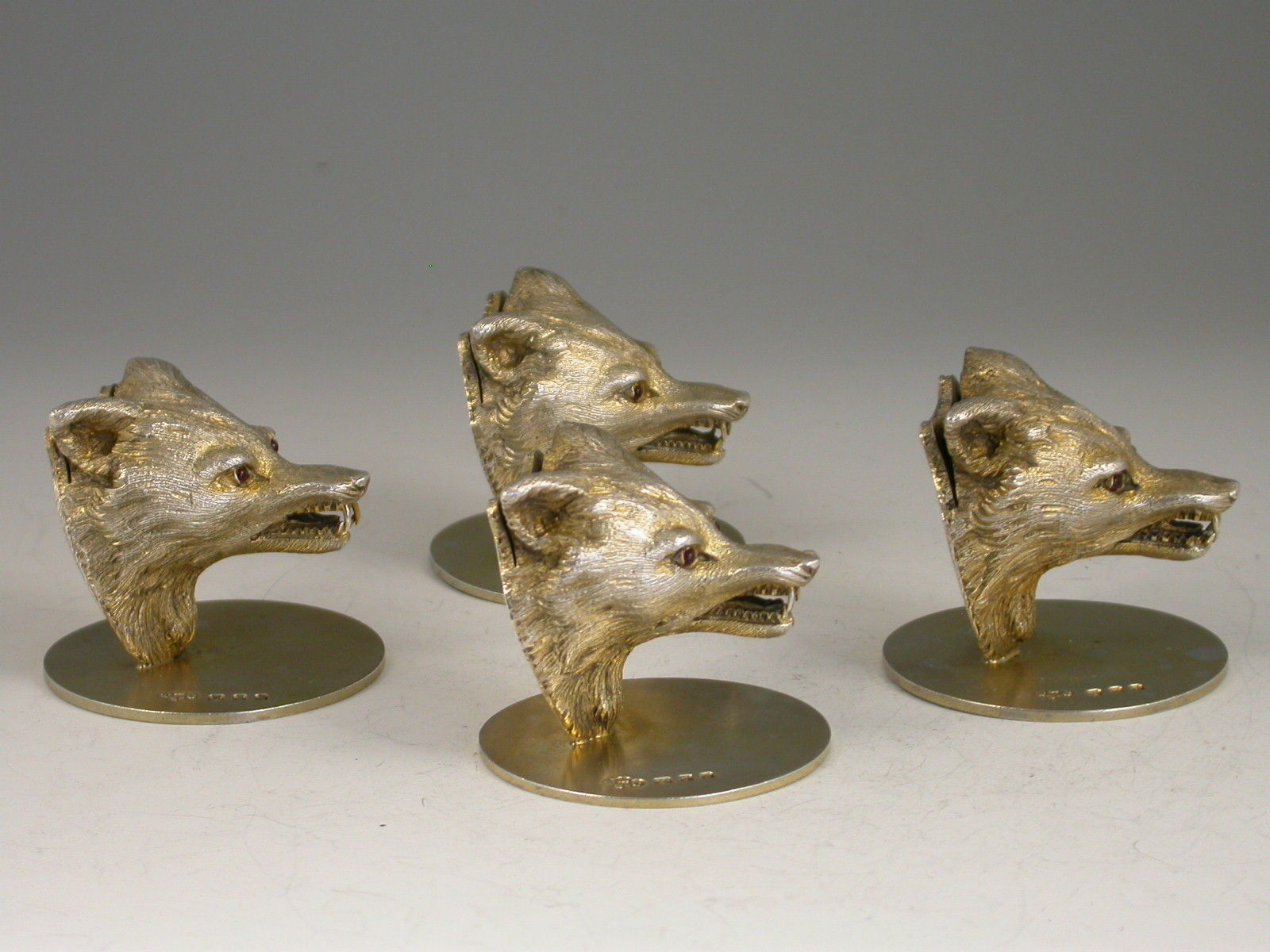 A very fine quality cased set of four George V cast silver gilt Menu Holders, made in the form of Foxes Heads with ruby glass eyes, on circular bases. Complete with associated silk and velvet lined leather case.