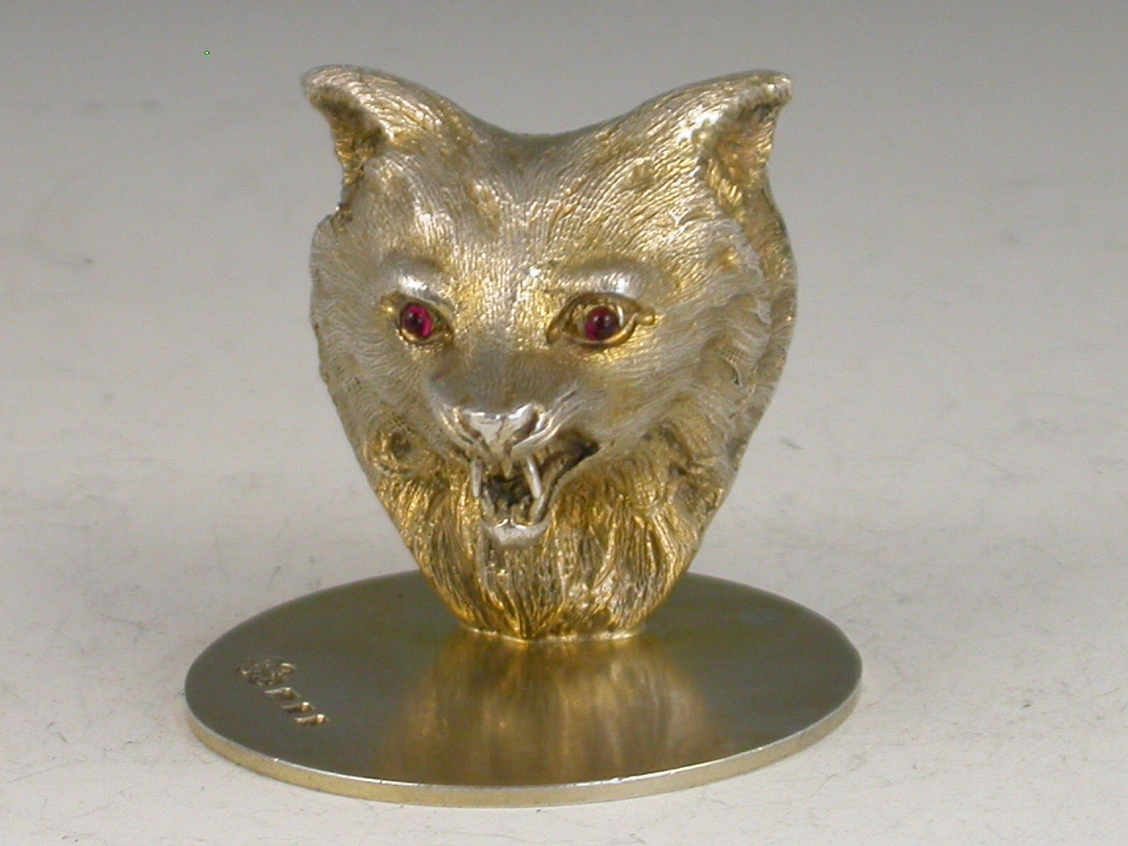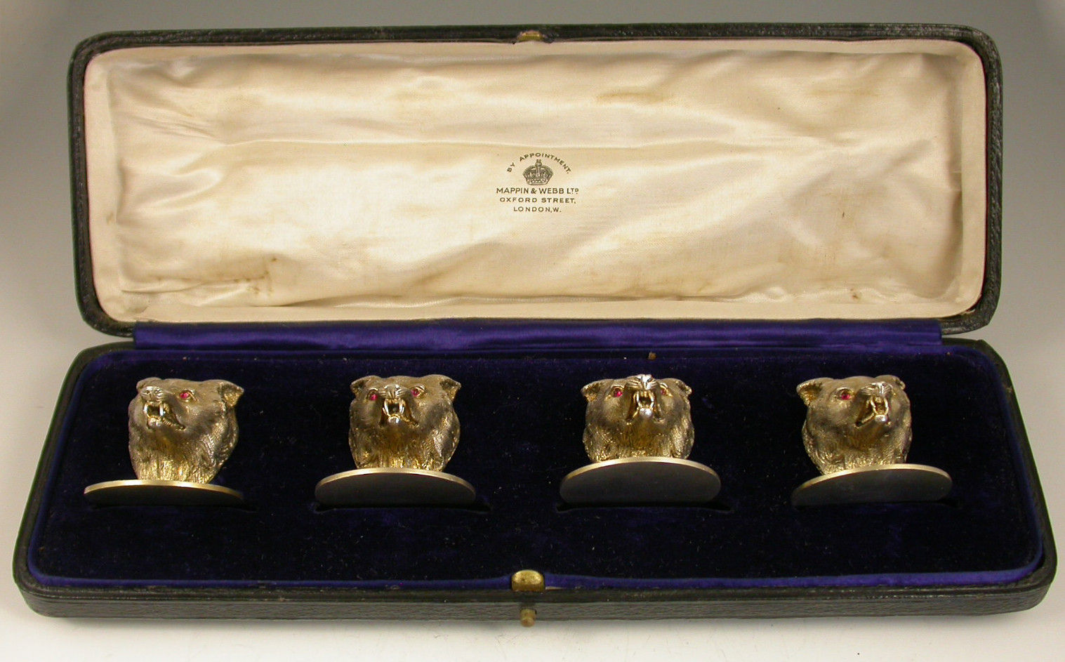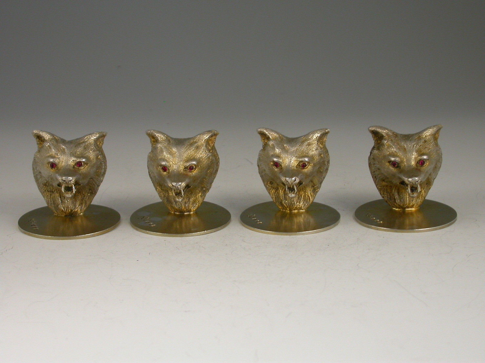 A very fine quality cased set of four George V cast silver gilt Menu Holders, made in the form of Foxes Heads with ruby glass eyes, on circular bases. Complete with associated silk and velvet lined leather case.