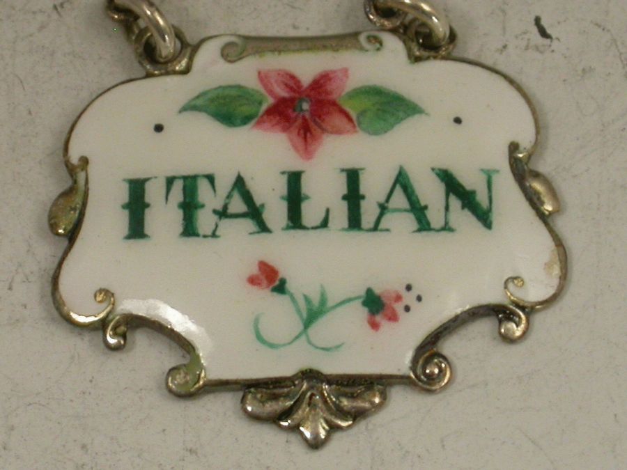 a good quality cased set of four mid 20th century cast silver and hand painted enamel Wine Labels, of cartouche shape with scrolled borders, titled for Brandy, Gin, French and Italian. Complete with associated leather case.