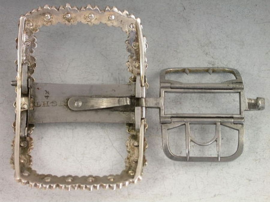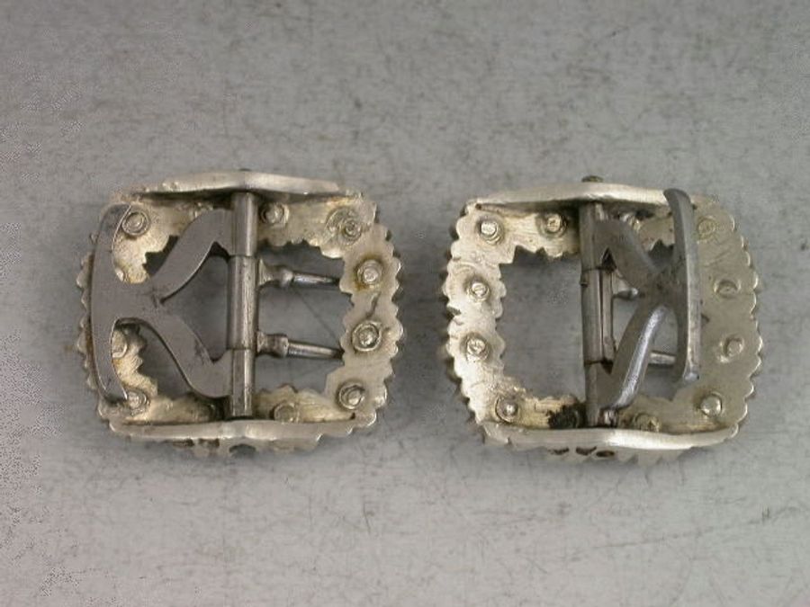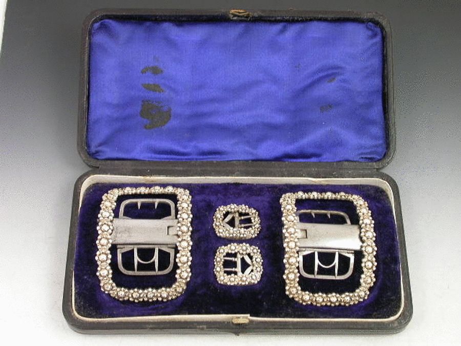 A superb Cased set of 4 George III silver and steel Shoe Buckles with matching Breeches Buckles, formed from rows of interlocking flower heads, the Shoe Buckles with sprung steel opening mechanisms and stamped Left & Right.