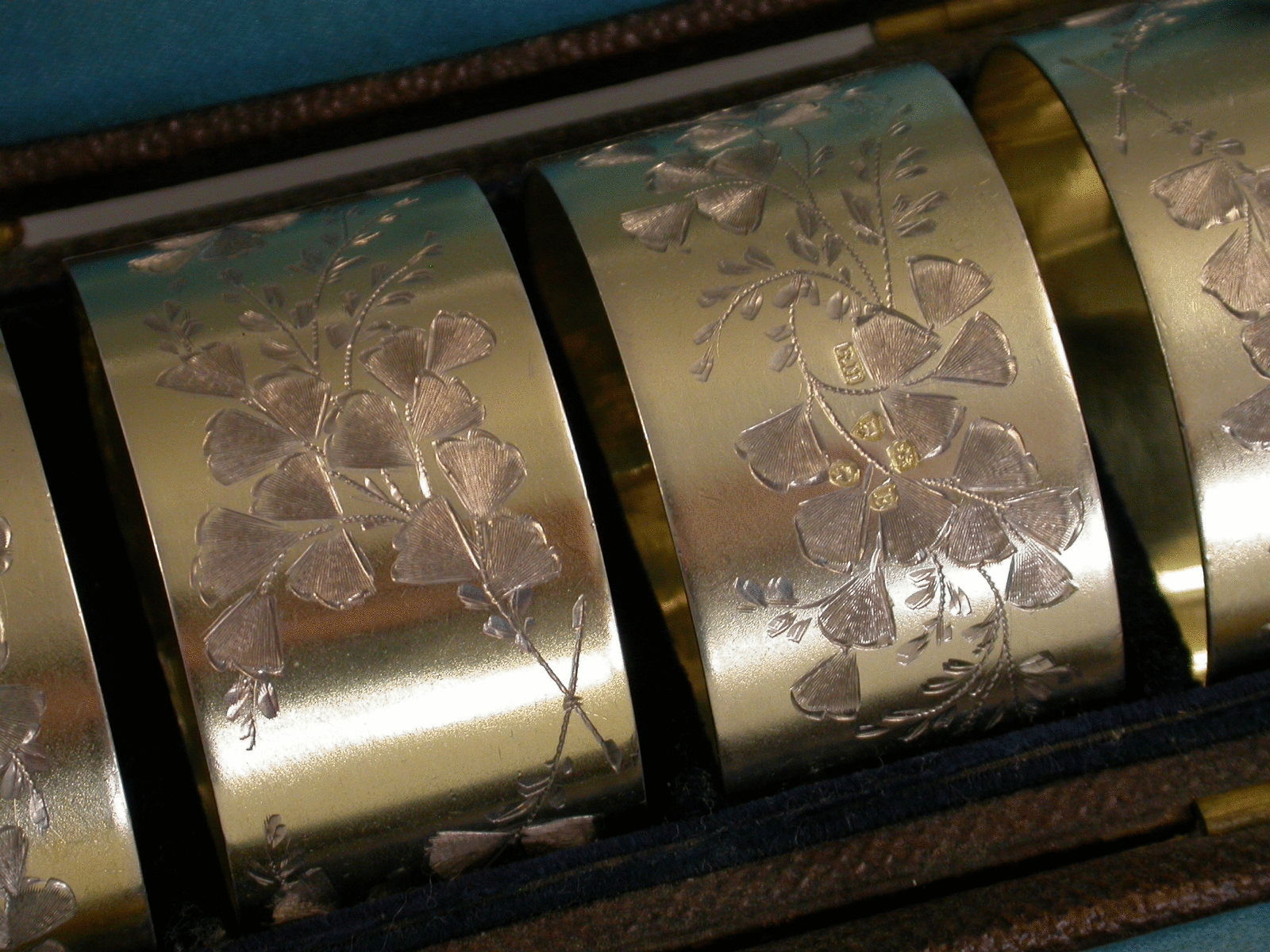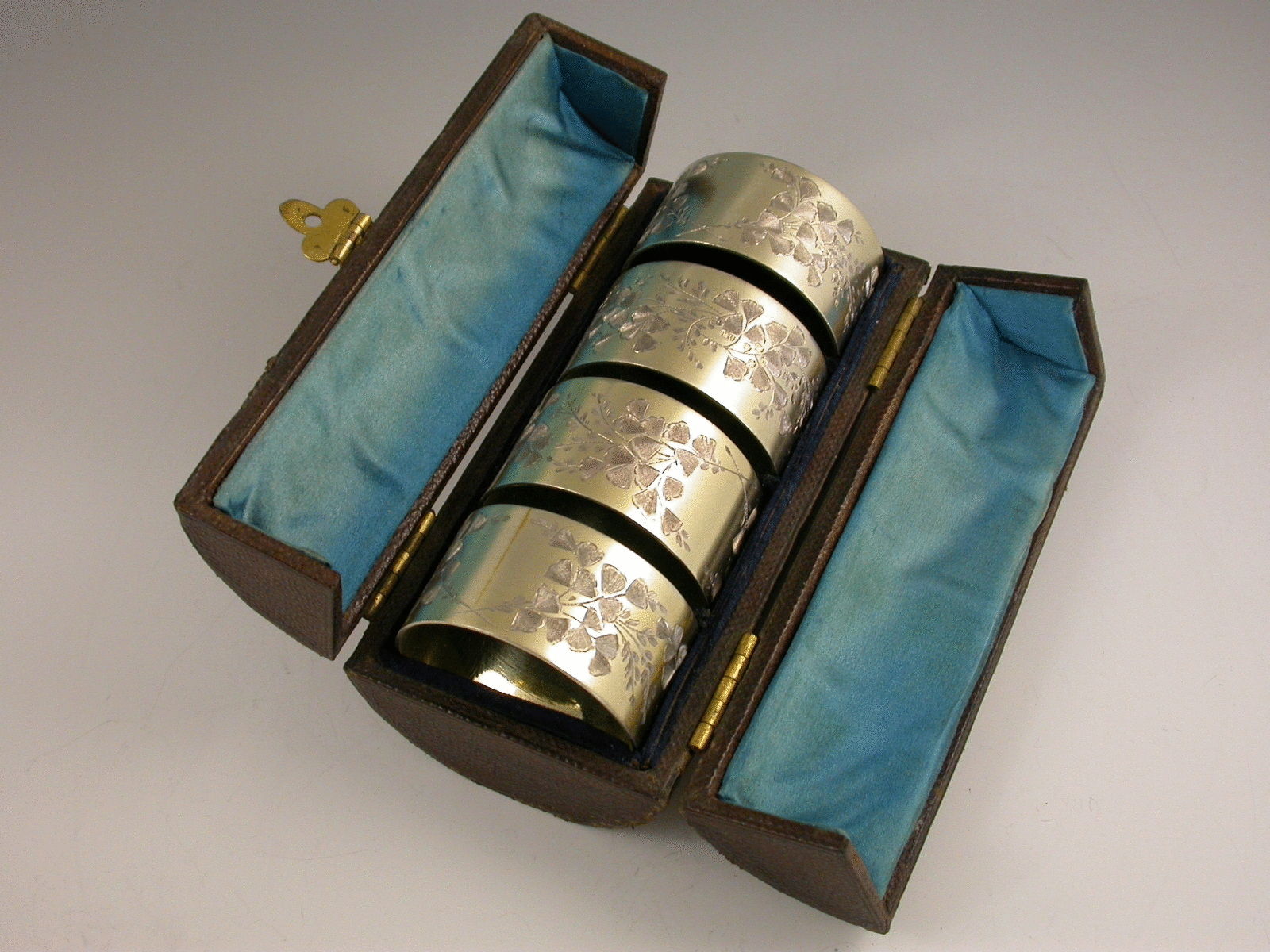 A very fine set of four Victorian parcel gilt Napkin Rings with finely engraved ivy leaf decoration, vacant cartouches free from monograms or initials. Complete with original silk and velvet lined tubular leather case.