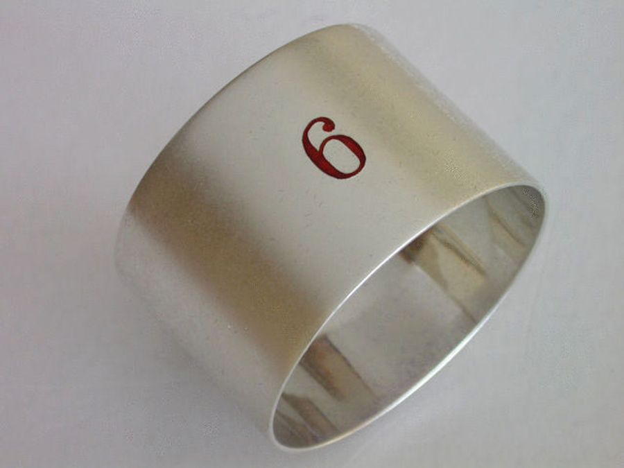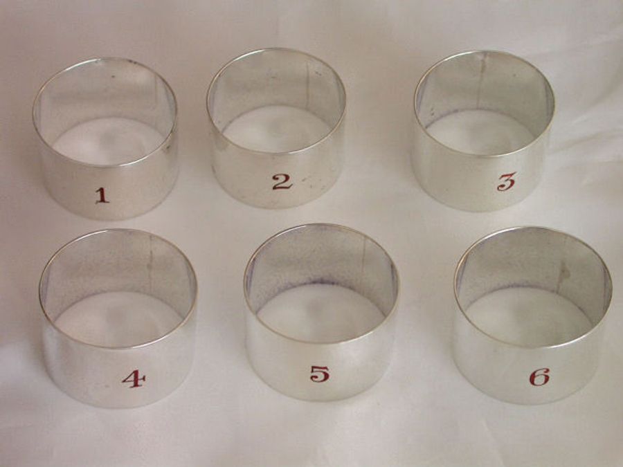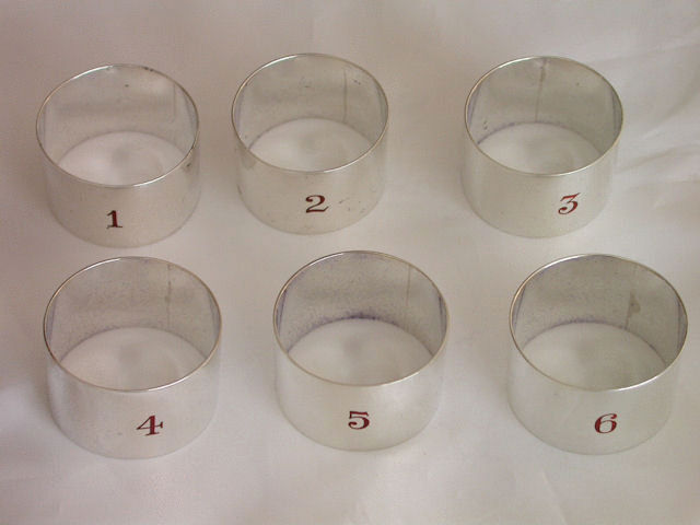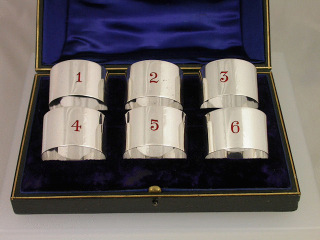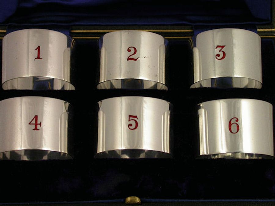 A fine quality set of six early 20th century silver Napkin Rings, of perfectly plain circular form with inset crimson enamel numbers from 1-6. Complete with original royal blue silk and velvet lined Morocco leather case.