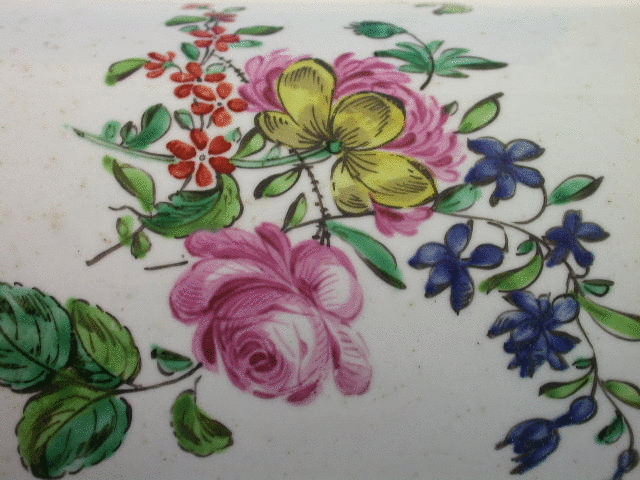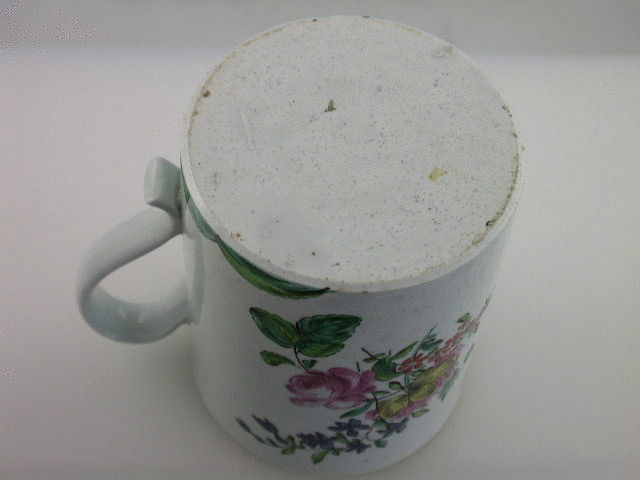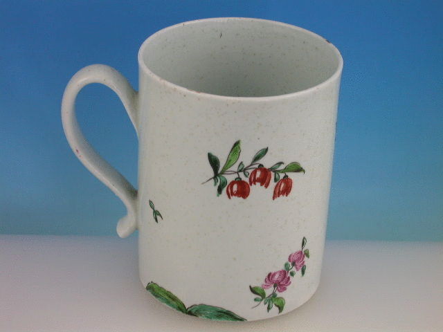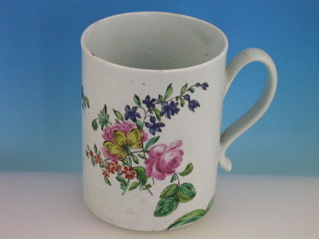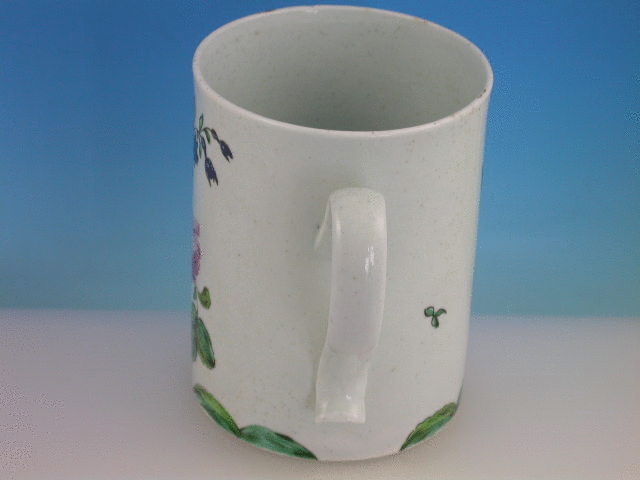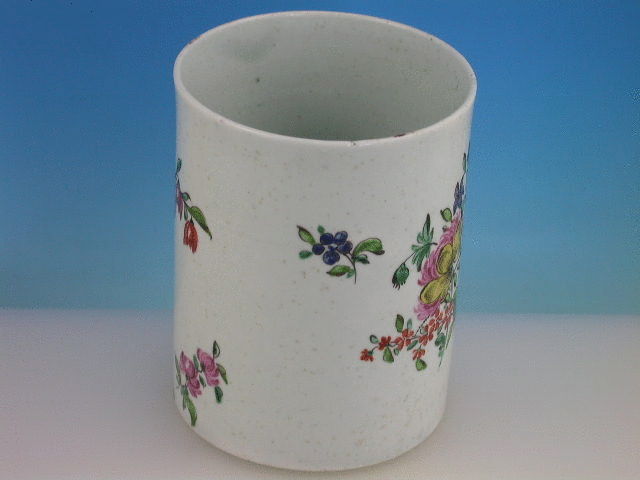 A fine Richard Chaffers Liverpoool cylindrical Mug with solid strap handle with kick terminal, painted in polychrome enamels with bouquets and sprays of English flowers in a bright palette. c1760.