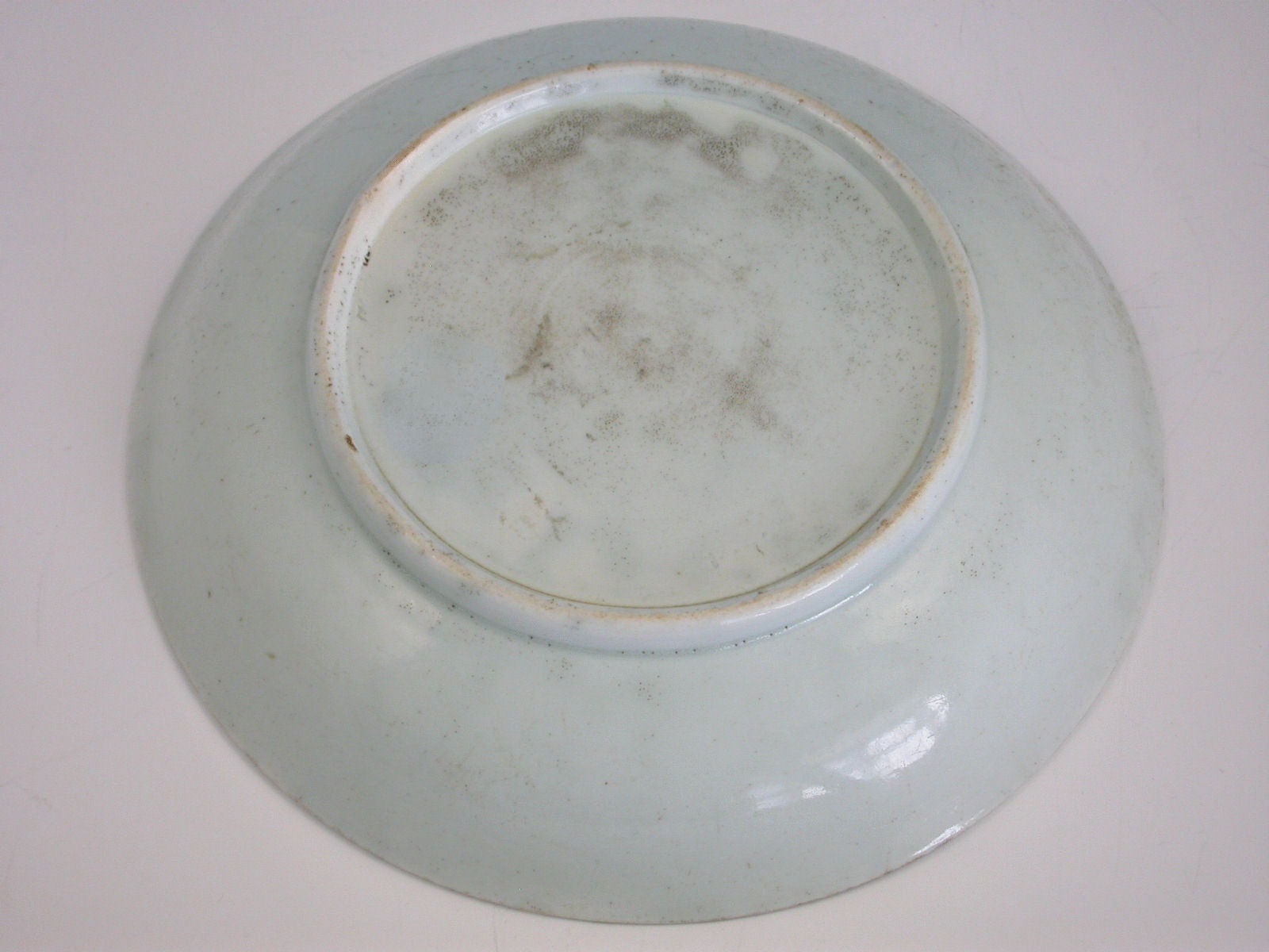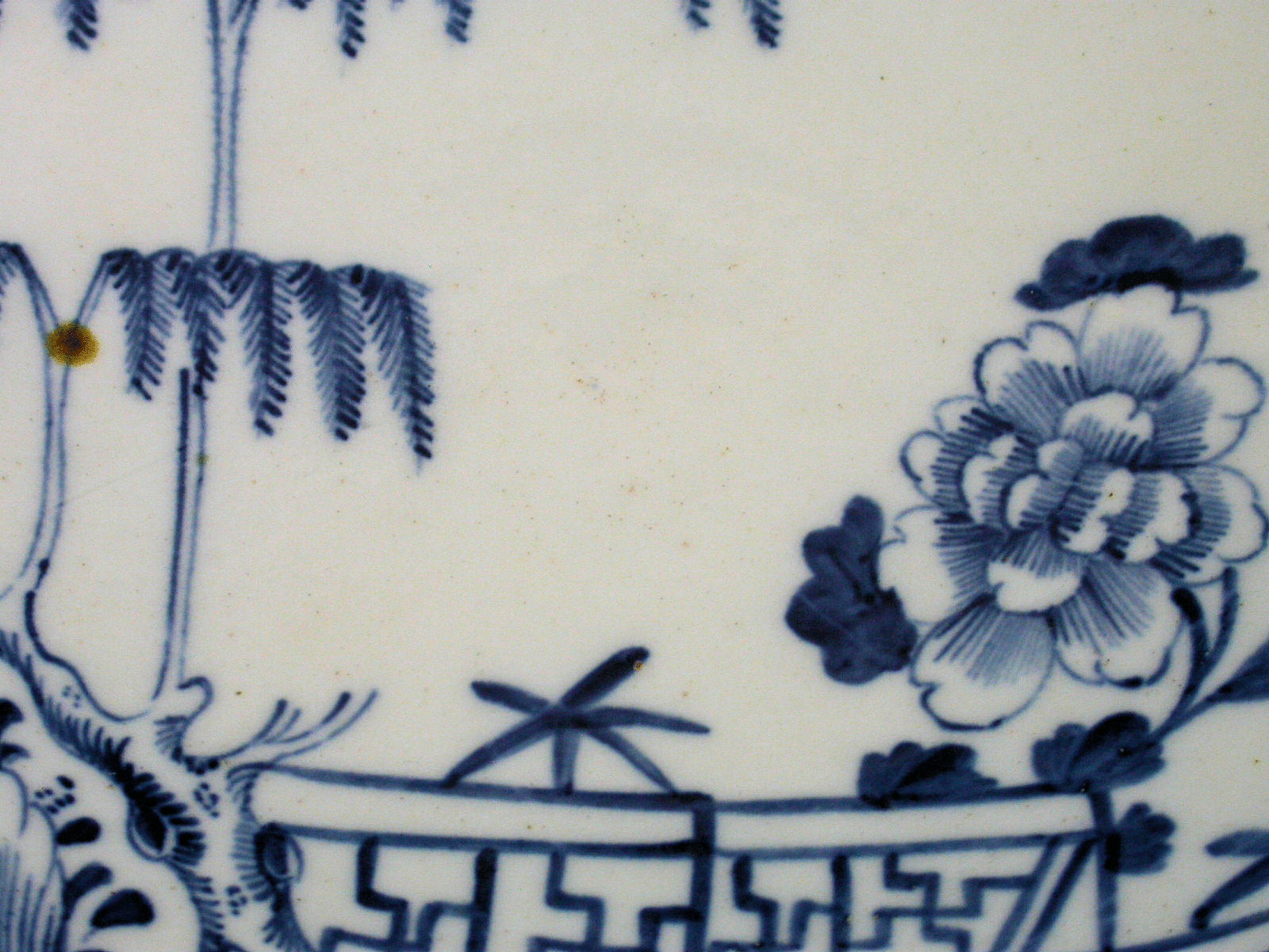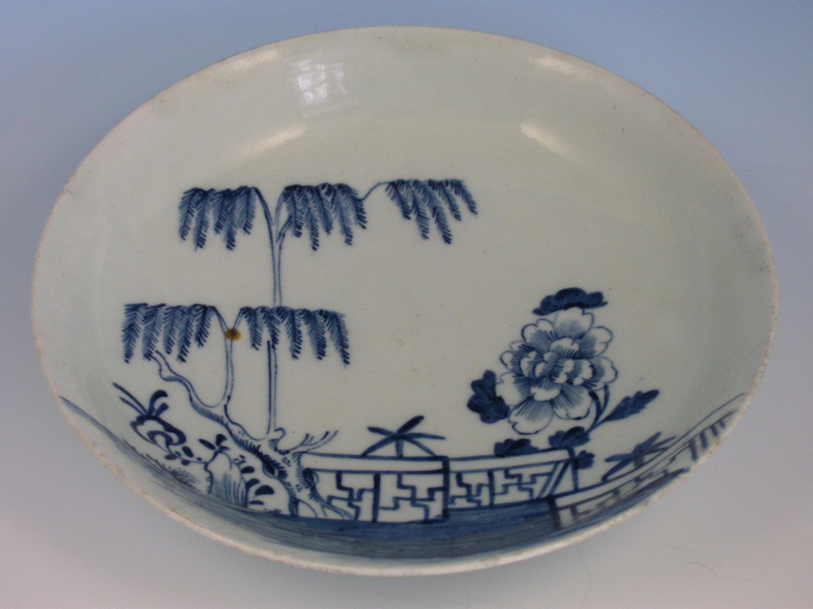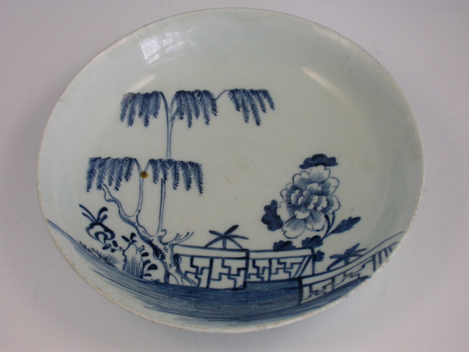 A rare Richard Chaffers of Liverpool Saucer Dish of circular dished form, painted in under glaze blue with an oriental garden scene, depicting a fenced garden, a knarled tree to one side and a large peony issuing from the ground.